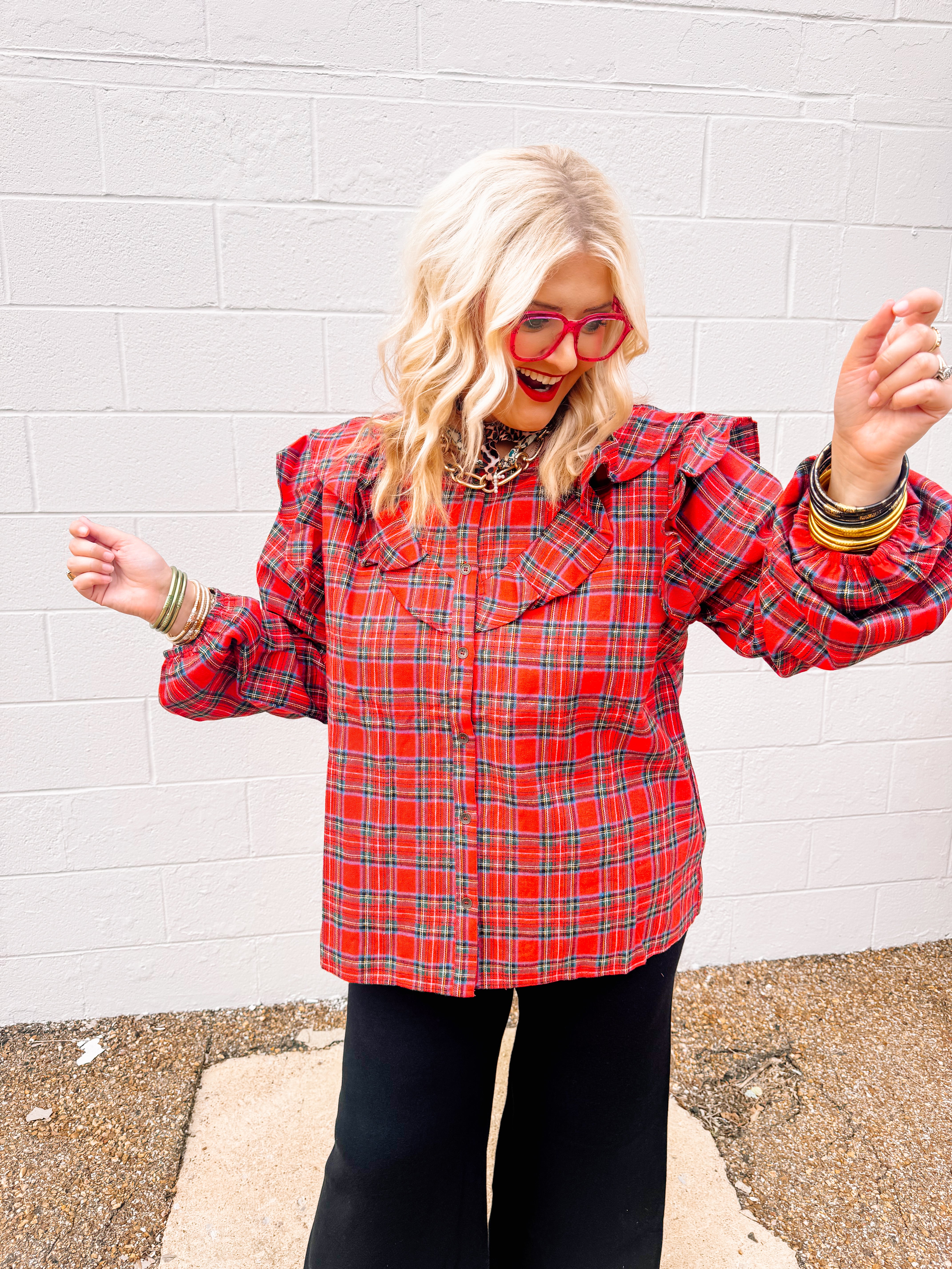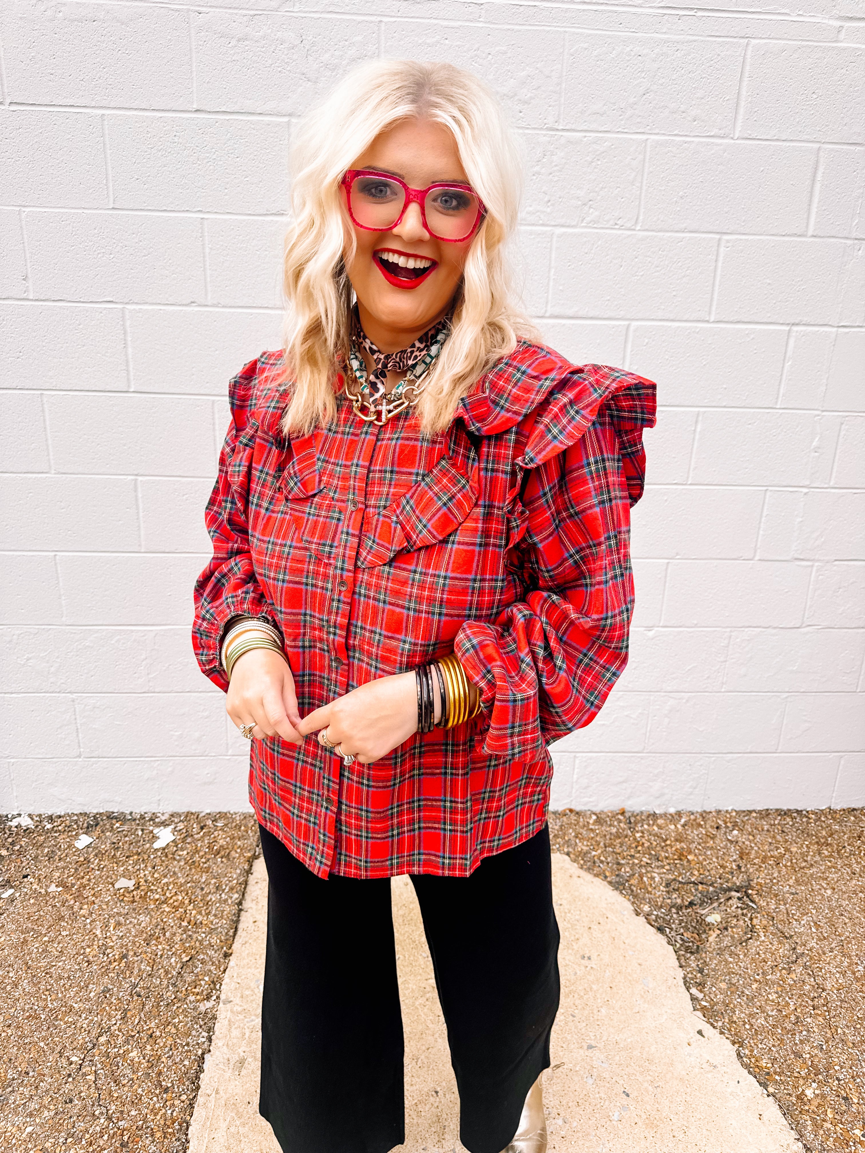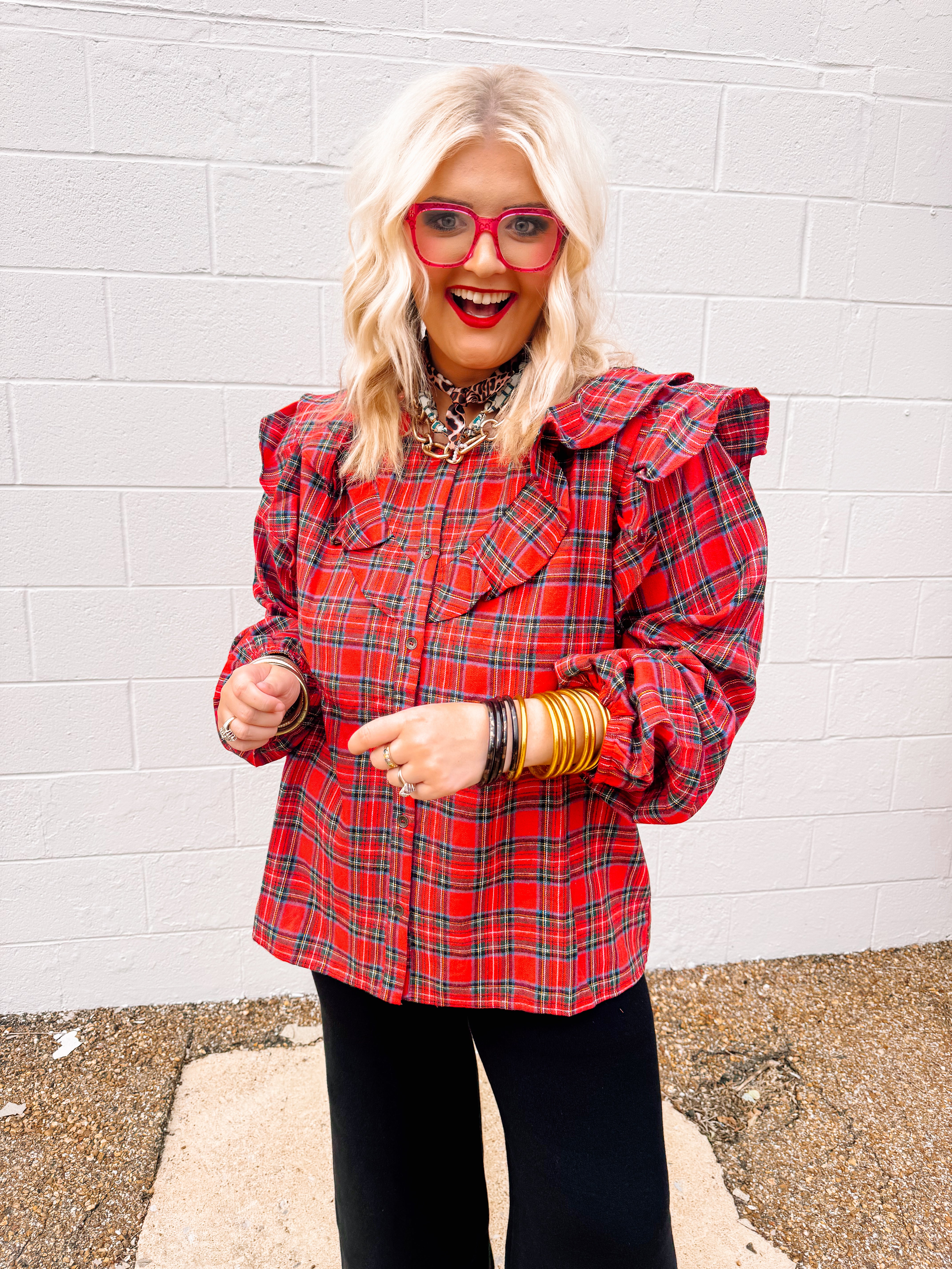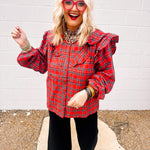 The Oddi Plaid Seasons Top in red features a classic plaid button-front design complemented by a layered ruffle yoke for a sophisticated touch. Its long sleeves provide versatile coverage, making it ideal for transitional weather. Crafted to balance style and comfort, this blouse effortlessly elevates any wardrobe with timeless patterning and refined detailing.
