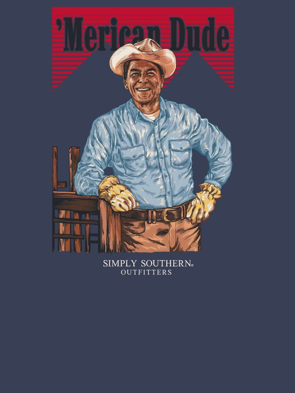 Mirage blue long sleeve shirt with the phrase ''Merican Dude' and a cowboy propped against a fence post. Simply Southern logo below. Similar design on left chest. 100% cotton. Unisex sizing.