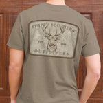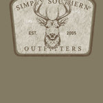 Dark heather brown short sleeve shirt with a buck and the Simply Southern logo. Similar design on left chest. 52% cotton / 48% polyester blend.