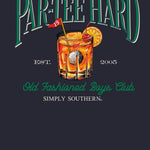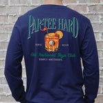 Dark blue long sleeve shirt with the phrases 'Par-tee Hard' and 'Old Fashioned Boys Club'. There is a drink with a golf ball and mini flagstick inside. Simply Southern logo below. Similar design on left chest. 100% cotton. Unisex sizing.