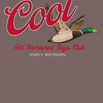 Mocha long sleeve shirt with the phrases 'Original Cool' and 'Old Fashioned Boys Club' and a duck flying. Simply Southern logo below and on left chest. 100% cotton. Unisex sizing.