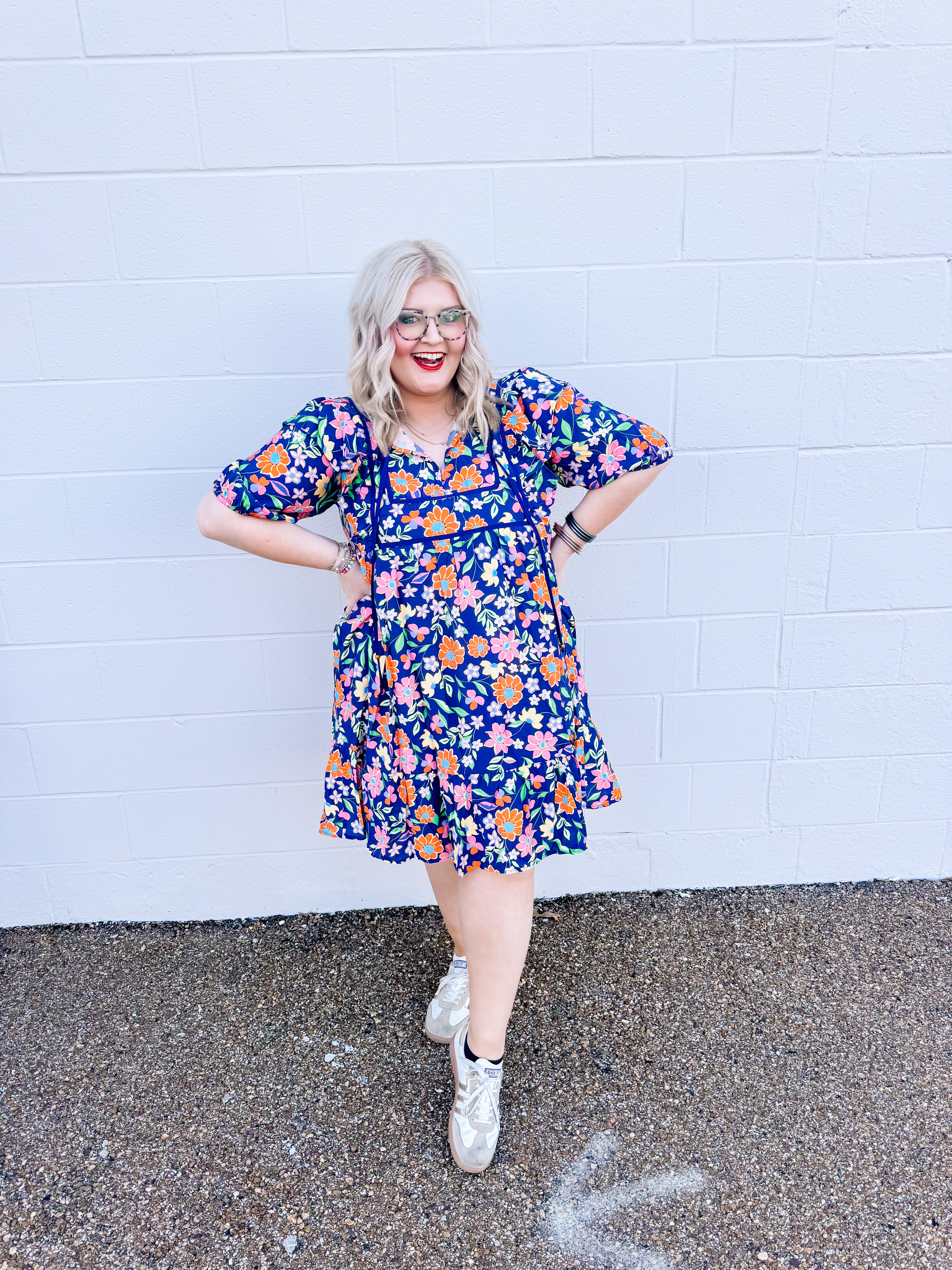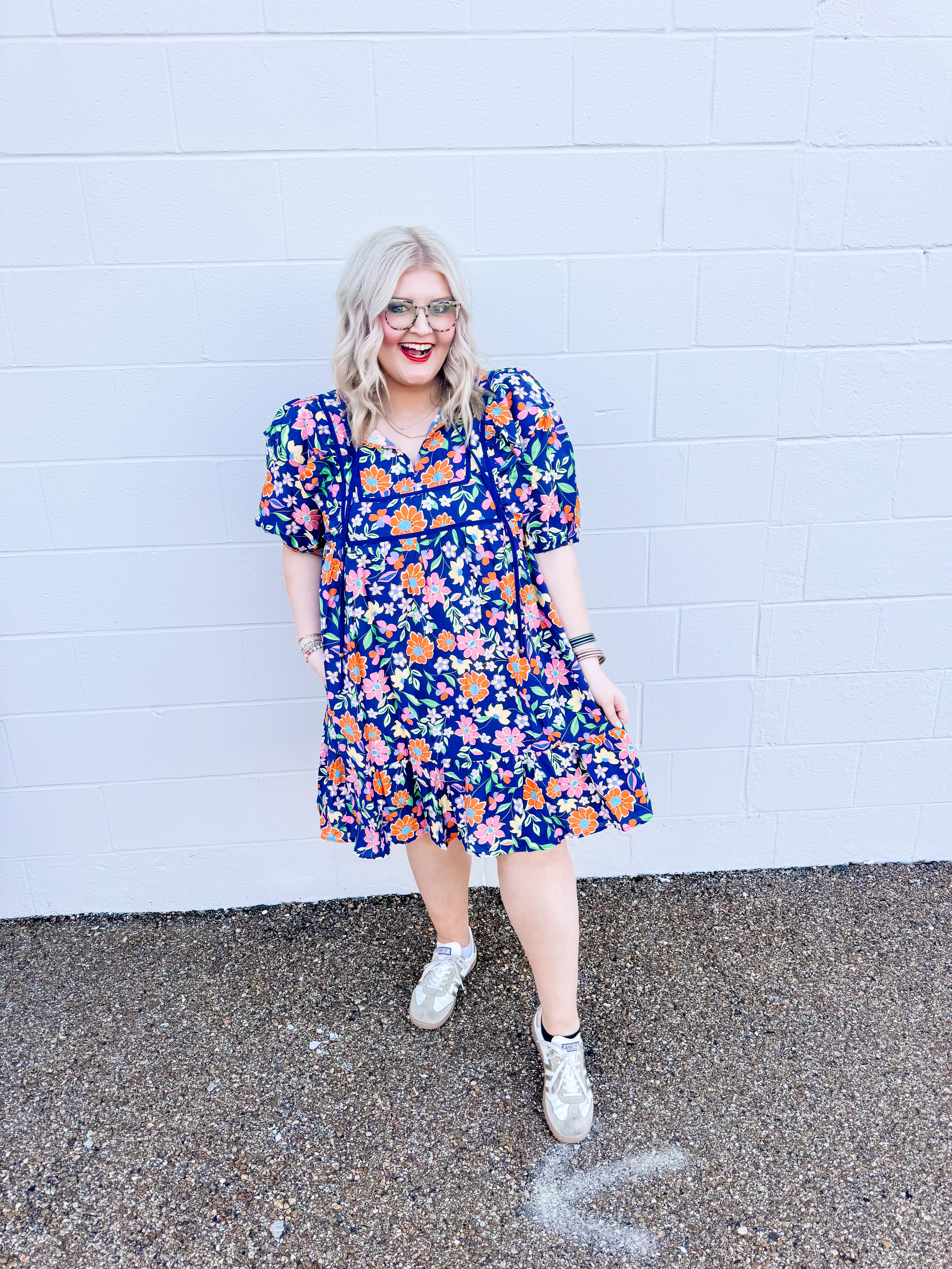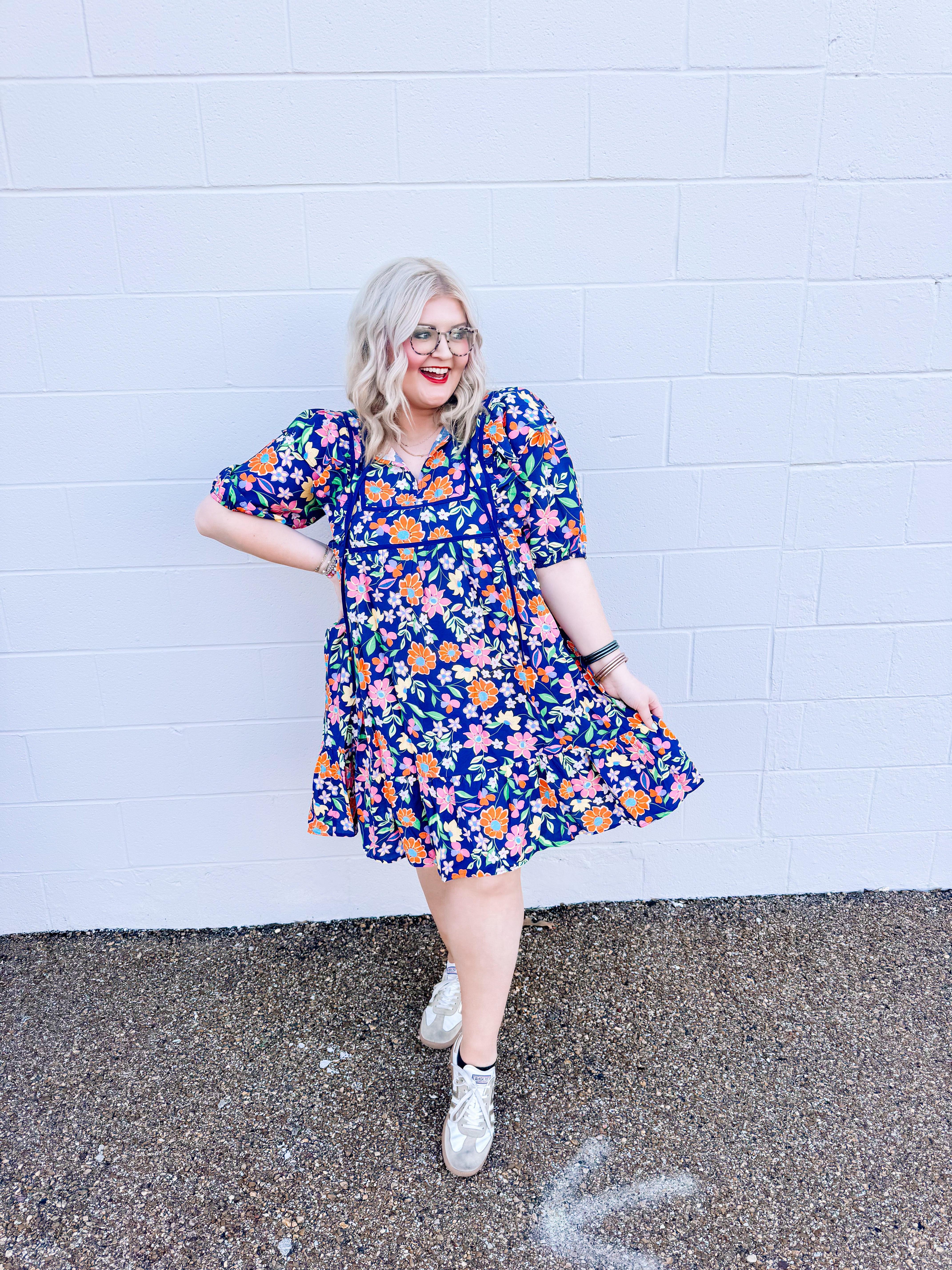 Something about this navy floral print is absolutely beautiful to us here at TIRB! Our "On a Cruise Dress: is a multi colored floral printed babydoll mini dress with puffed sleeve and contrast binding yoke. We think this dress is perfect for a dressy night in the Spring/Summer.