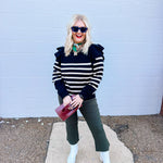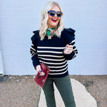 The Sew in Love Oatmeal/Black Striped Sweater features a classic long-sleeve design with subtle oatmeal and black stripes, offering both warmth and style. Crafted for comfortable everyday wear, its lightweight knit fabric ensures breathability while maintaining a cozy feel. Perfect for layering or wearing on its own, this sweater balances timeless aesthetics with functional comfort, making it a versatile addition to any wardrobe.