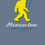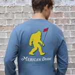 Blue long sleeve shirt with the phrase ''Merican Dude' and a sasquatch holding a flagstick. Simply Southern logo below. Similar design on left chest. 100% cotton. Unisex sizing.