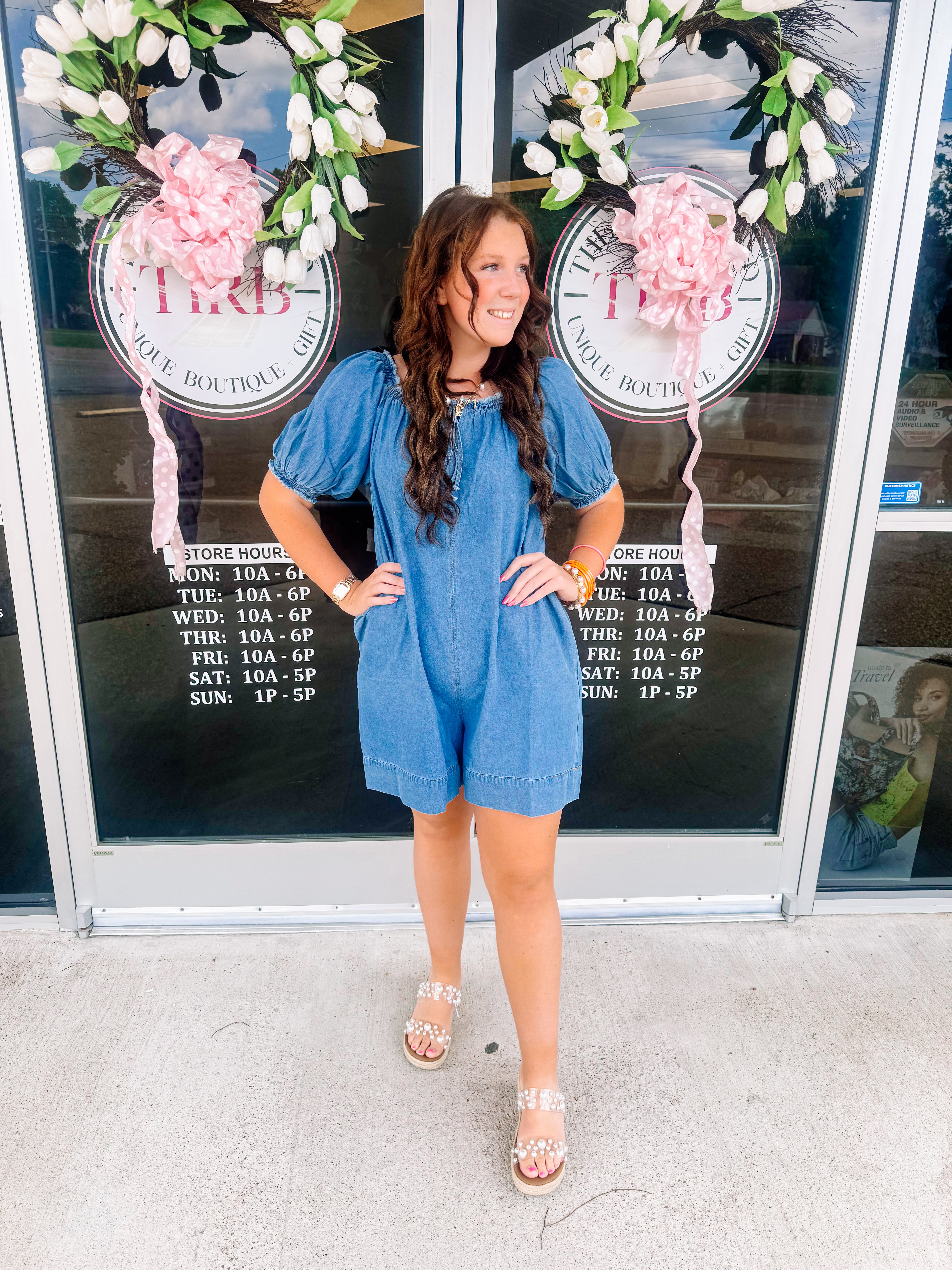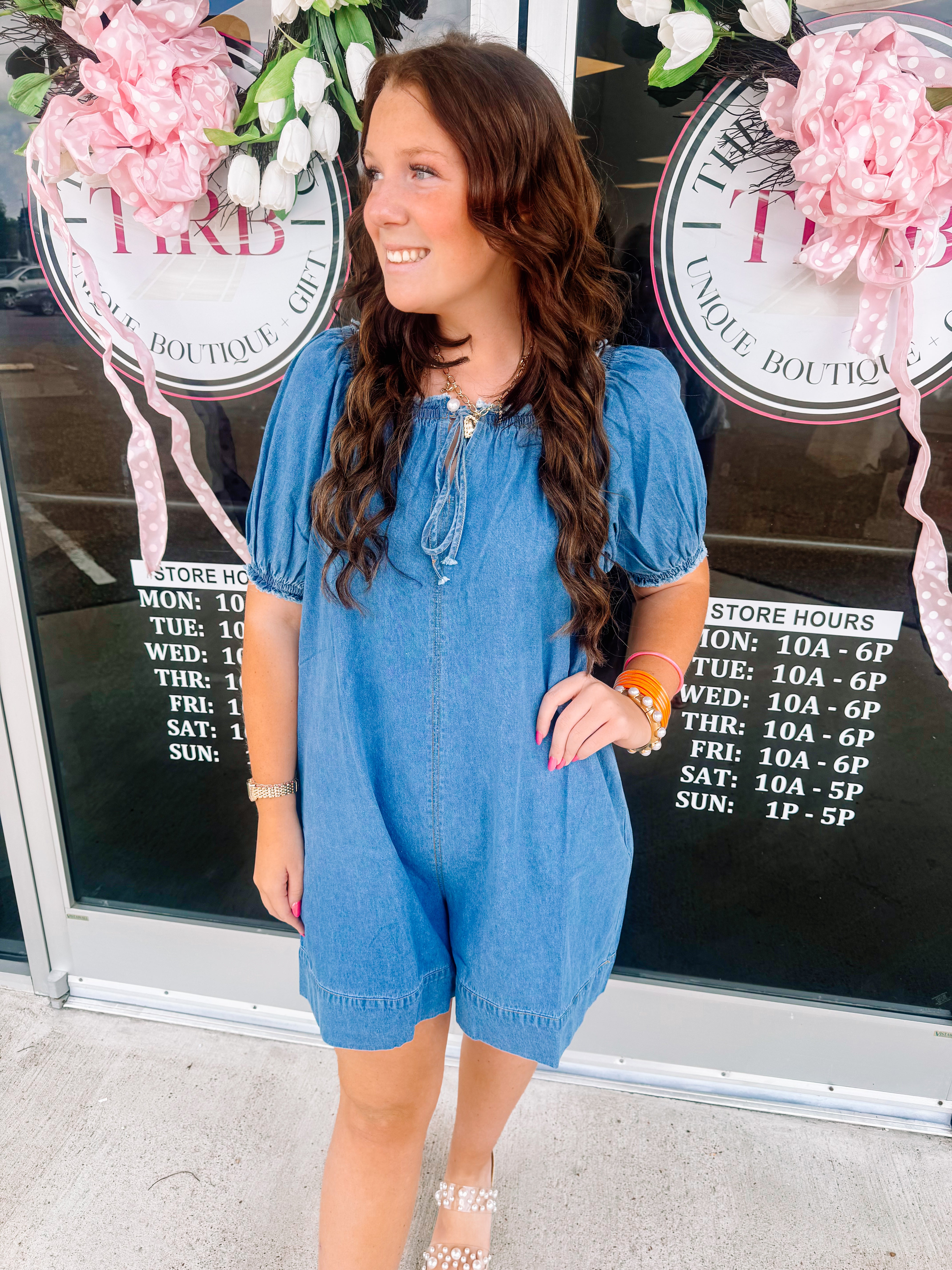 Welcome to the Mamma Mia Romper! This is part of Oddi's Sailor Collection. It is a washed denim romper with short puffed sleeves and frey accented edges.