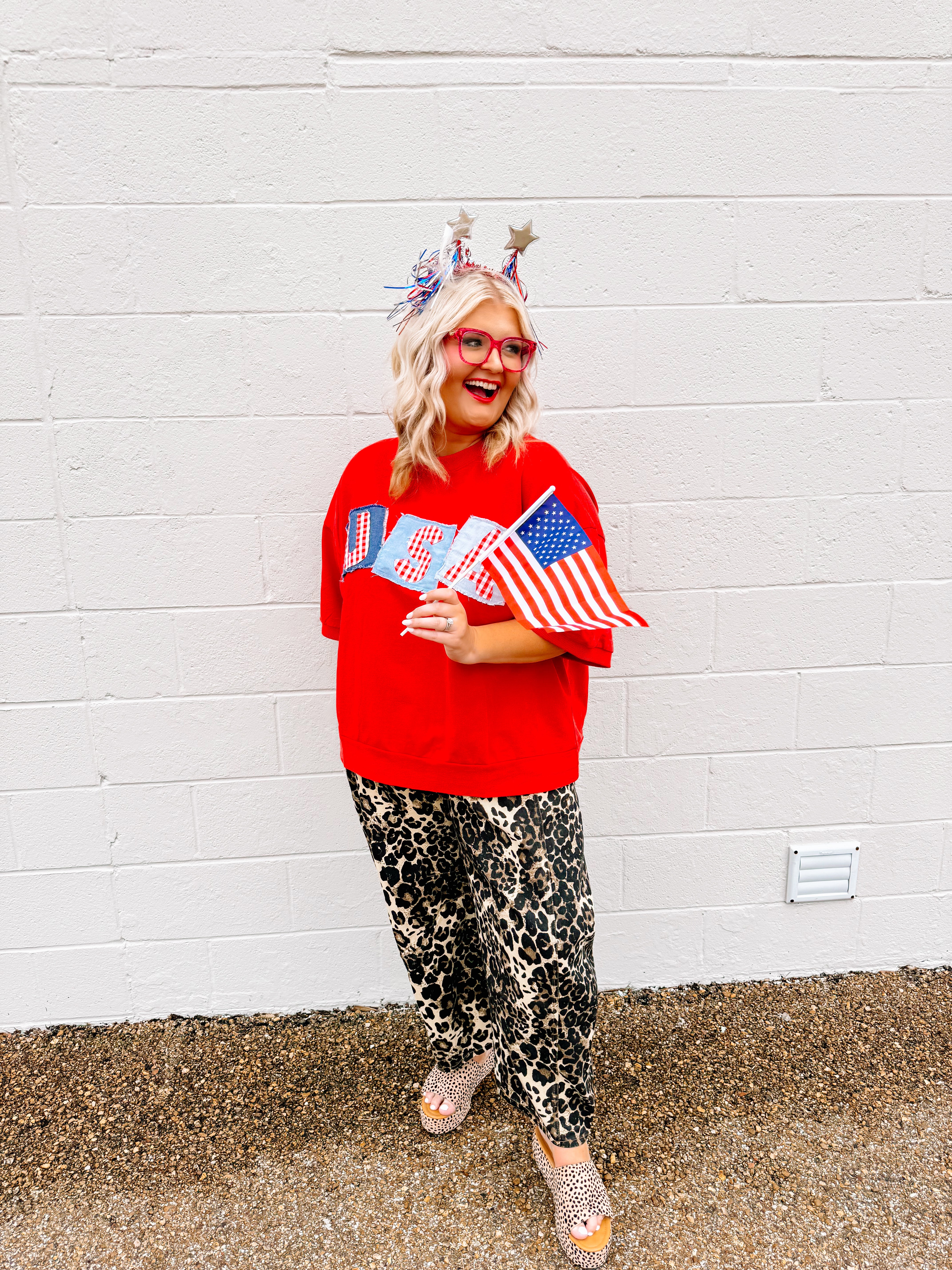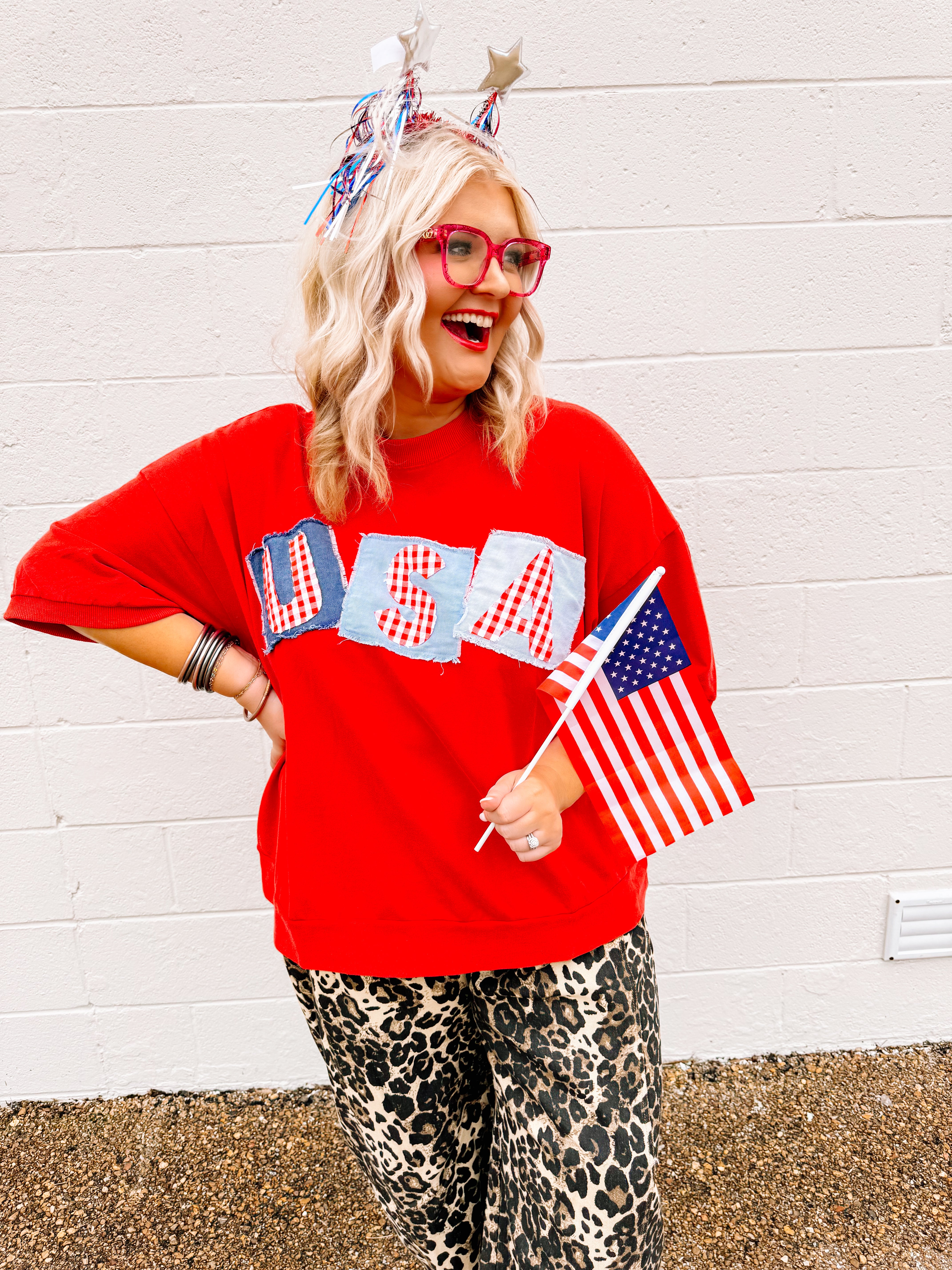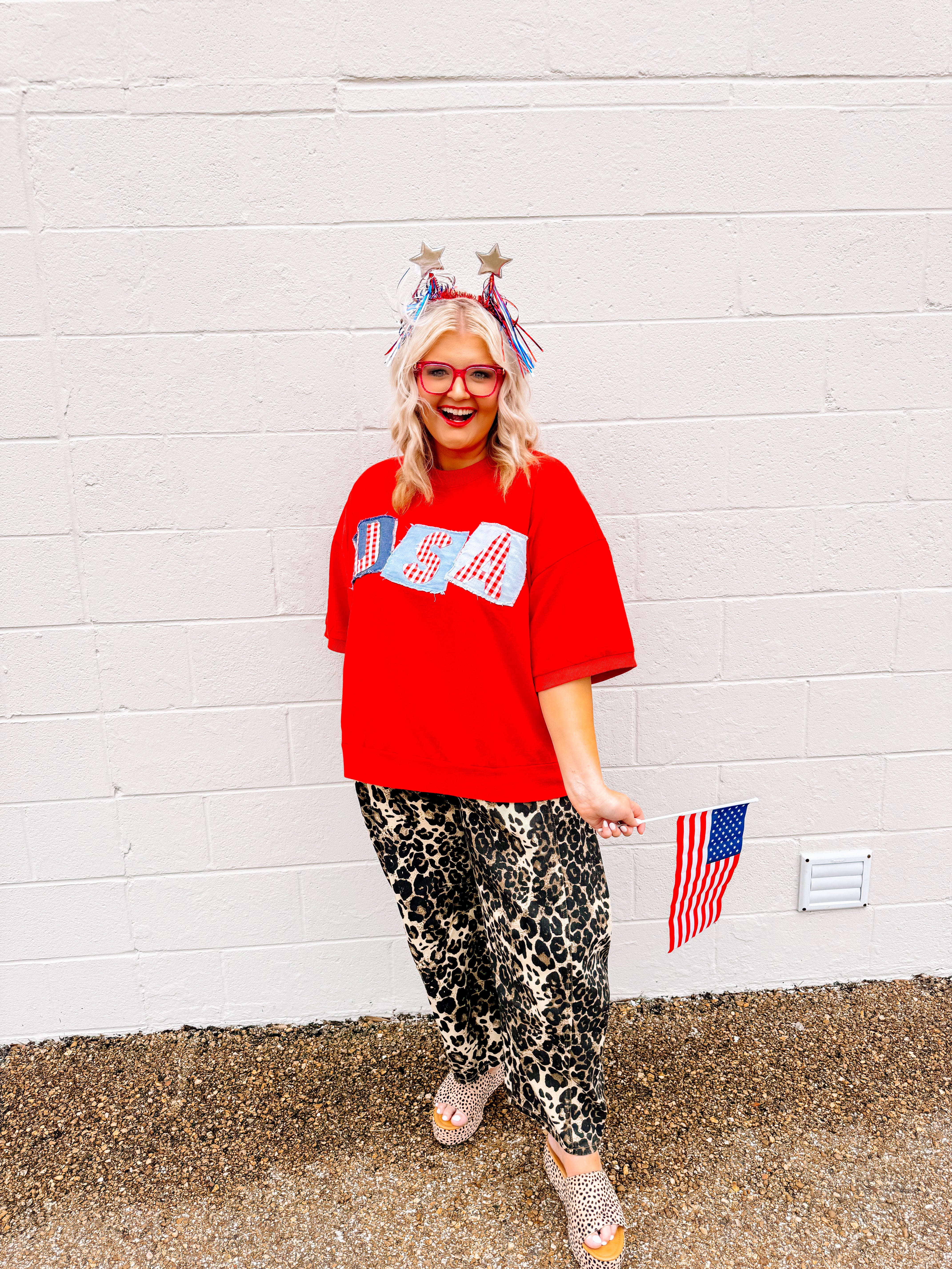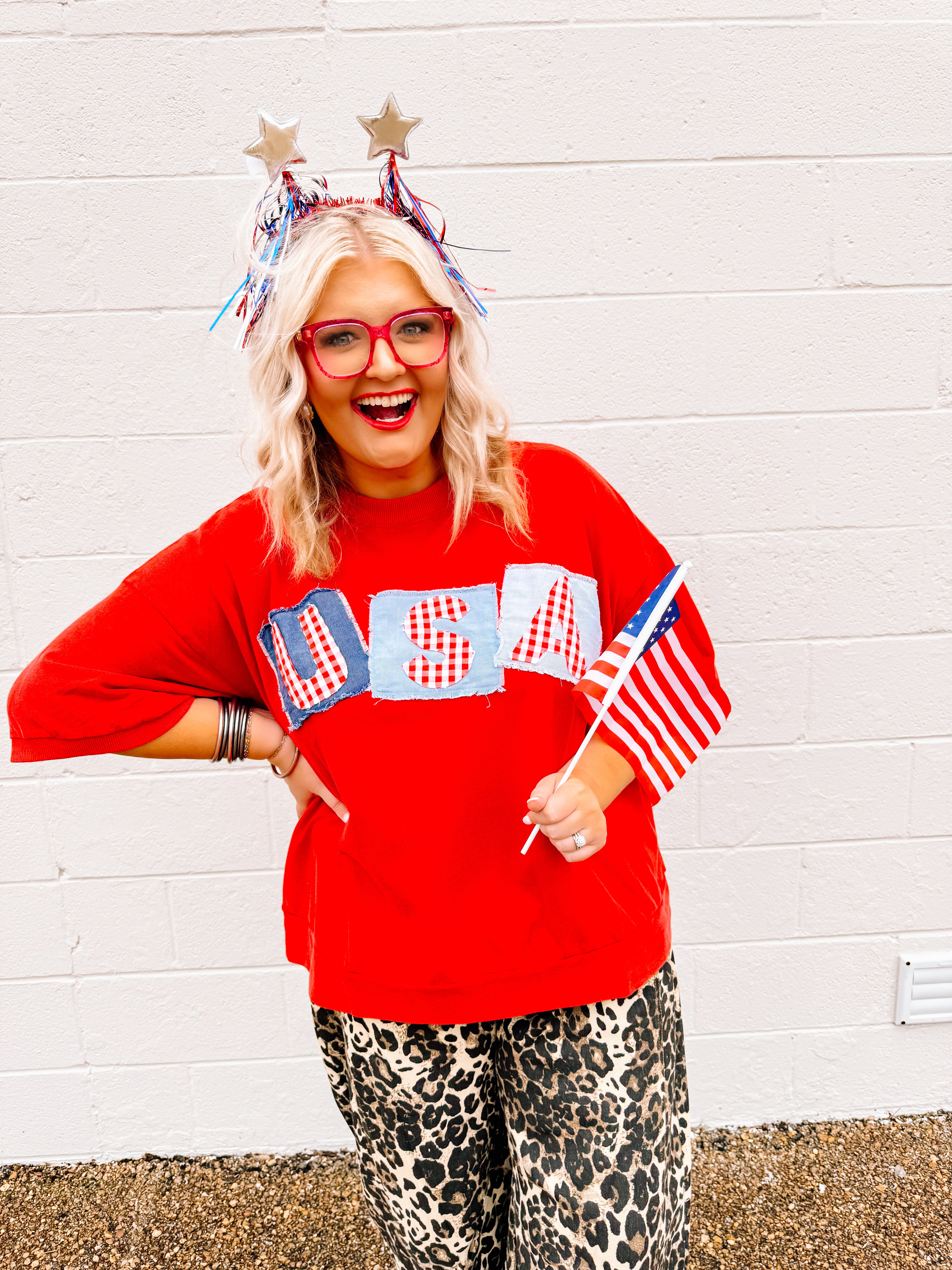 Show your patriotism with this Oddi top! This short sleeve french terrry top with USA logo patches will be perfect for any holiday this summer.