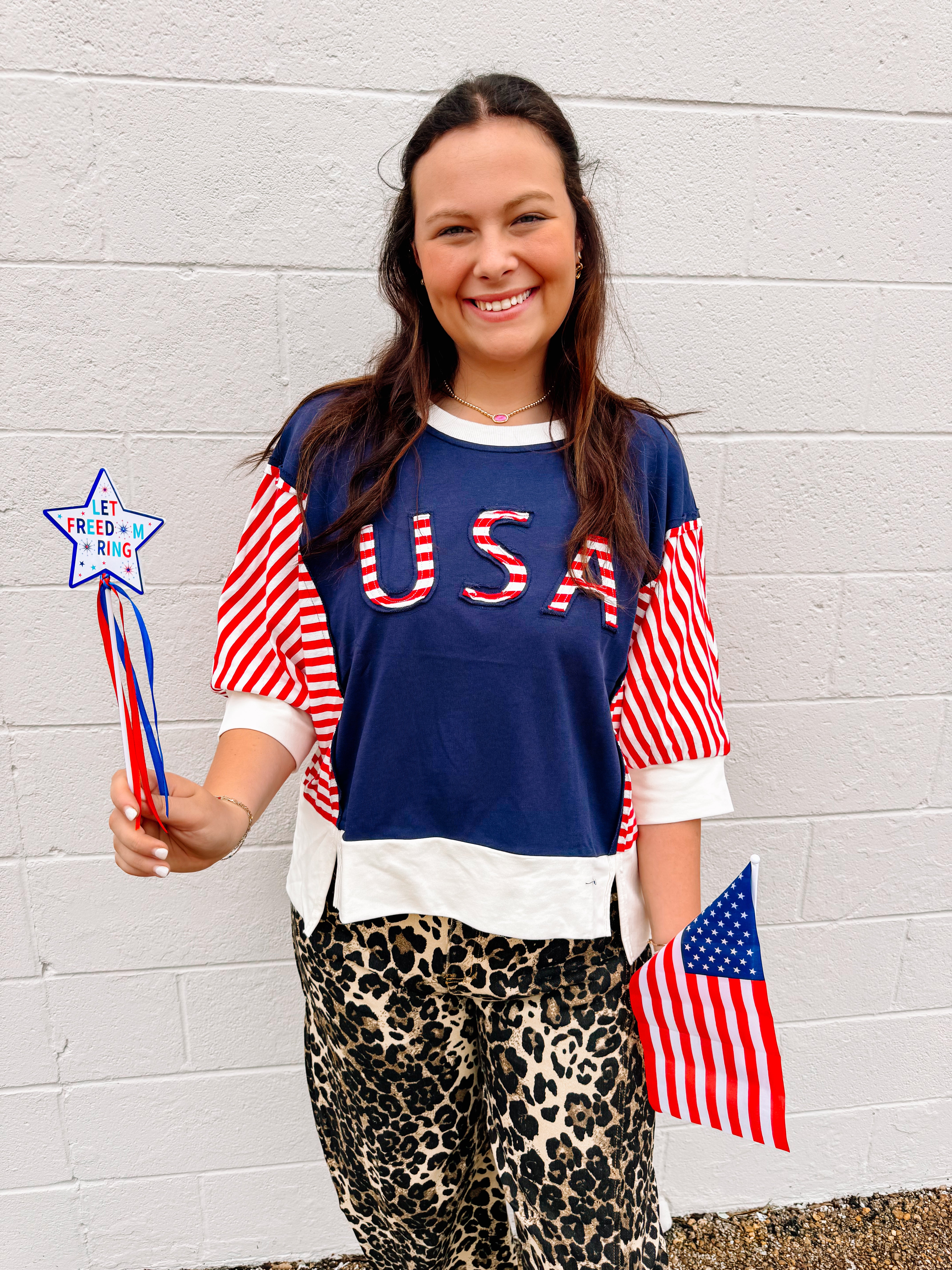 Show your American pride in this USA Striped top! This french terry top features a 3/4 sleeve with a USA logo patch on the front. This top can be worn for all patriotic holidays or to show your pride any time of the year!