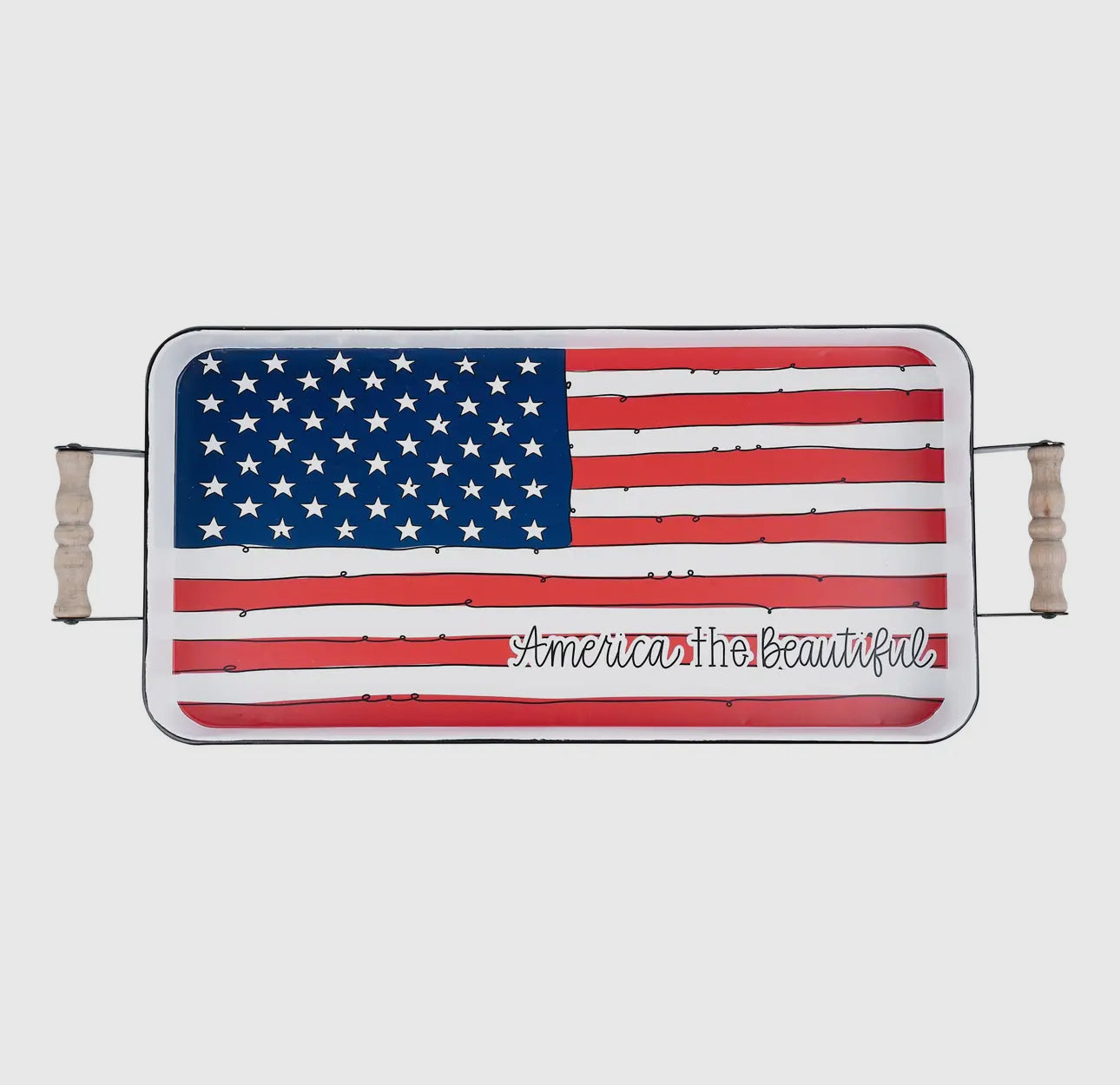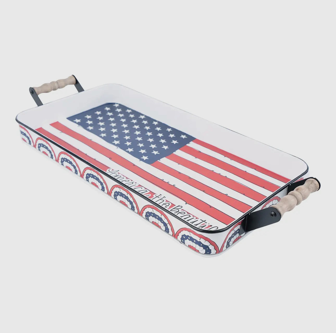 Celebrate the stars and stripes with this fourth of july enamel tray. Featuring a vibrant American flag design and the patriotic "America the Beautiful" message, this tray adds charm to any patriotic gathering. Perfect for serving snacks, drinks, or just adding a pop of red, white, and blue to your home decor, it’s a must-have for Independence Day.