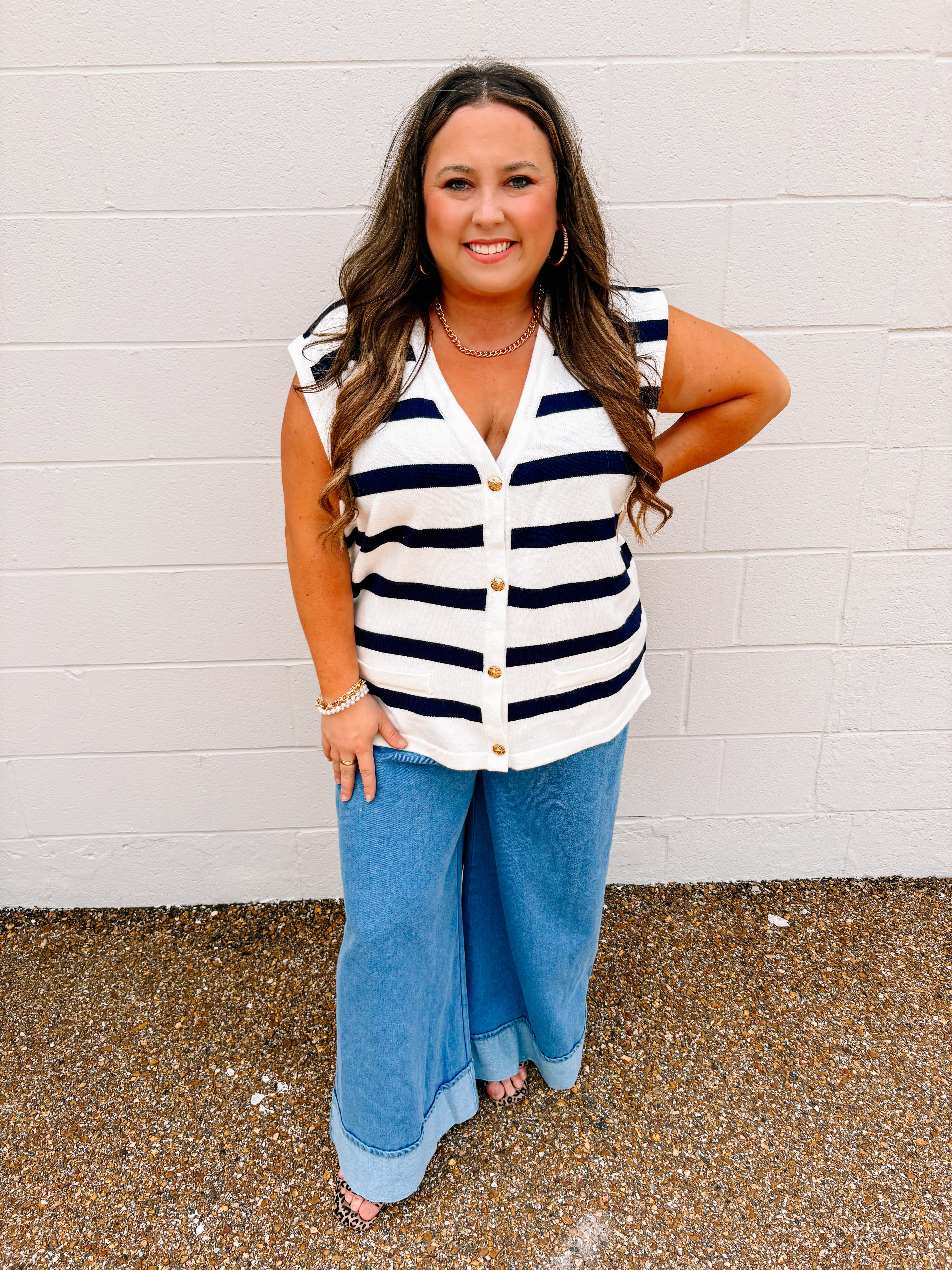 Welcome to the Set Sail Sweater Vest! This knitted striped sweater vest with a faux pocket and decorative buttons is perfect for the spring and summer.