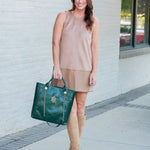 This tall magazine style tote is designed with a stunning vegan leather quilted fabric. It's a great, everyday bag that accommodates most laptops with plenty of space for daily essentials. It features a deep magnetic front pocket ideal for a large phone, along with versatile carrying options through short top handles and elongated braided handles. This tote includes a secure magnetic closure, along with two interior open pockets and one zippered pocket for efficient organization. There are feet on the bottom for added protection as well.