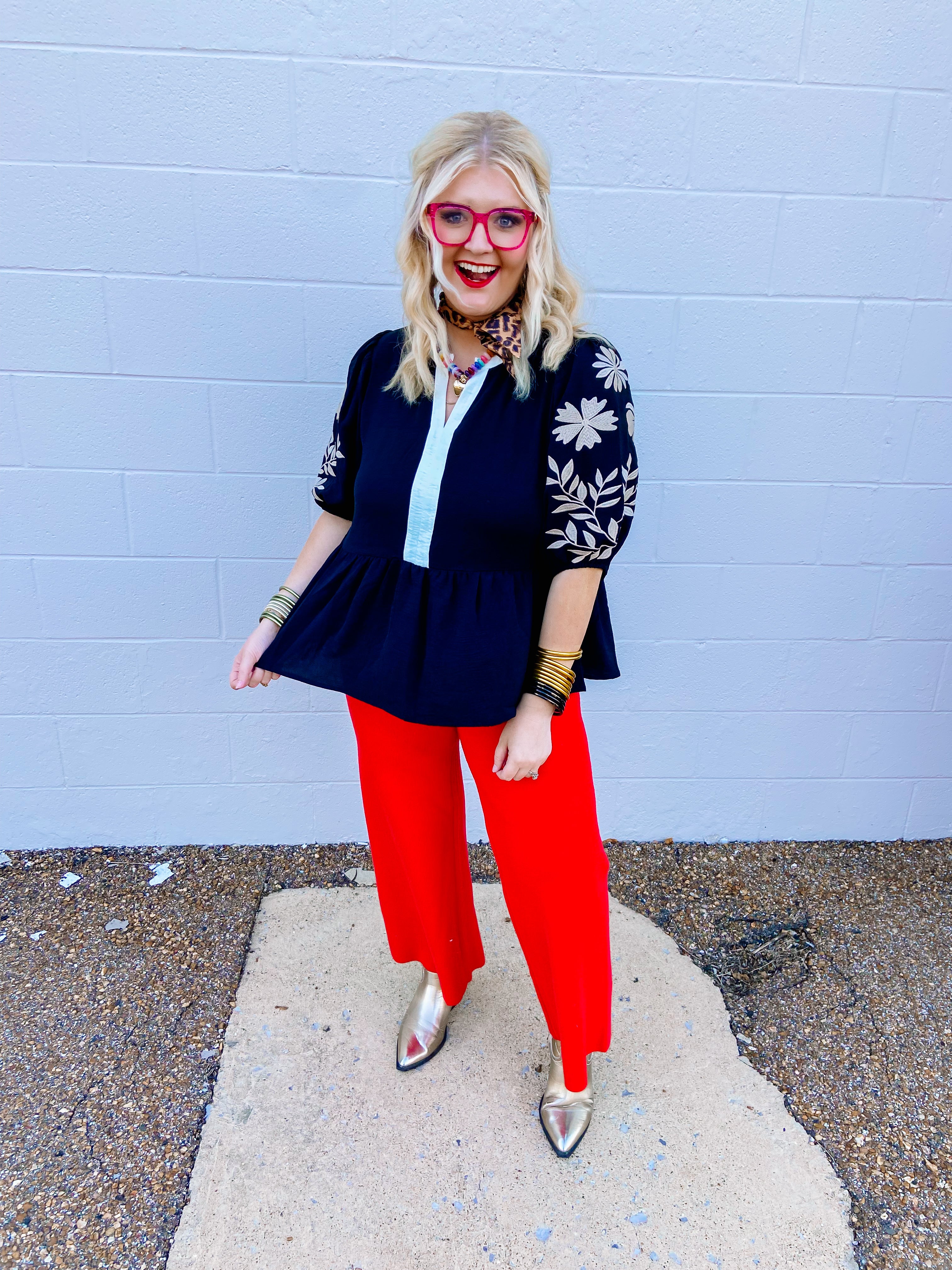 The Oddi Black Peplum Blouse offers a sophisticated blend of style and comfort with its solid airflow fabric that ensures breathability throughout the day. Featuring puffed, embroidered 3/4 sleeves accented with subtle tan and white details, this blouse adds elegant dimension and refined texture to your wardrobe. Its tailored peplum silhouette enhances your natural shape, making it a versatile piece suitable for both professional and social settings.
