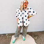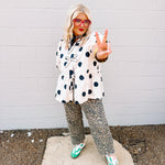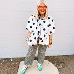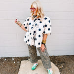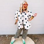 The Oddi Black Polkadot Blouse features a classic black and white polka dot print, perfectly balanced with elegant puffed sleeves. Its front tie ribbon adds a refined detail, making this blouse a versatile choice for both professional and casual settings. Crafted to combine timeless style with a flattering silhouette, it pairs effortlessly with tailored pants or skirts for a polished look.
