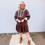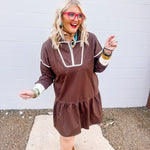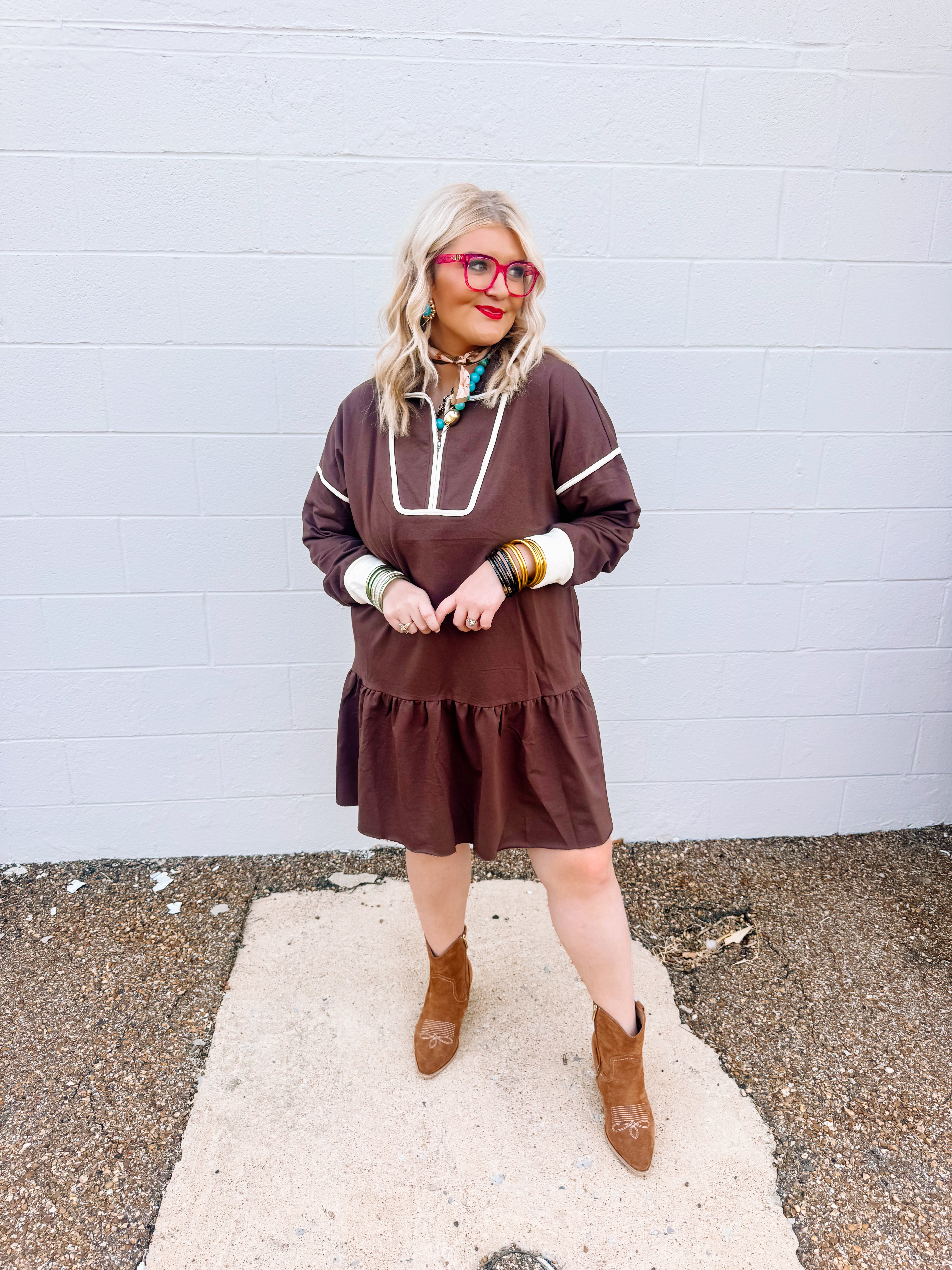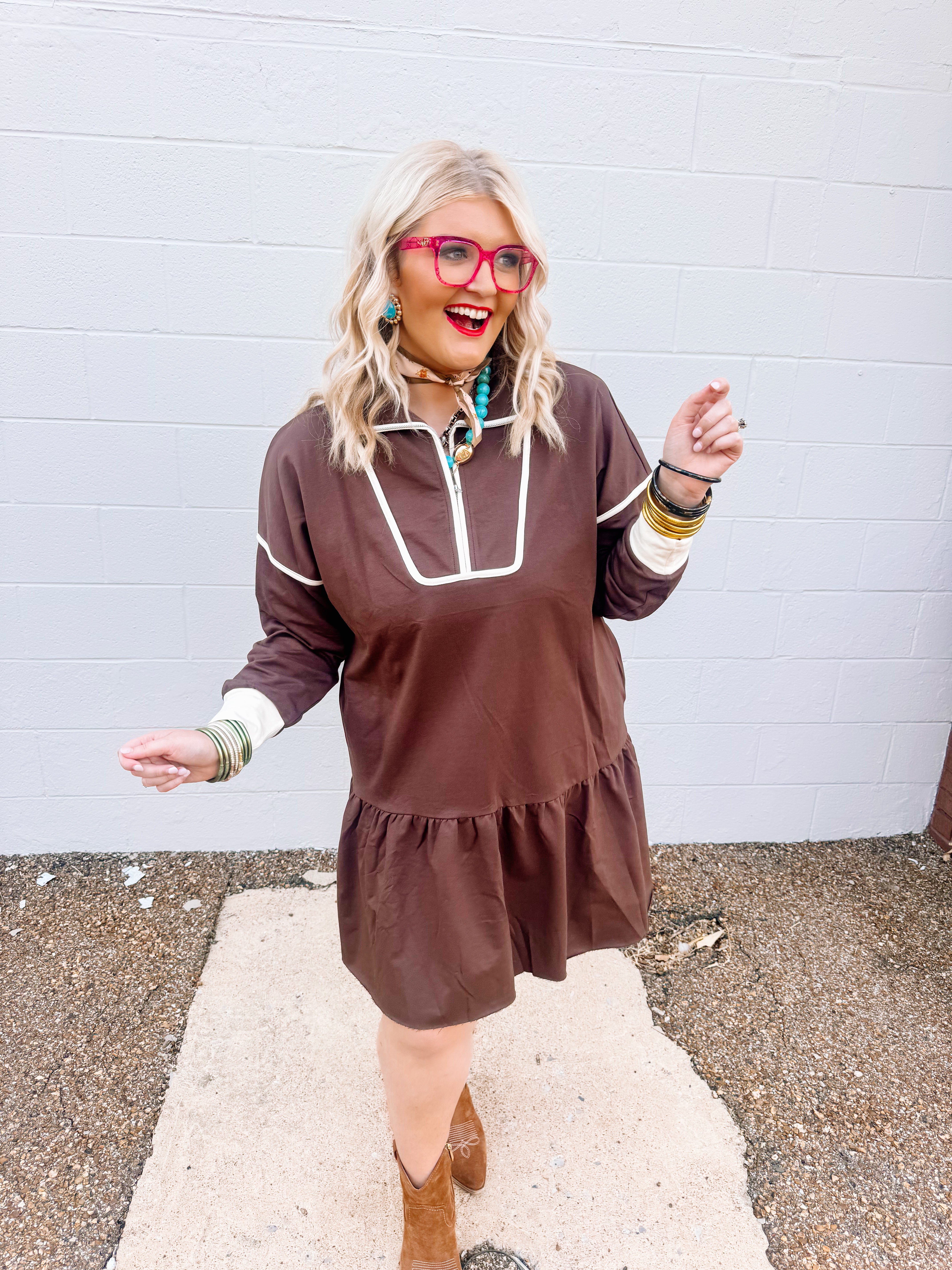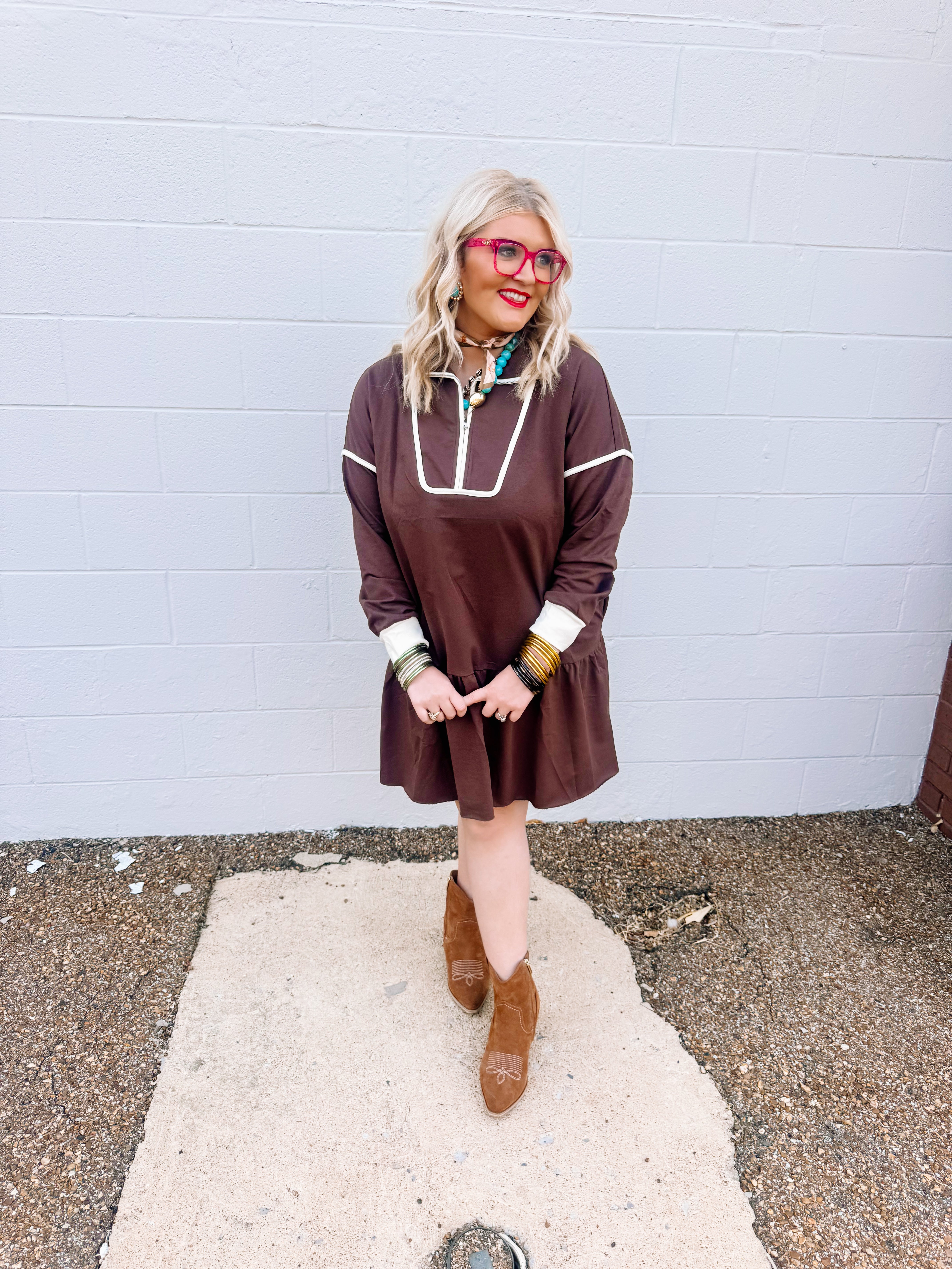 Crafted from soft French terry fabric, the Oddi French Terry Chocolate Dress offers both comfort and style. This baby doll silhouette features contrast piping that highlights the mock neck and a half-zip front, allowing for easy wear and a tailored look. Perfect for versatile layering or standalone wear, it balances casual ease with refined details suitable for everyday sophistication.