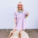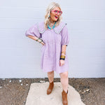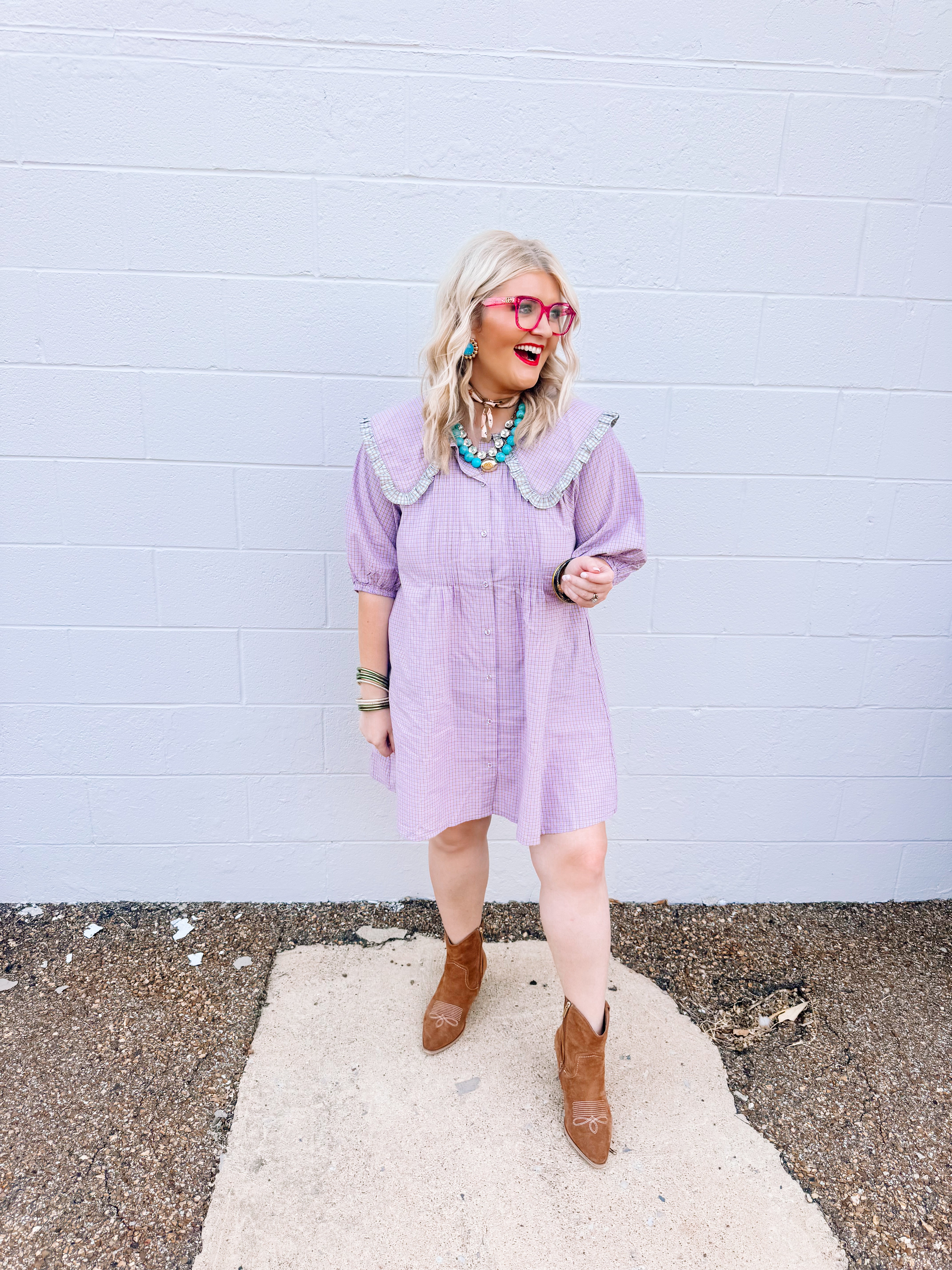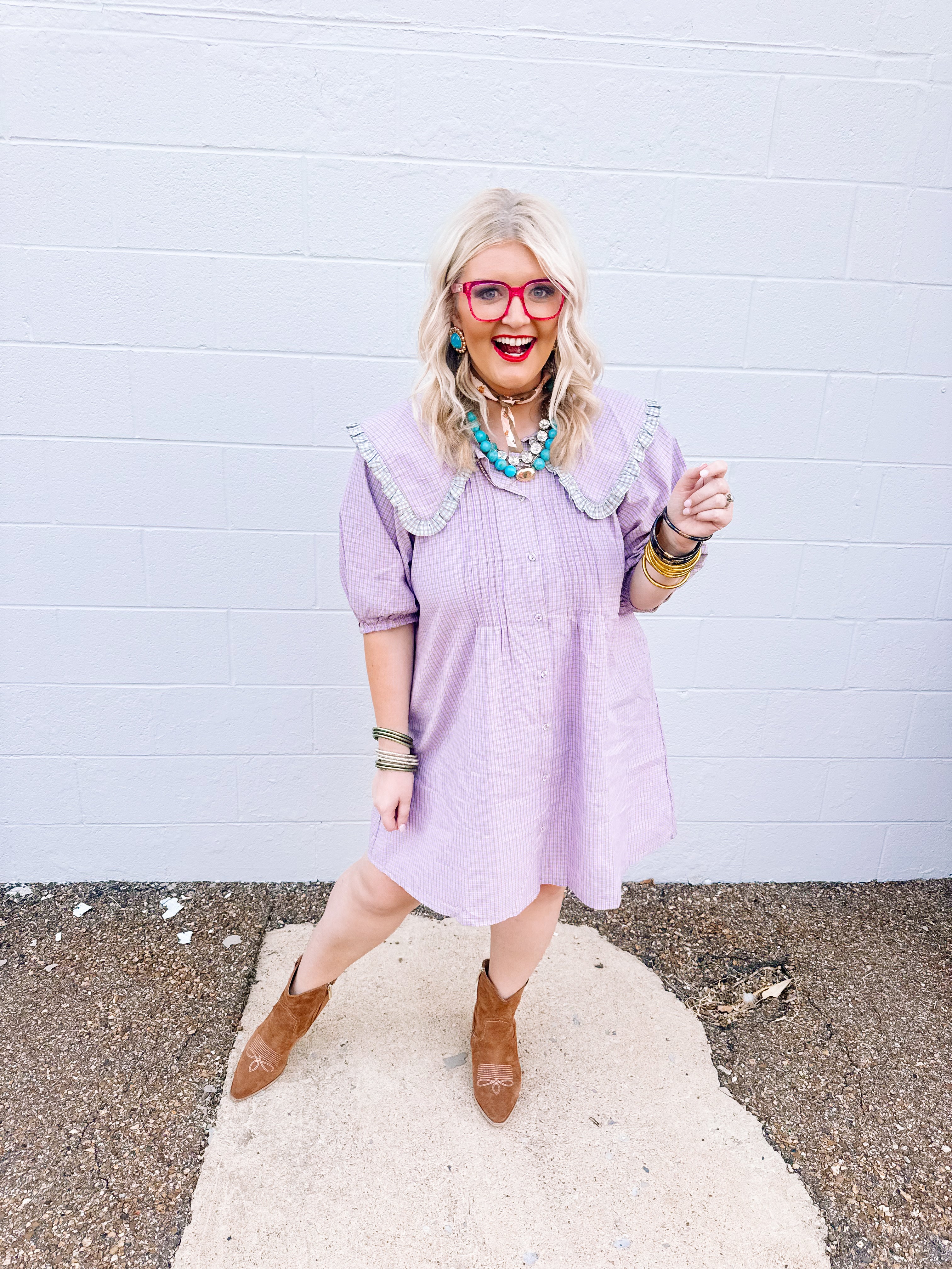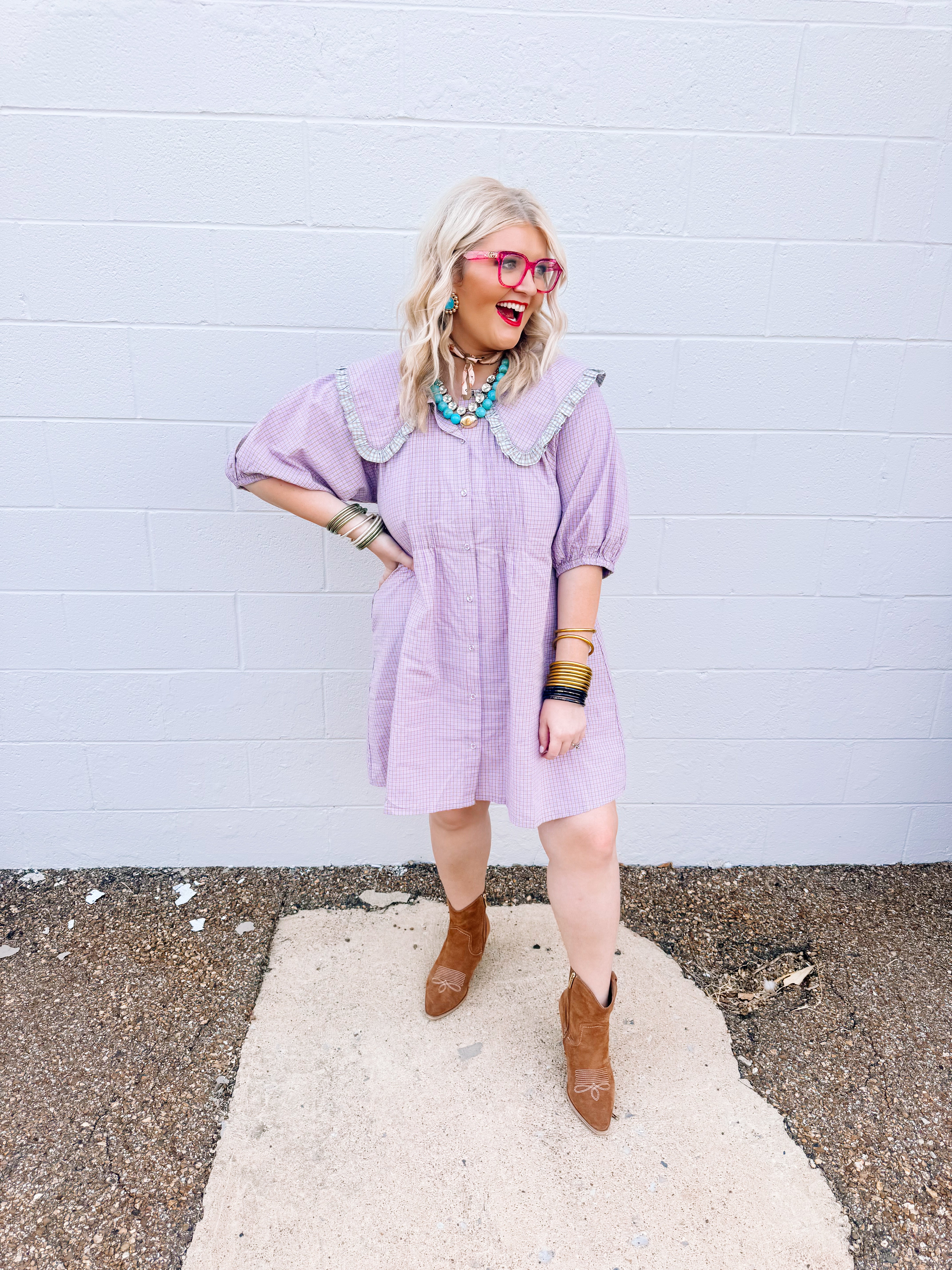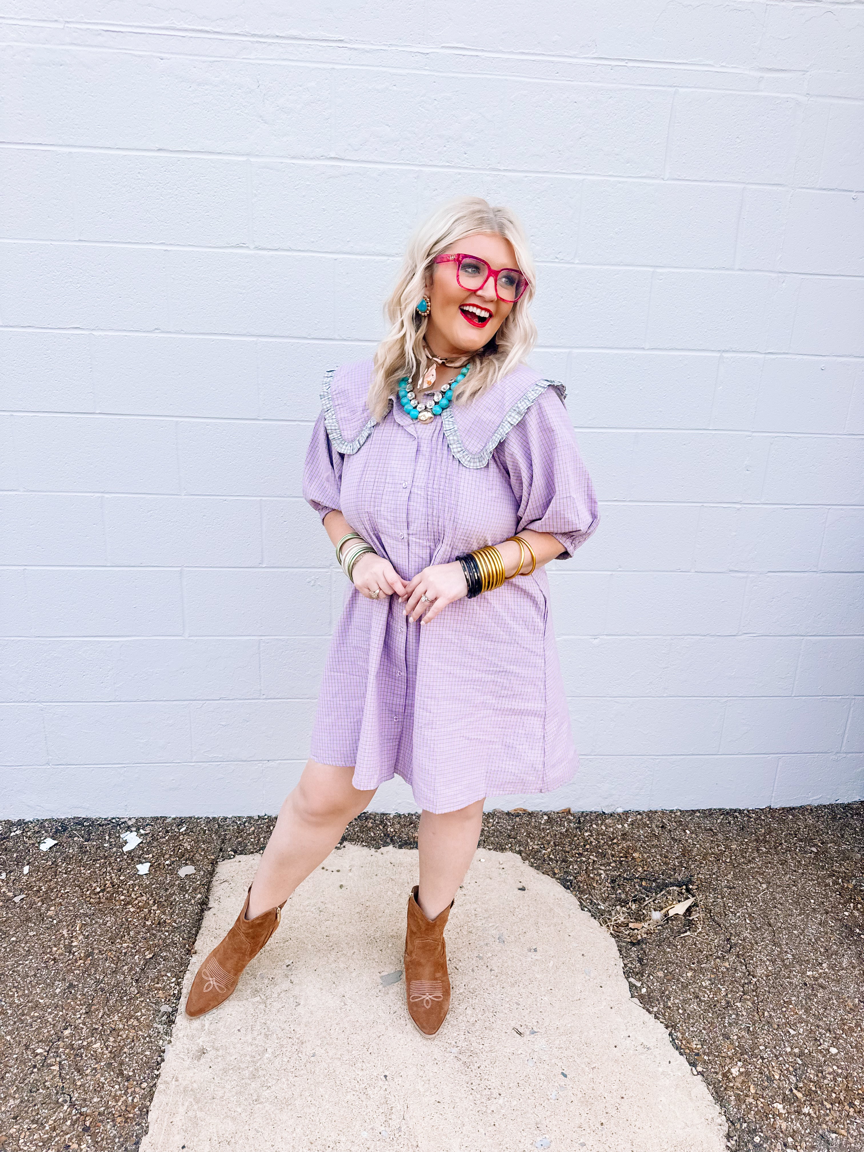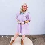 The Oddi Shirt Dress features a standout oversized ruffled collar and elegant puff sleeves for a refined silhouette. Its front button closure adds classic charm while ensuring easy wear. Rendered in a delicate lavender combo, this dress blends vintage-inspired details with modern sophistication, perfect for making a subtle yet confident style statement.
