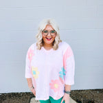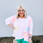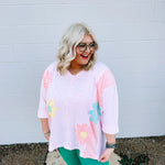 So many pretty Spring colors in this oversized top. Our Blush and Bashful top is a half sleeve V-Neck with flowers throughout the top. Pair with our colored pants for a cute spring look.