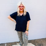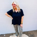 This Zenana corded ribbed top in black features an oversized, flowy silhouette with a flattering hi-low hemline. The V-neck design adds a touch of elegance, making it versatile for both casual and polished looks. Crafted for comfort and style, this top effortlessly combines relaxed fit with refined details.
