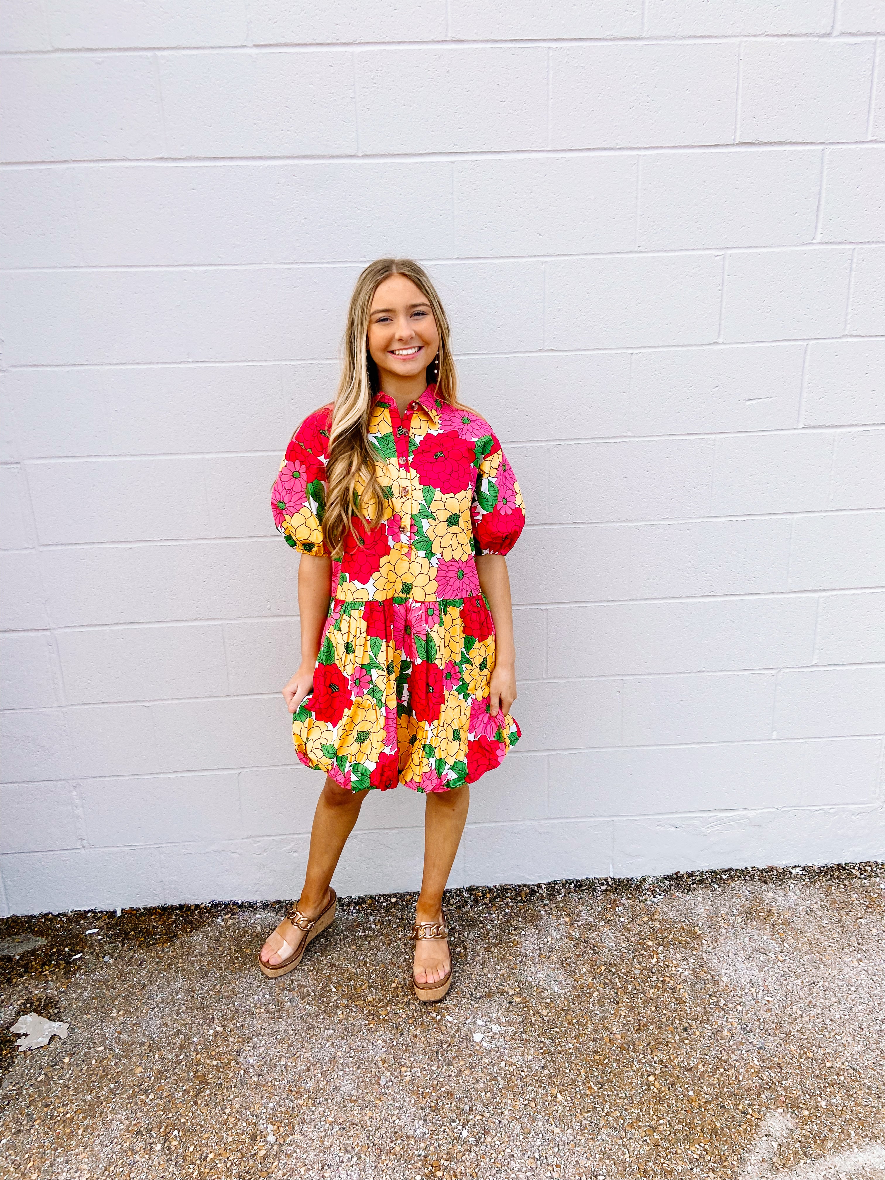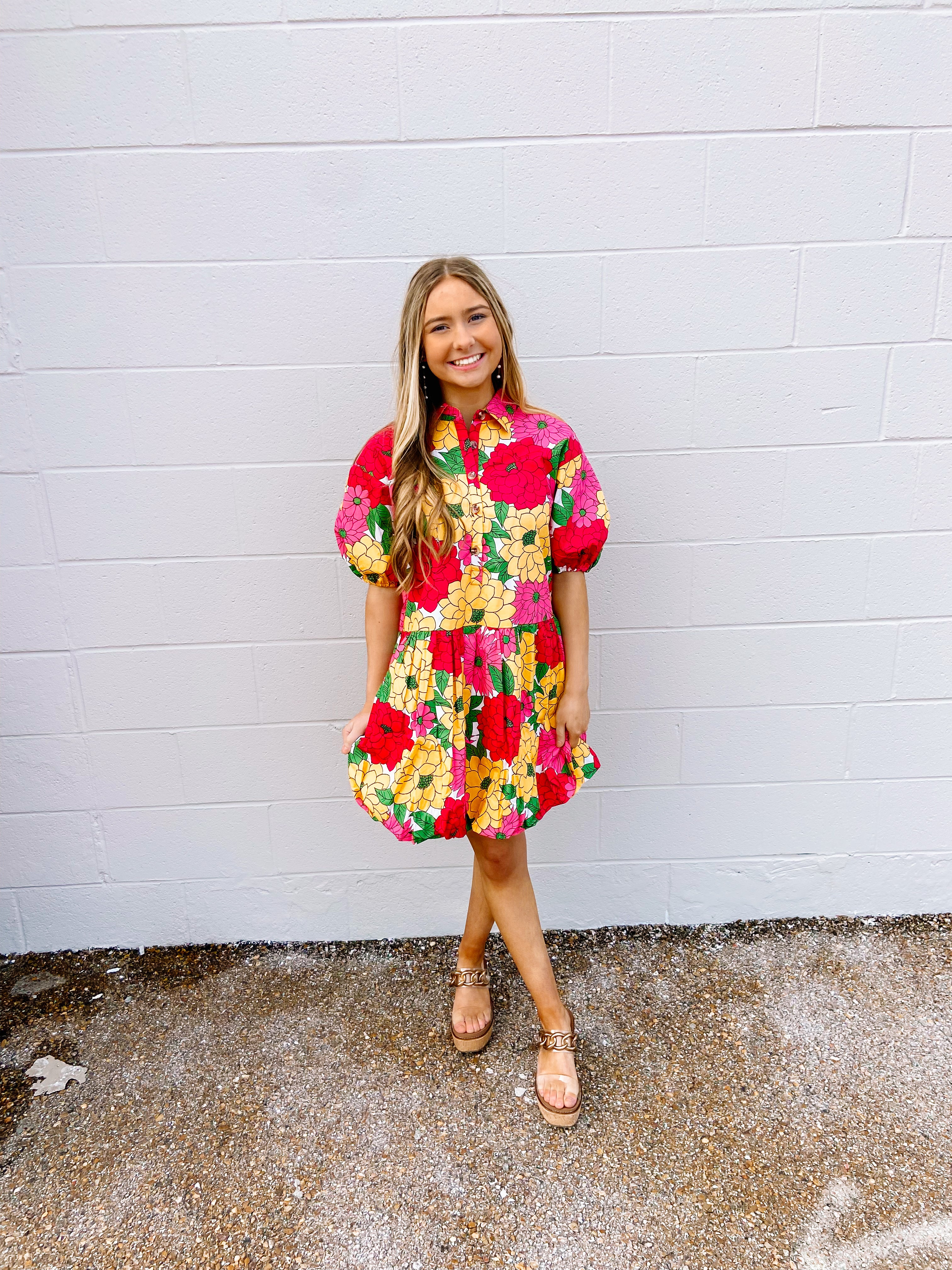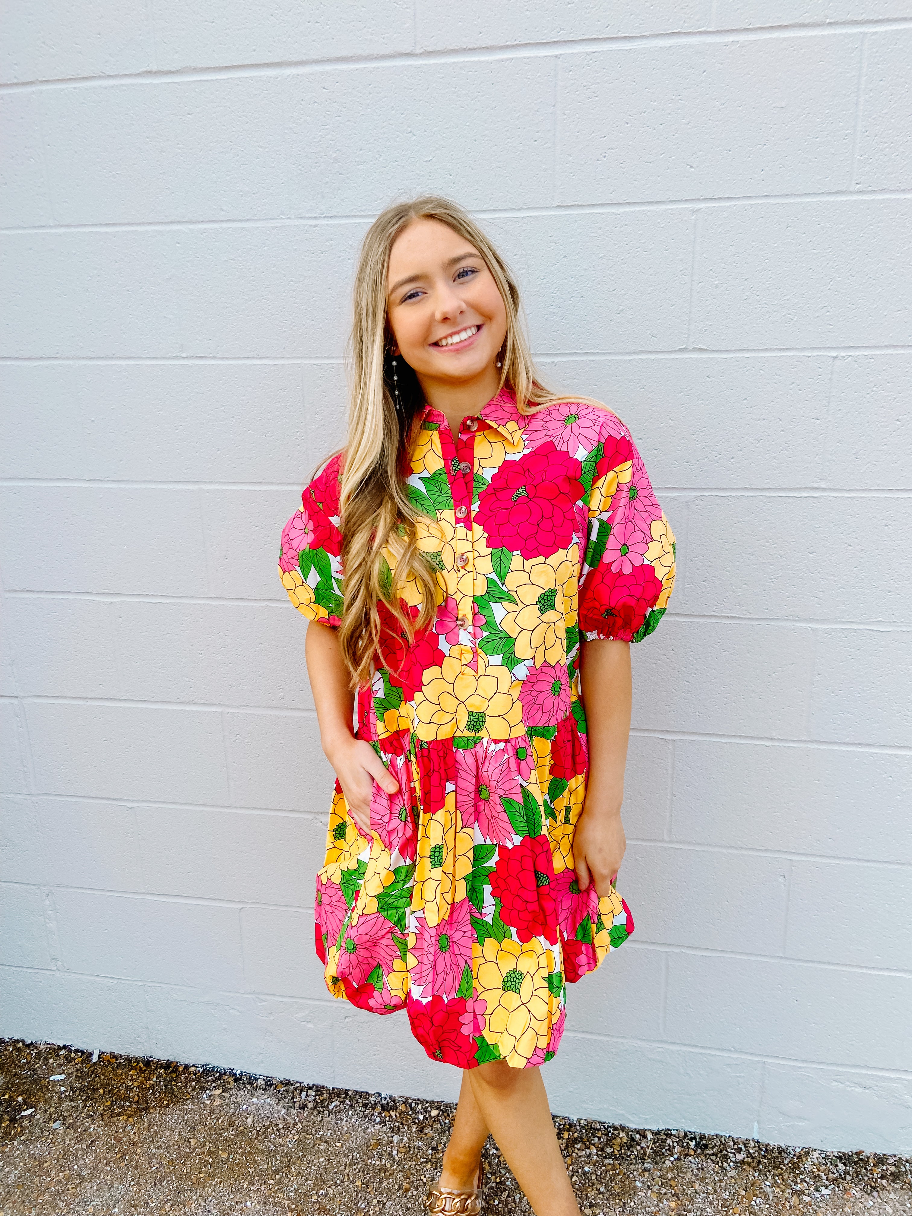 Talk about an adorable Spring Floral Patterned dress. Our "Flower Power Dress: is a floral print button front bubble mini dress in the color Fuchsia. Perfect any Spring outfit and we love the bold colors.