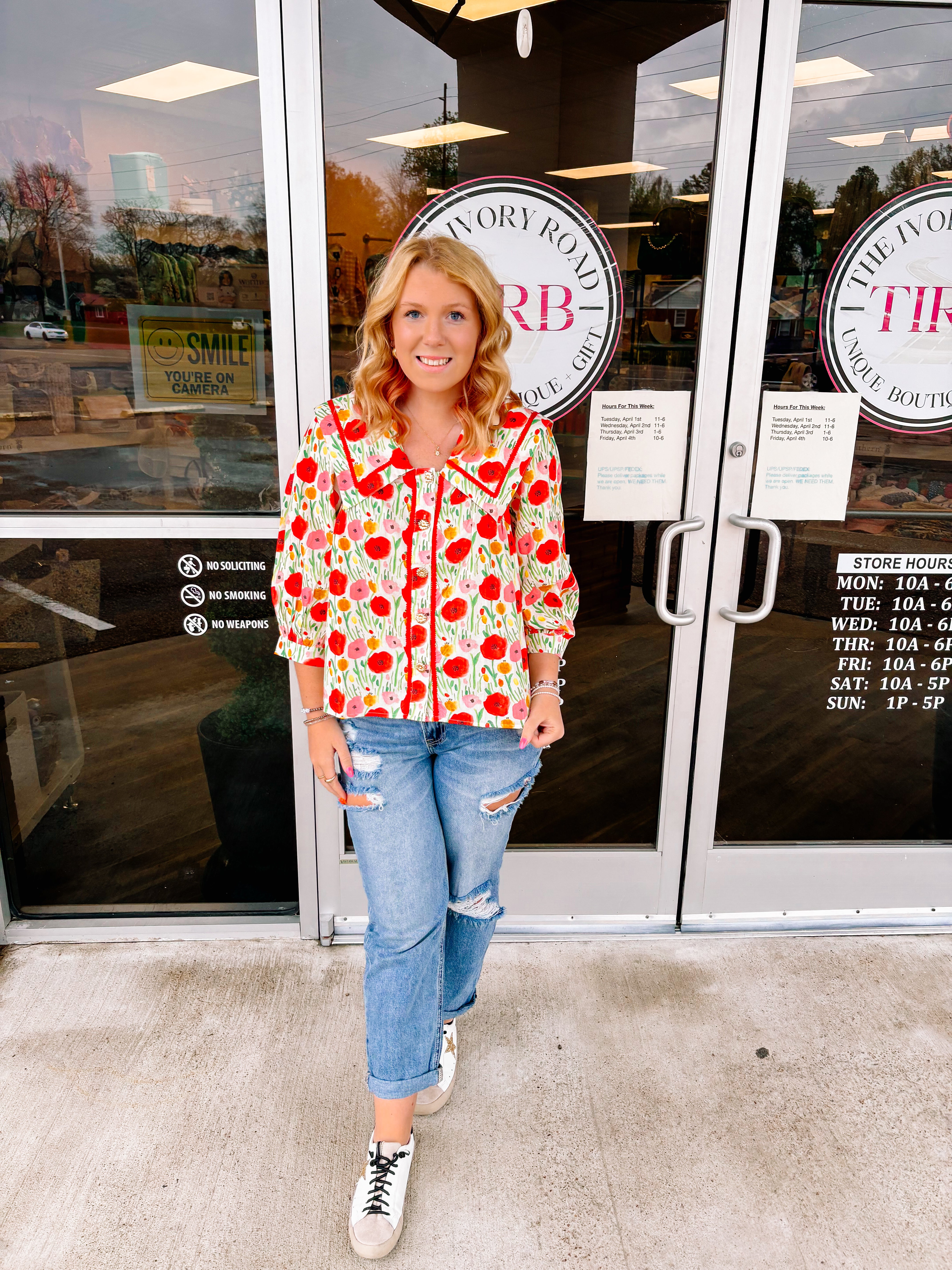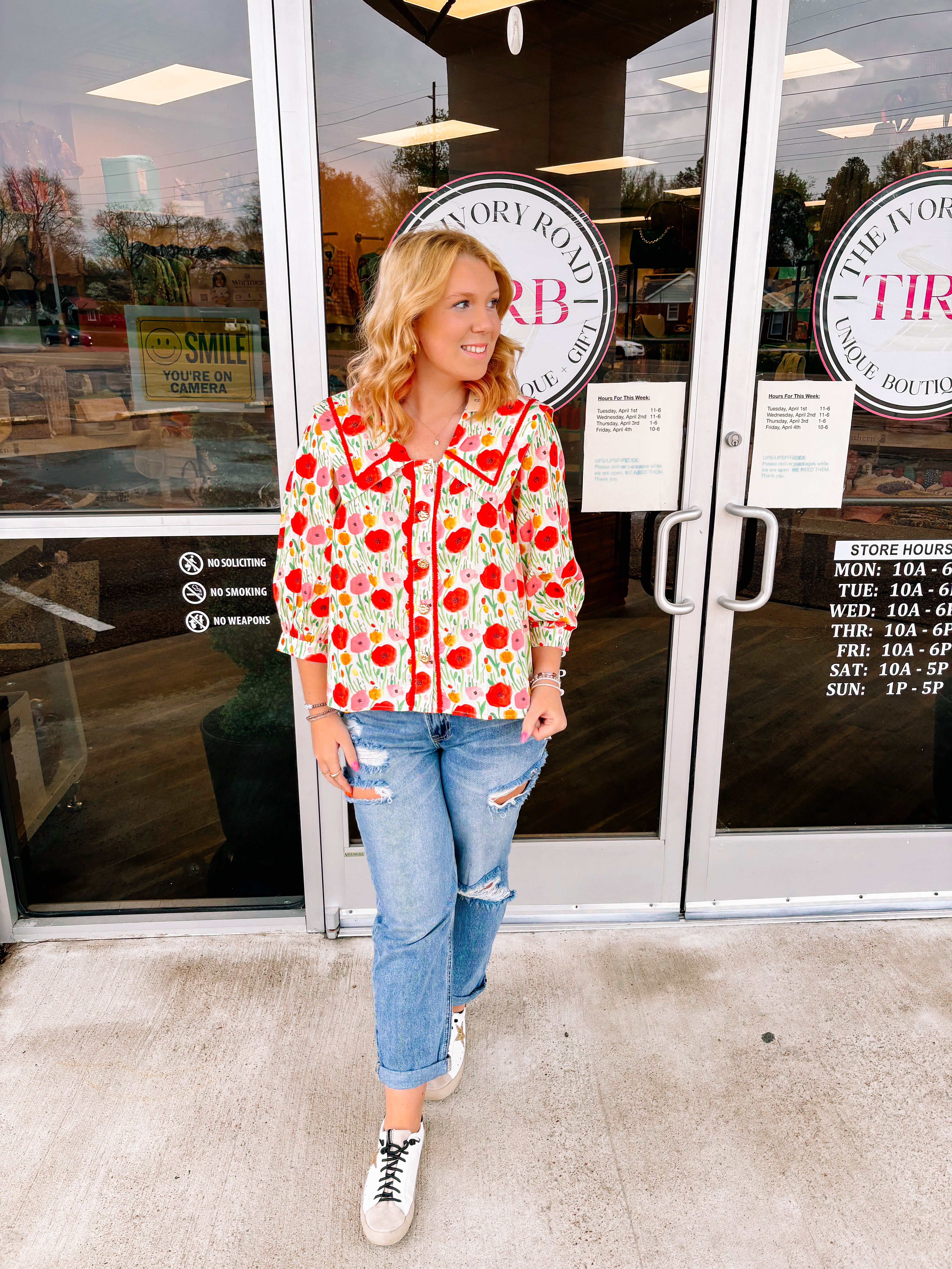 Welcome to The Morgan Top. This floral top has 3/4 sleeves and is perfect for work or a night out on the town.