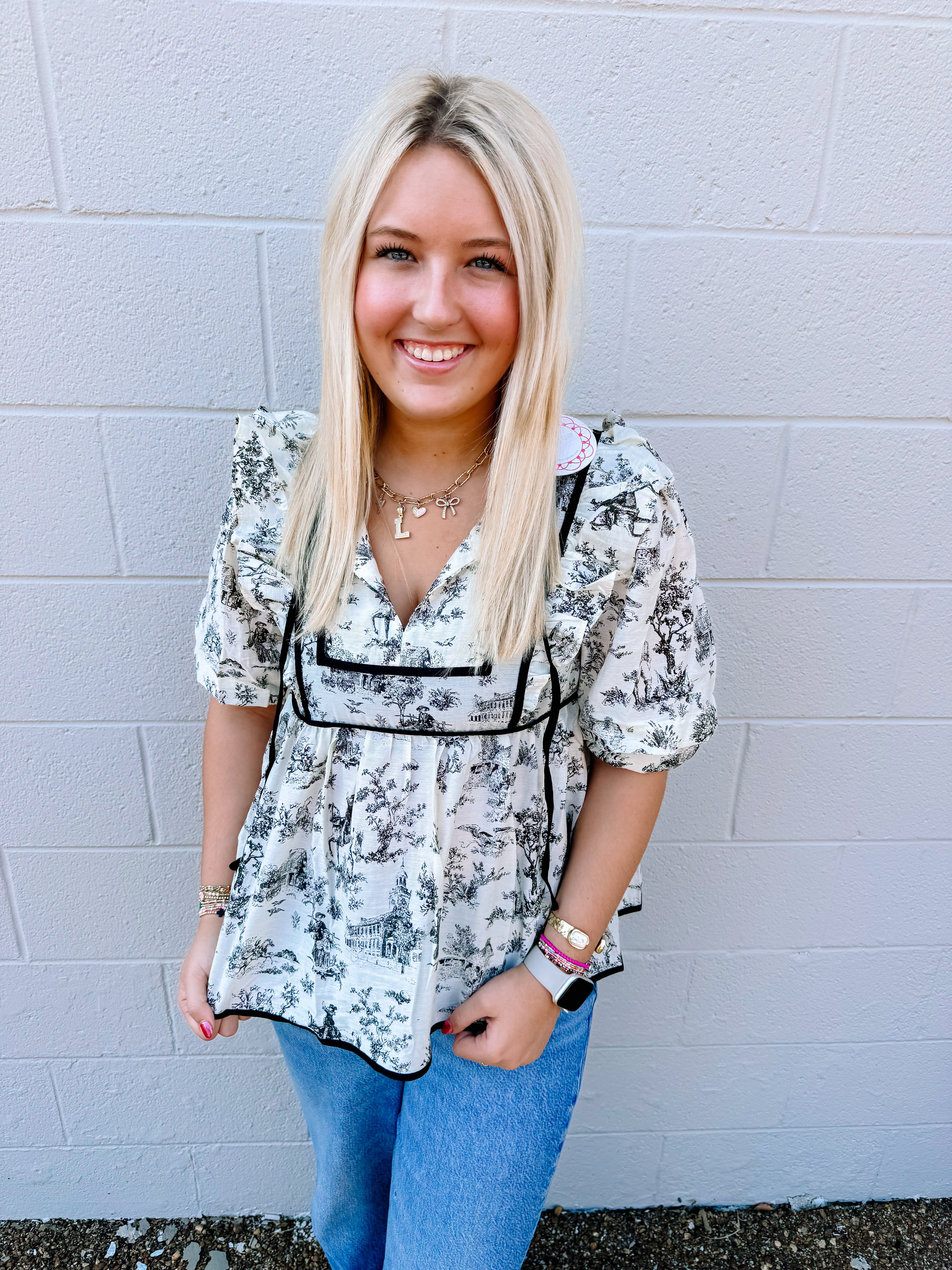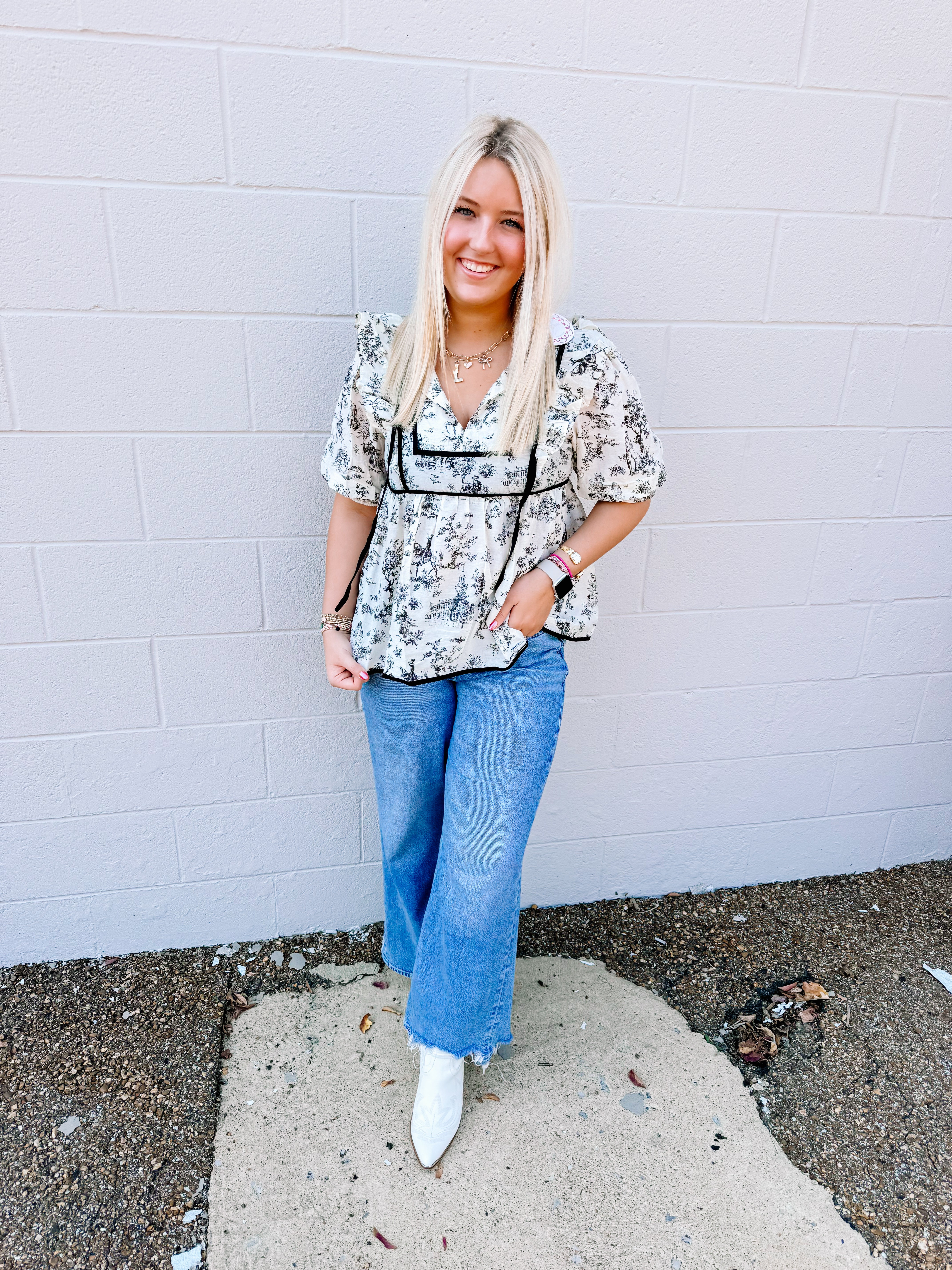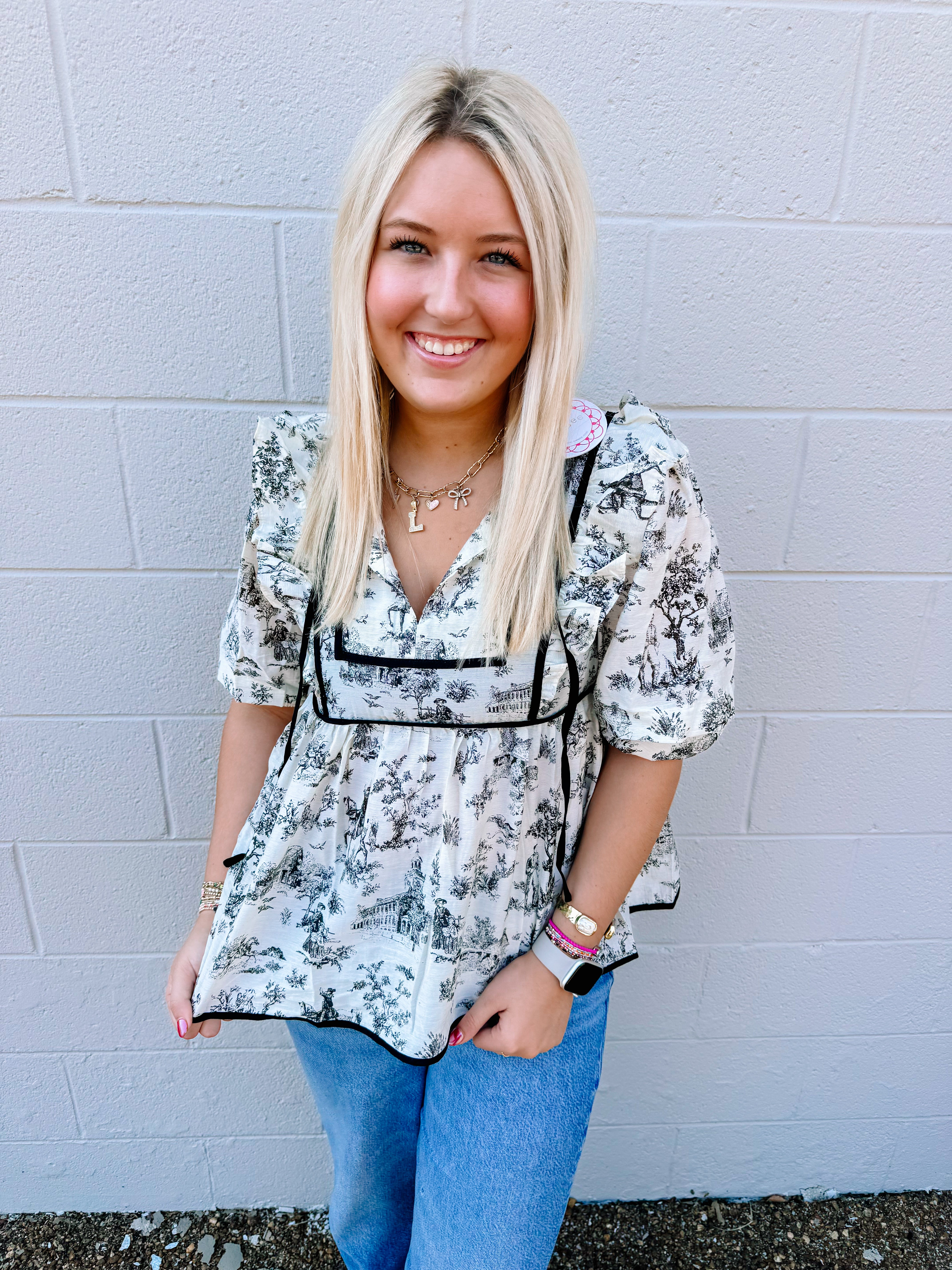 The prettiest Thanksgiving top EVER! Stop what your doing an order this top for all your Fall + Thanksgiving events. Trust me, you'll get all the compliments. Our Thankful Top has no lining but isn't see through. It's featuring the most popular Chinoiserie Landscape design with a contrast piping and a beautiful fit.