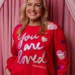 - Red cotton terry sweatshirt fabric features an important reminder in iridescent appliqué and sequins: "You Are Loved” bible verse from Ephesians 1:6 in the Bible