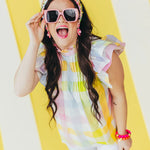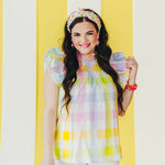- Features a playful mix of colors and large-scale gingham and pleated neckline