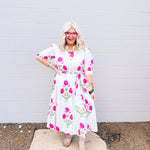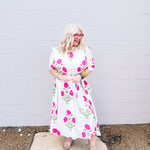 The Heart of Grace Pink Floral Midi Dress combines timeless elegance with comfortable wearability. Crafted from white fabric that is non-see-through, this midi-length dress features a delicate pink floral pattern, embodying the best-selling style from Heart of Grace. Available in sizes S to 3X, it offers a true-to-size fit with a bit of extra room for ease of movement. Ideal for those seeking a refined yet relaxed silhouette, this dress balances classic charm with practical design.