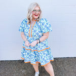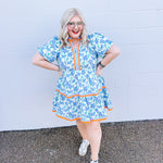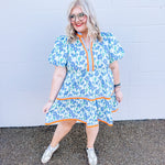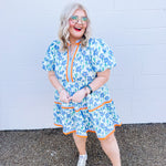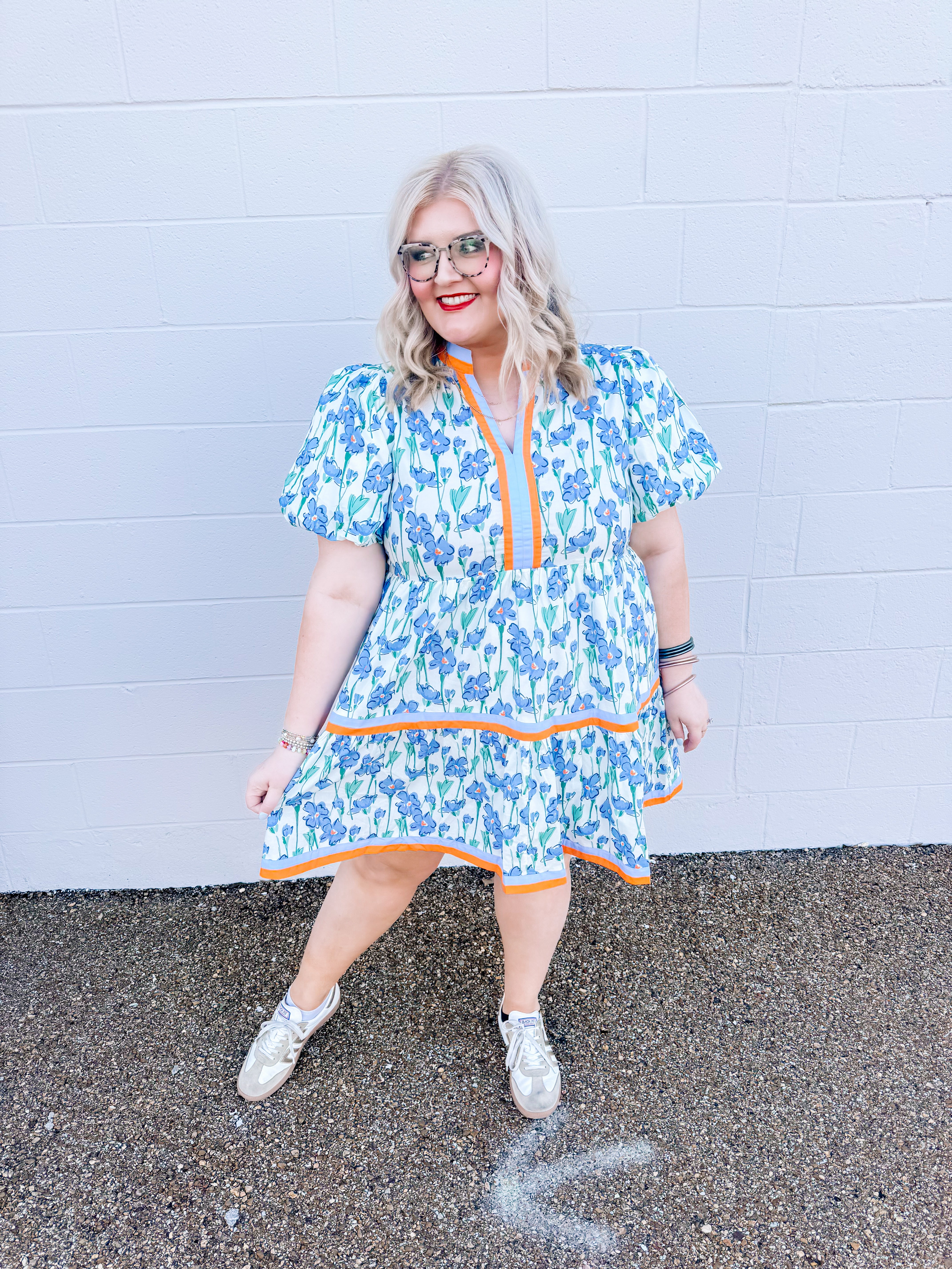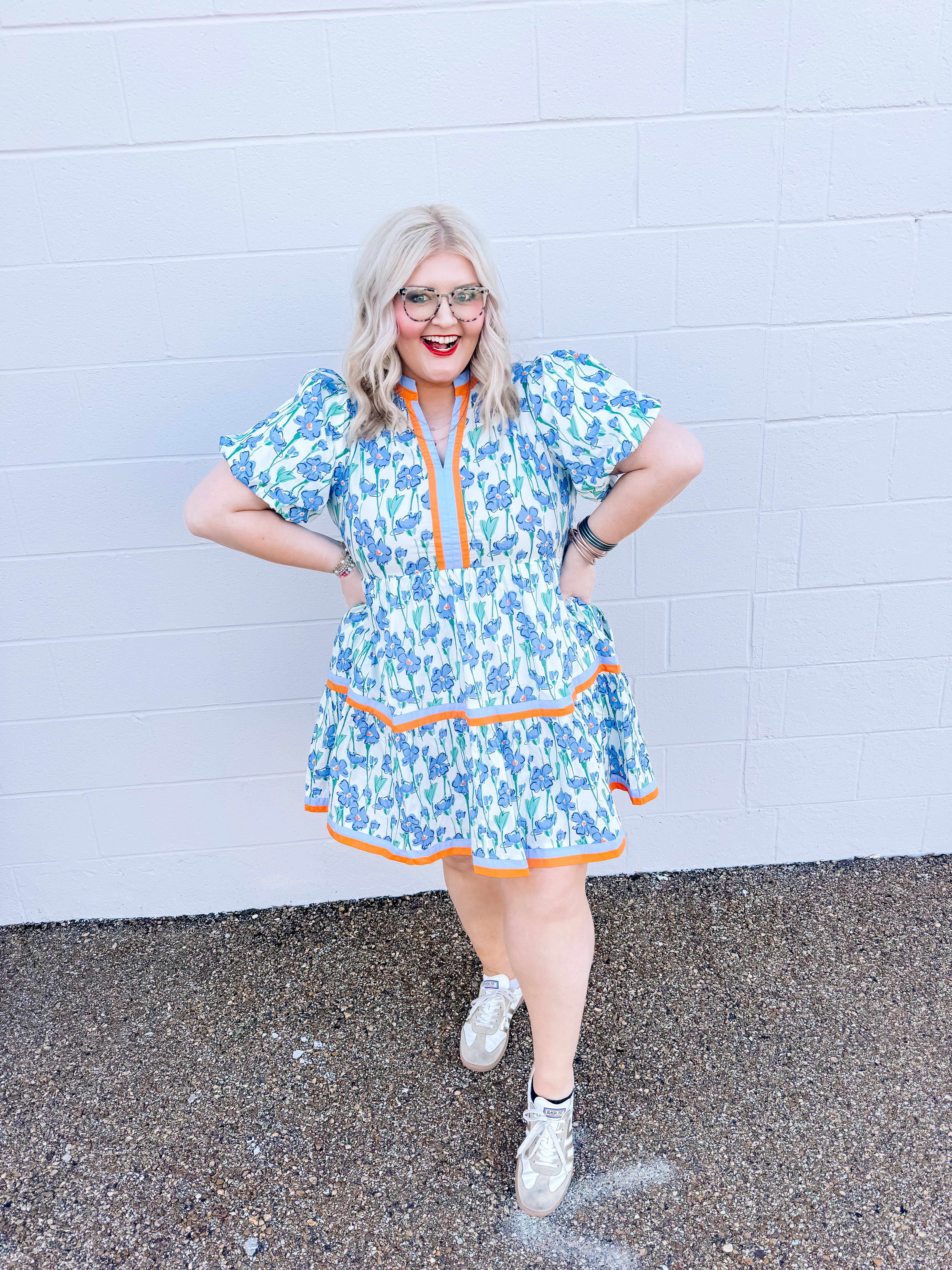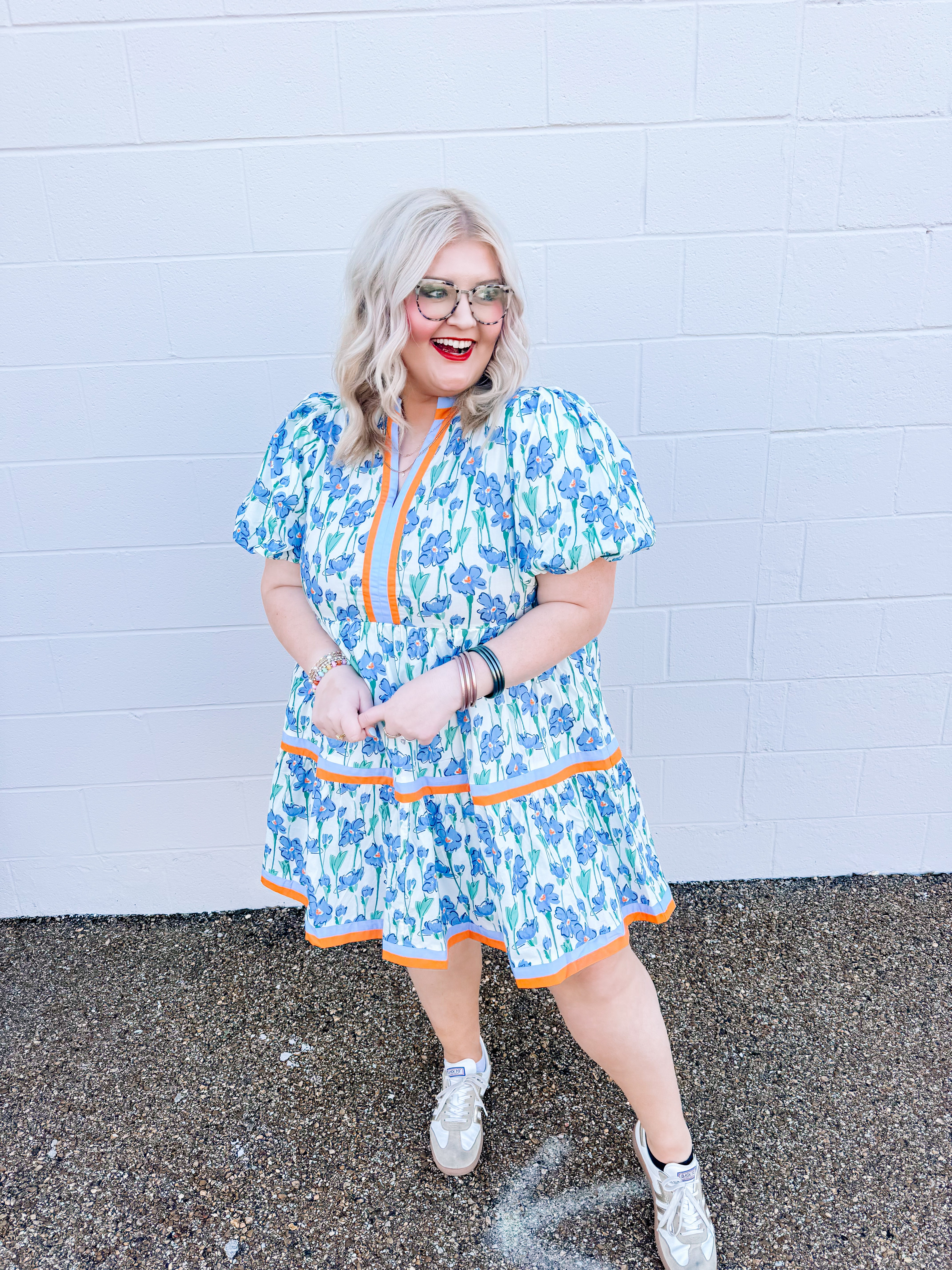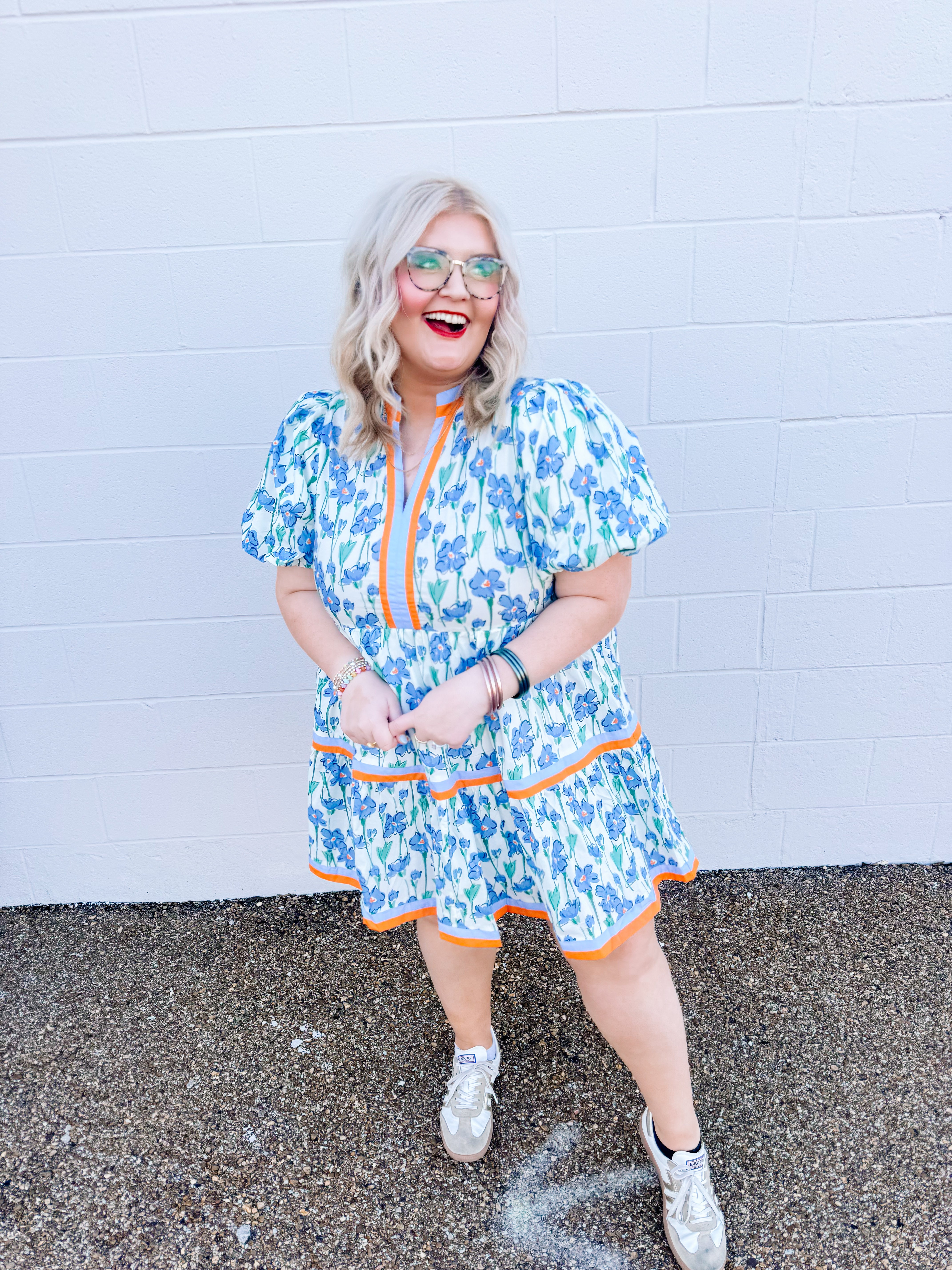 Welcome to the Lily Lane Dress! This blue floral dress with orange accents is perfect for church and weddings.