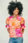 The Mauve Blouse features short ruffled sleeves and intricate embroidery along the neckline and hem bringing a touch of femininity to this bold statement piece.