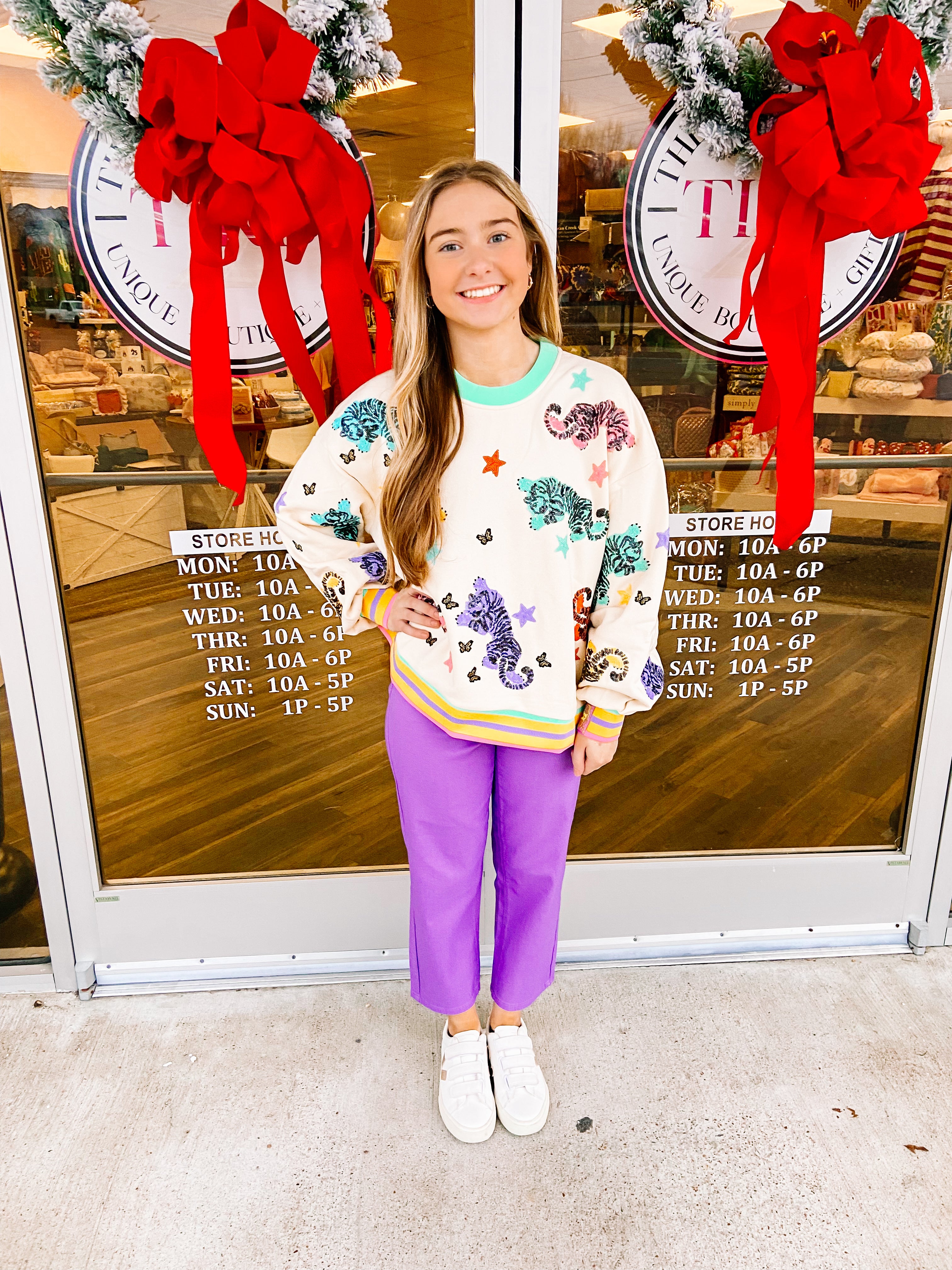Roar into style with this standout sweatshirt! Featuring a playful blend of tigers and stars, this sweatshirt will keep you warm and stylish. Perfect for any casual outing or lounging at home. Get ready to be the coolest cat in the jungle!