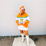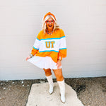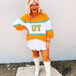 Celebrate your Tennessee pride with the Queen of Sparkle Licensed Tennessee Colorblock Jewel Crew. This oversized long-sleeve features hand-sewn jewels artfully arranged on a vibrant orange and white colorblock design, accented with dashes of Summit Blue. Crafted for both comfort and standout style, it offers a unique blend of bold colors and intricate detailing, perfect for showcasing your team spirit with expert flair.