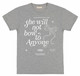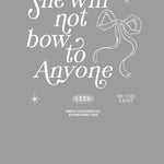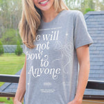Heather grey short sleeve shirt with the phrase 'She will not bow to anything'. Simply Southern logo below. 98% cotton / 2% polyester blend.