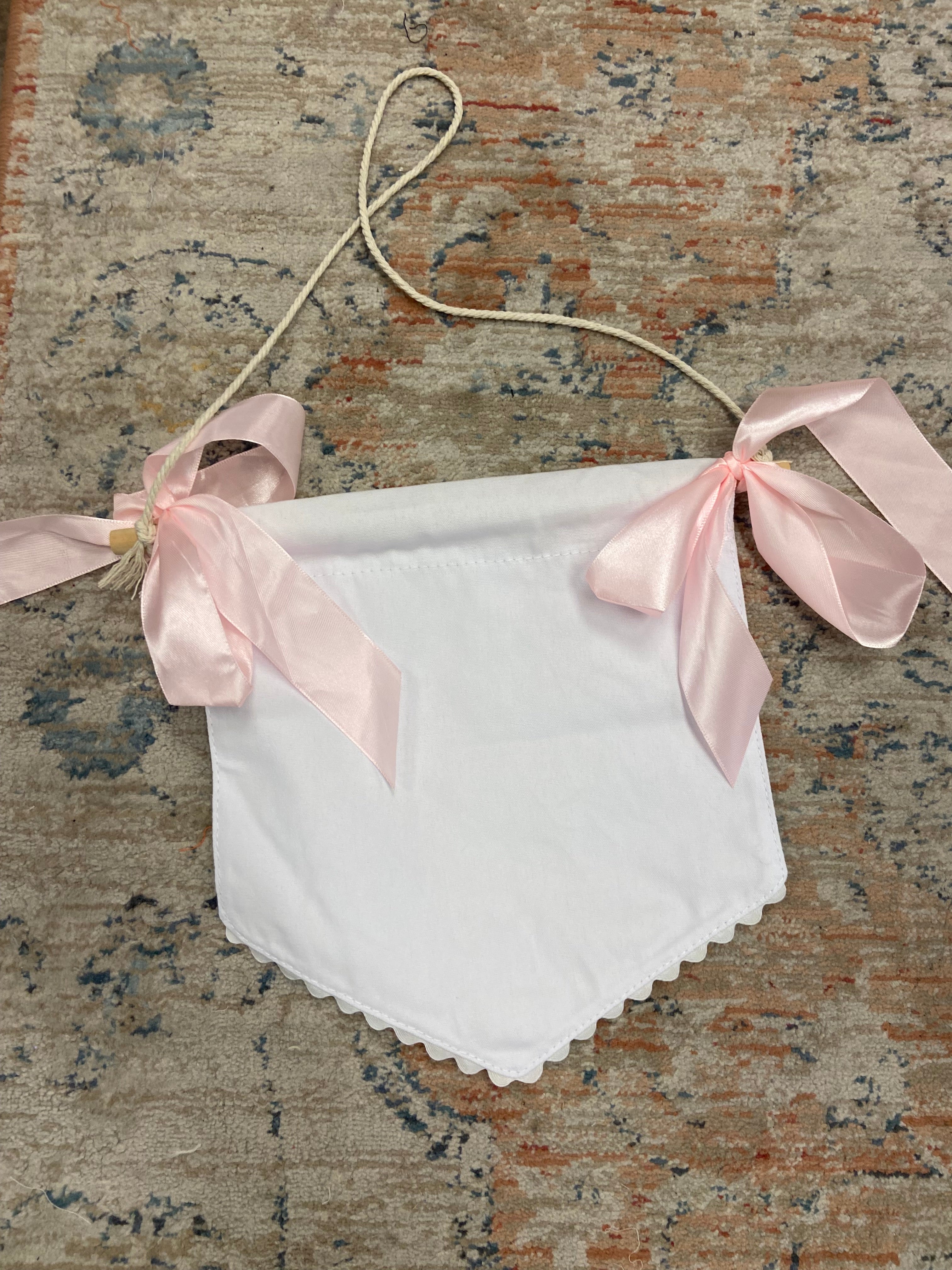 Celebrate the arrival of your baby girl with this charming banner. Featuring a crisp white background adorned with delicate pink bows, this banner adds a sweet touch to nurseries, baby showers, or gender reveal celebrations. The decorative rick rack edges provide a classic, handmade feel that complements any décor style. Perfect for photo backdrops or hanging above a crib, this banner is an easy way to personalize your space with timeless elegance.