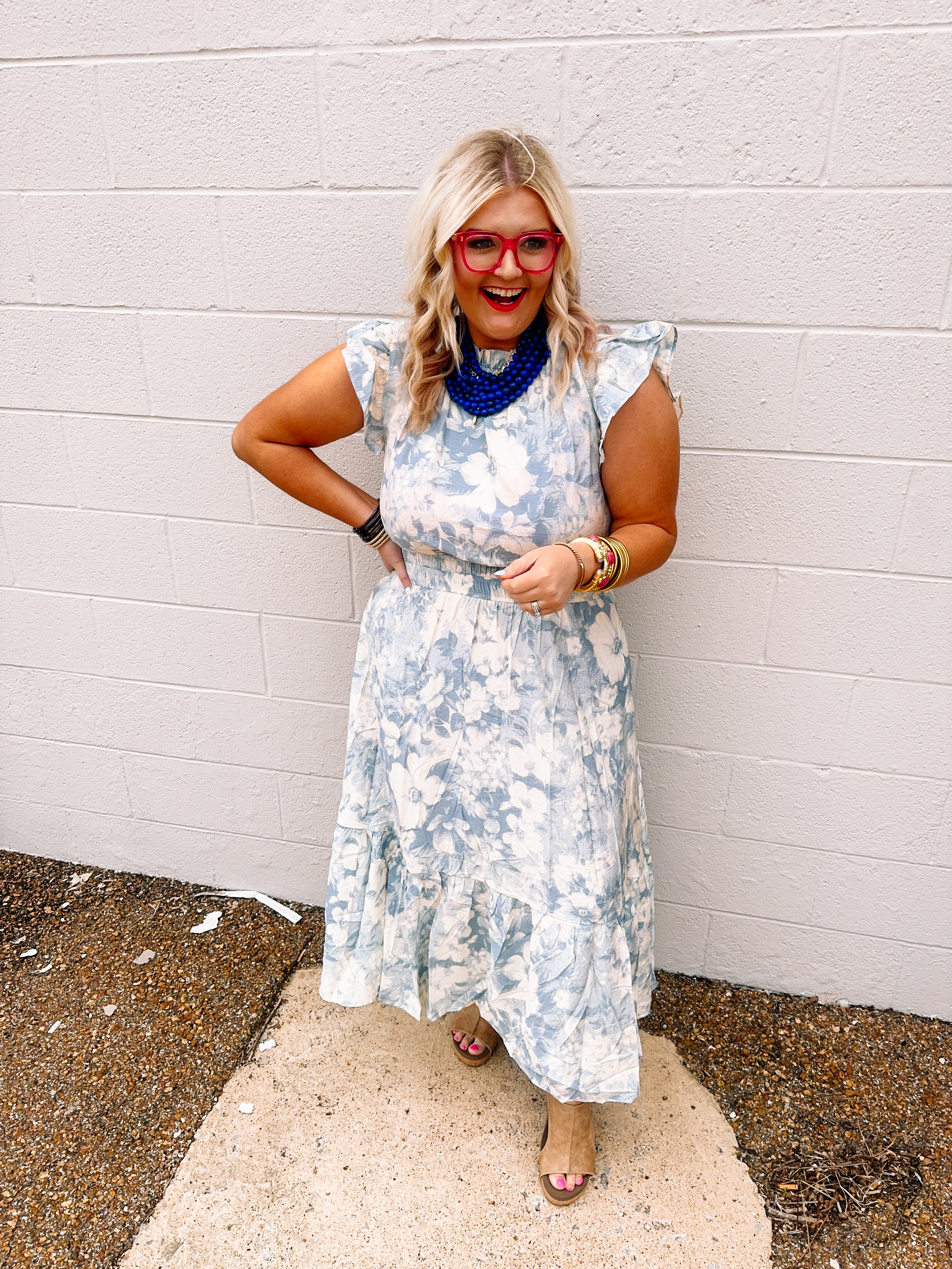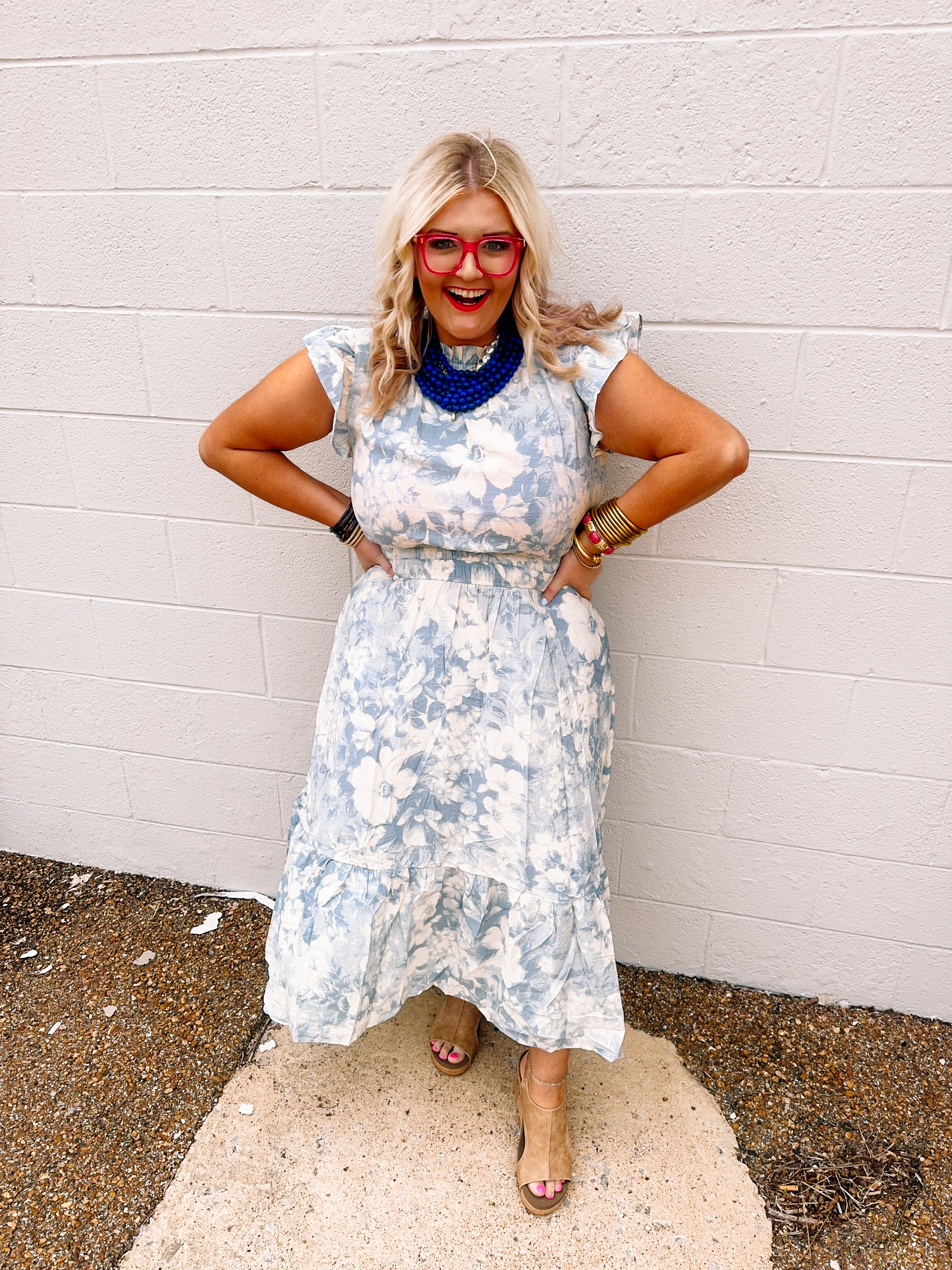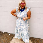 Effortless elegance meets everyday comfort in this charming midi dress. Soft light blue fabric provides a serene backdrop for delicate white floral details that add visual interest and romantic appeal. The ruffle cap sleeves frame the shoulders with playful movement, while the mock neck offers a polished, modest neckline. A smocked waistband cinches gently at the middle, creating flattering definition without restriction. Practical pockets keep your essentials close at hand. Perfect for casual outings, garden parties, or weekend adventures, this dress transitions seamlessly from day to evening. The midi length offers timeless sophistication with modern touches that make it a versatile staple for any season.