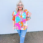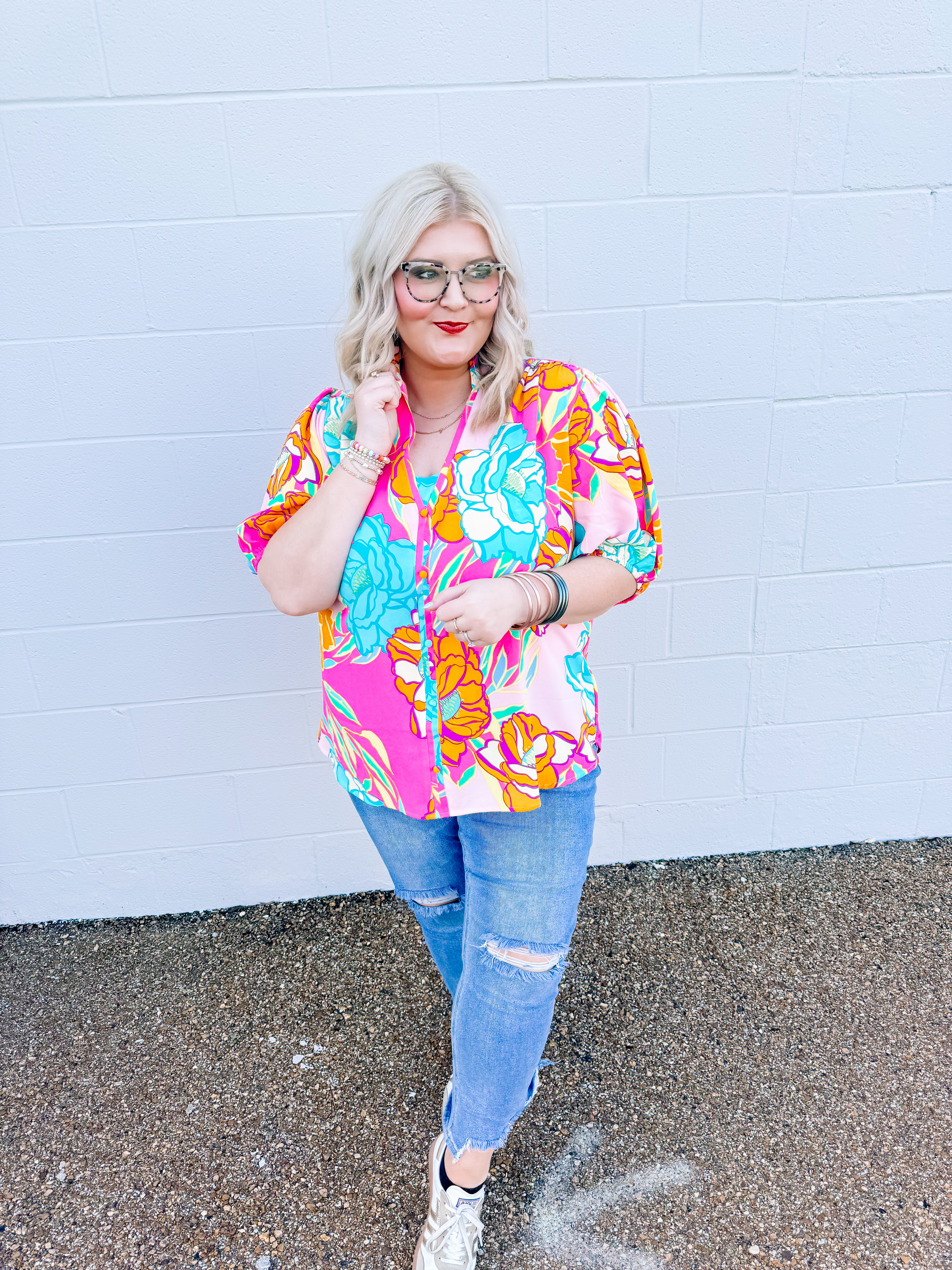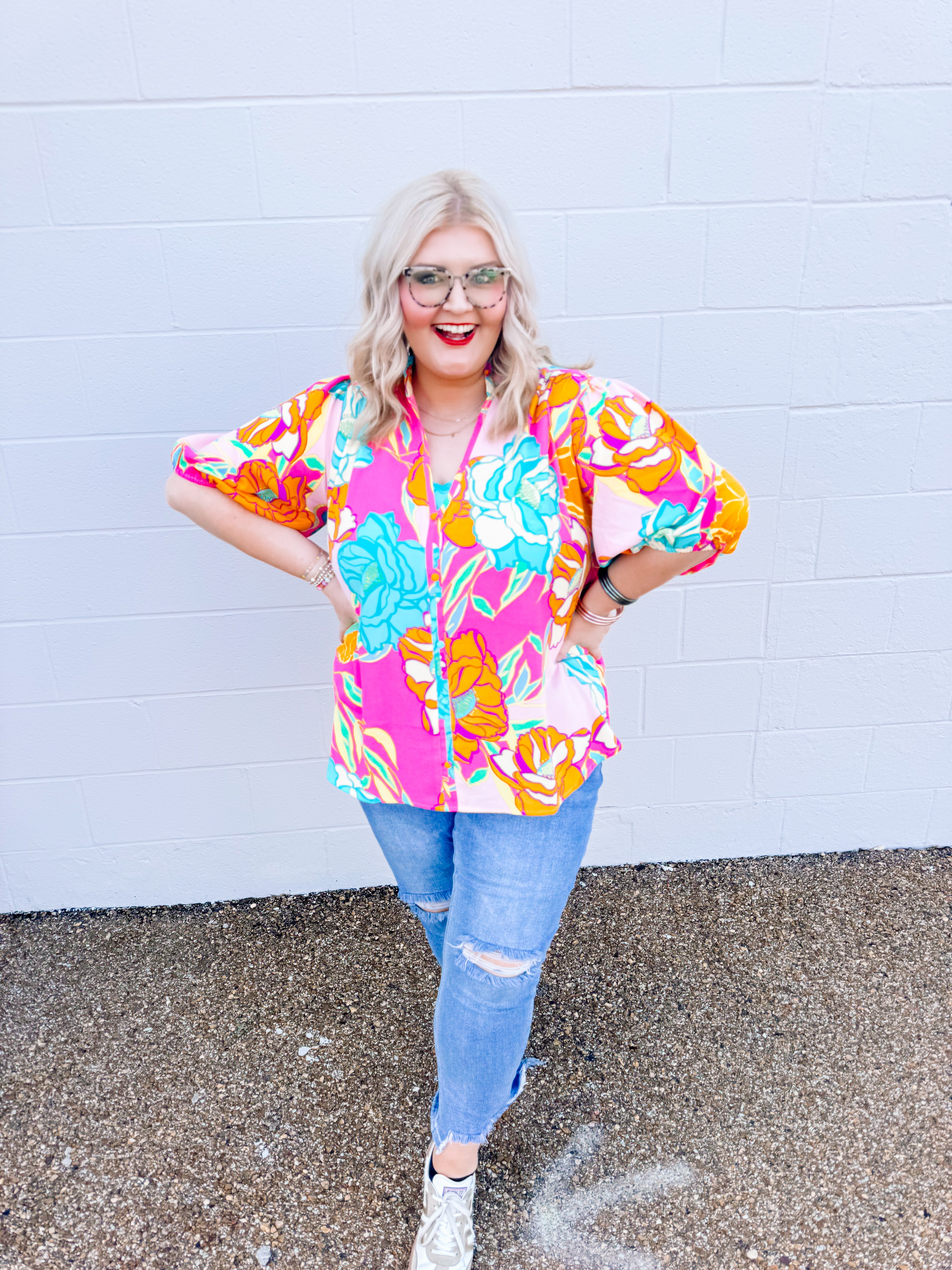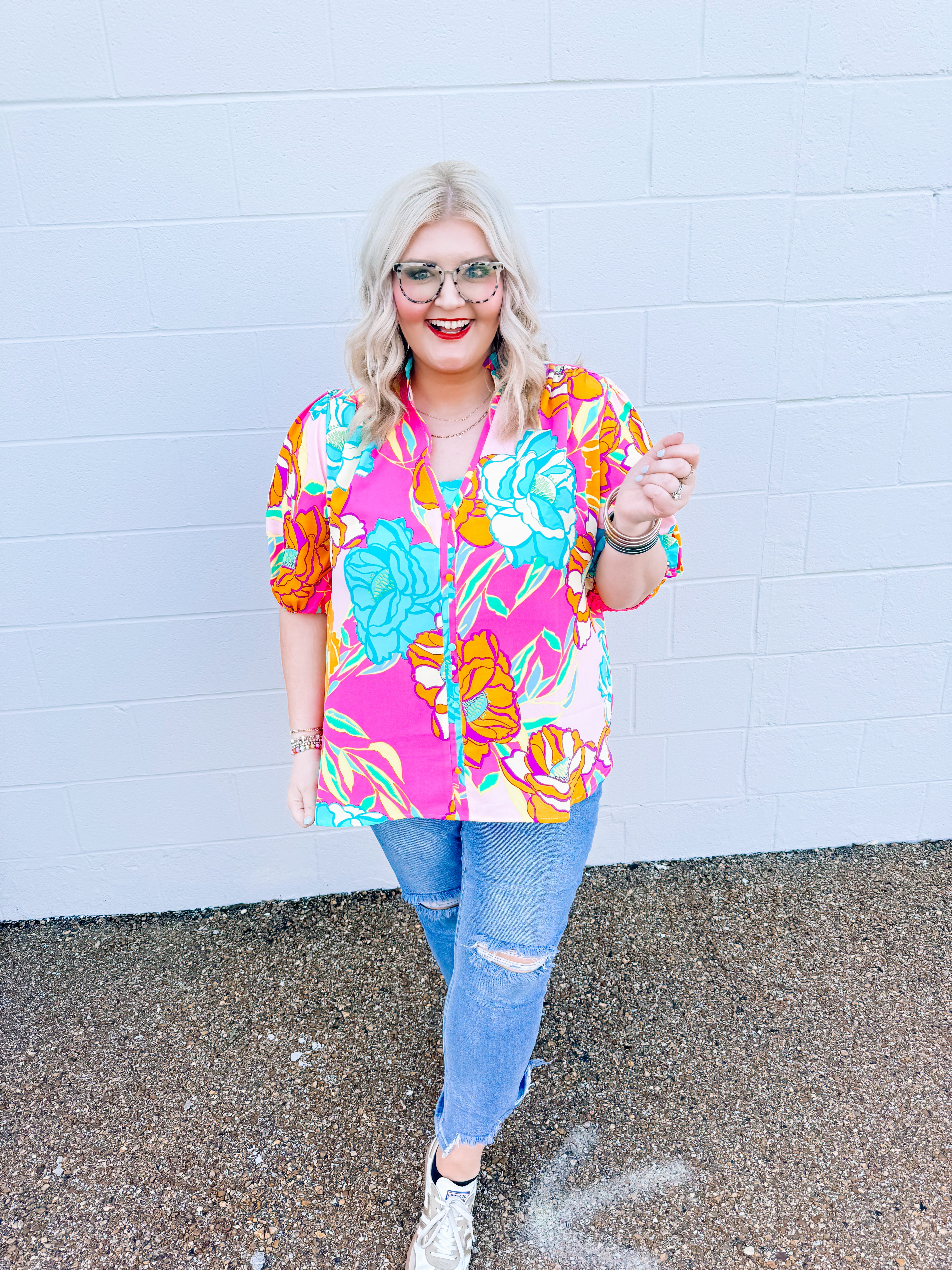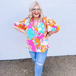 Welcome to the Bubbly Breeze Top. This colorful pink top with faux buttons down the front is great for all our Spring girls. It is great for work or a night on the town especially with its 3/4" sleeve.