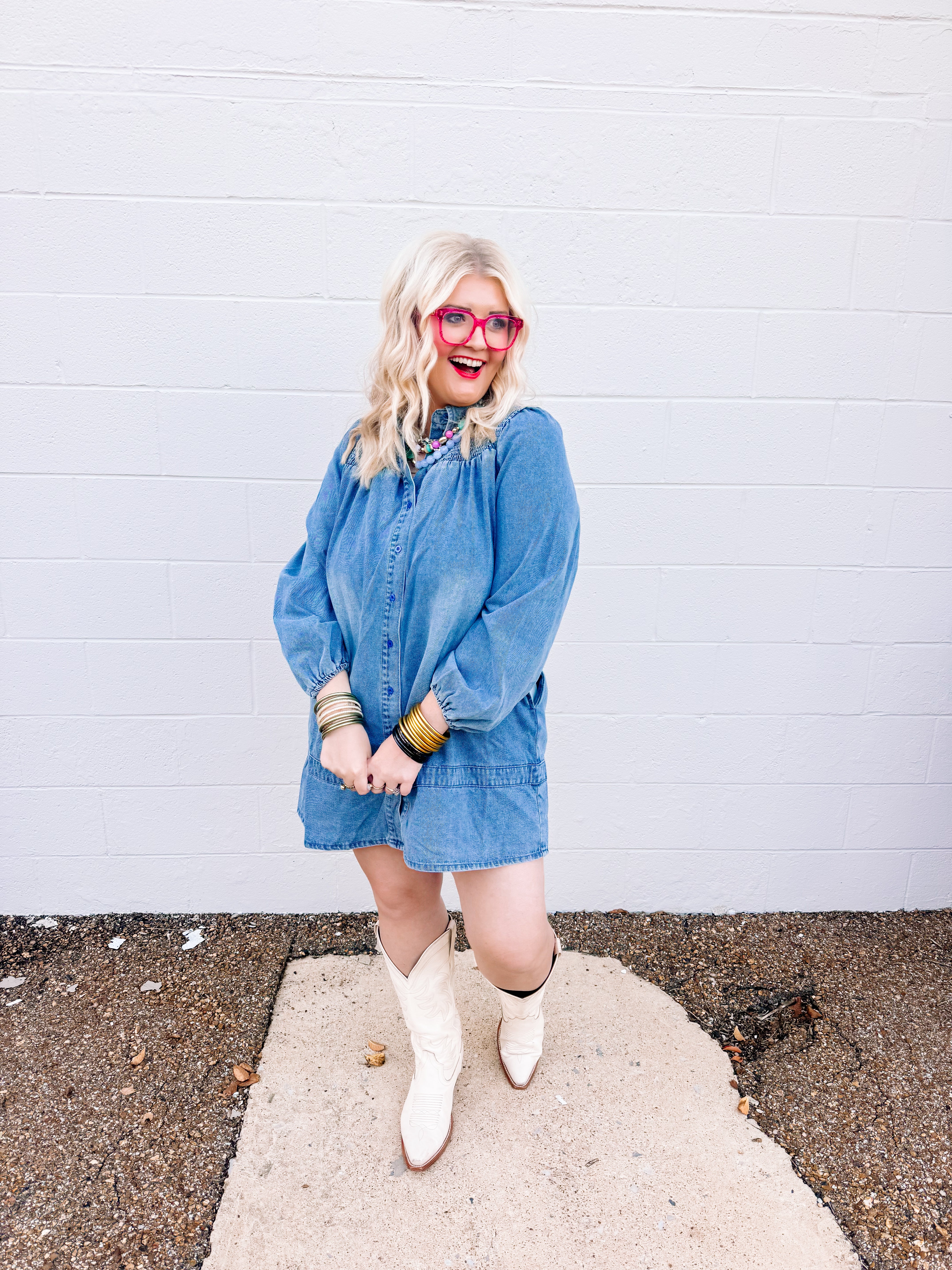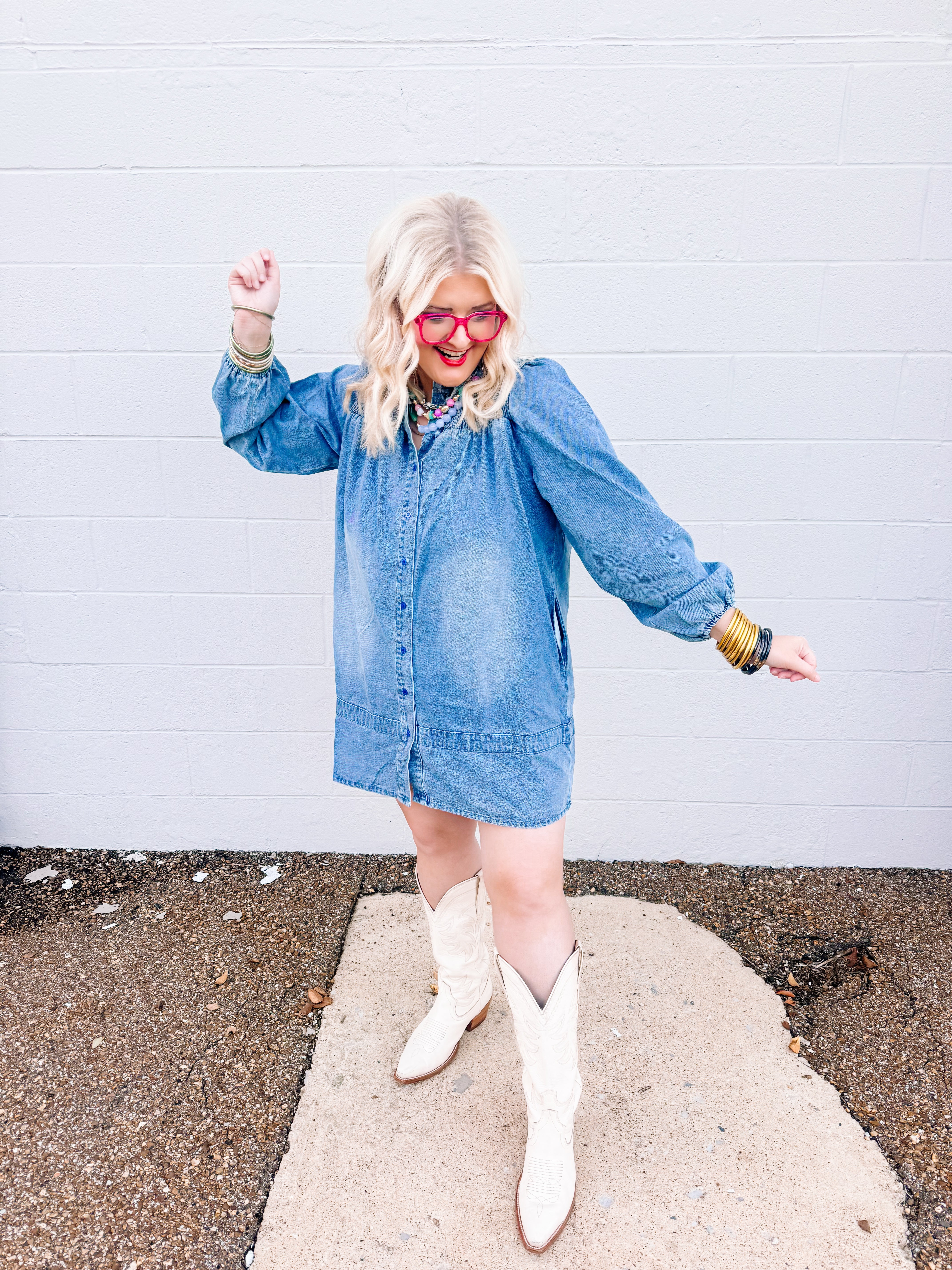 Elevate your denim collection with this Carole Christian smocked dress, a sophisticated take on a classic silhouette. Featuring expertly crafted smocking at the shoulders and upper chest, this piece combines structured tailoring with refined detail. The button-up front, crisp collar, and long sleeves create a polished, versatile foundation perfect for layering or wearing solo. A timeless investment piece that transitions seamlessly from casual to elevated styling.