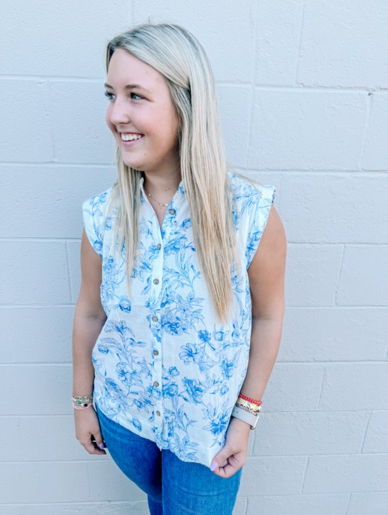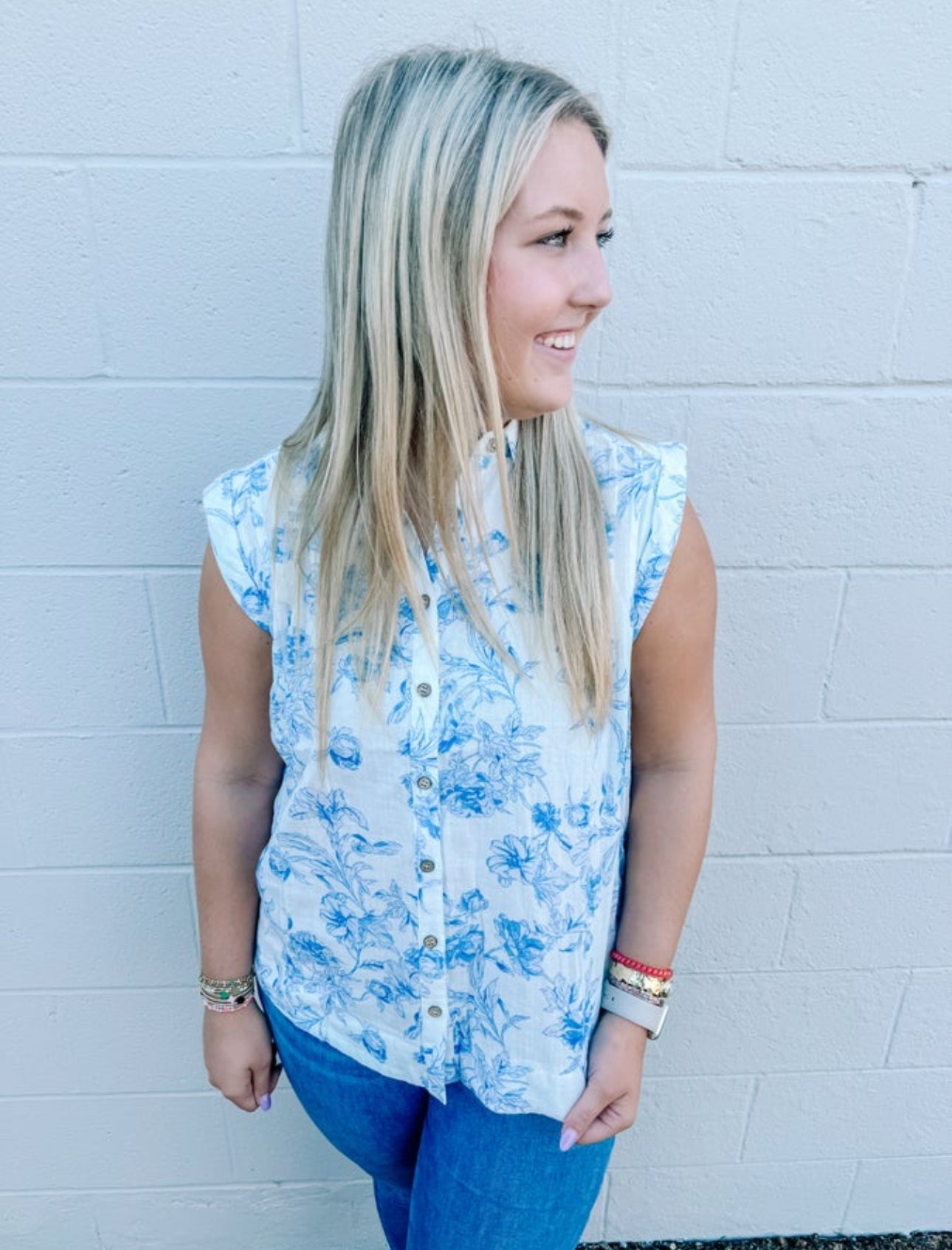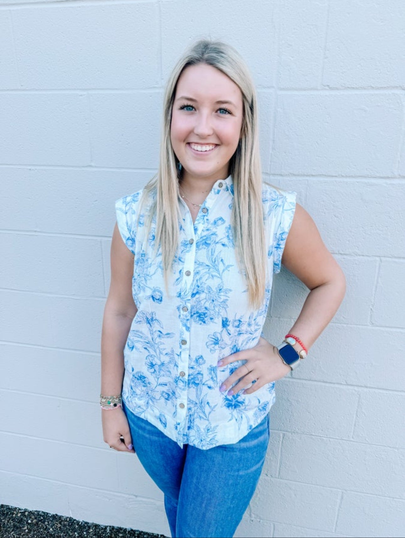 This beautiful blue and white print has been the IT print for the entire 2024 season. This style top is a great style to carry over into Fall with some darker denim. This top will also pair great with a jacket.