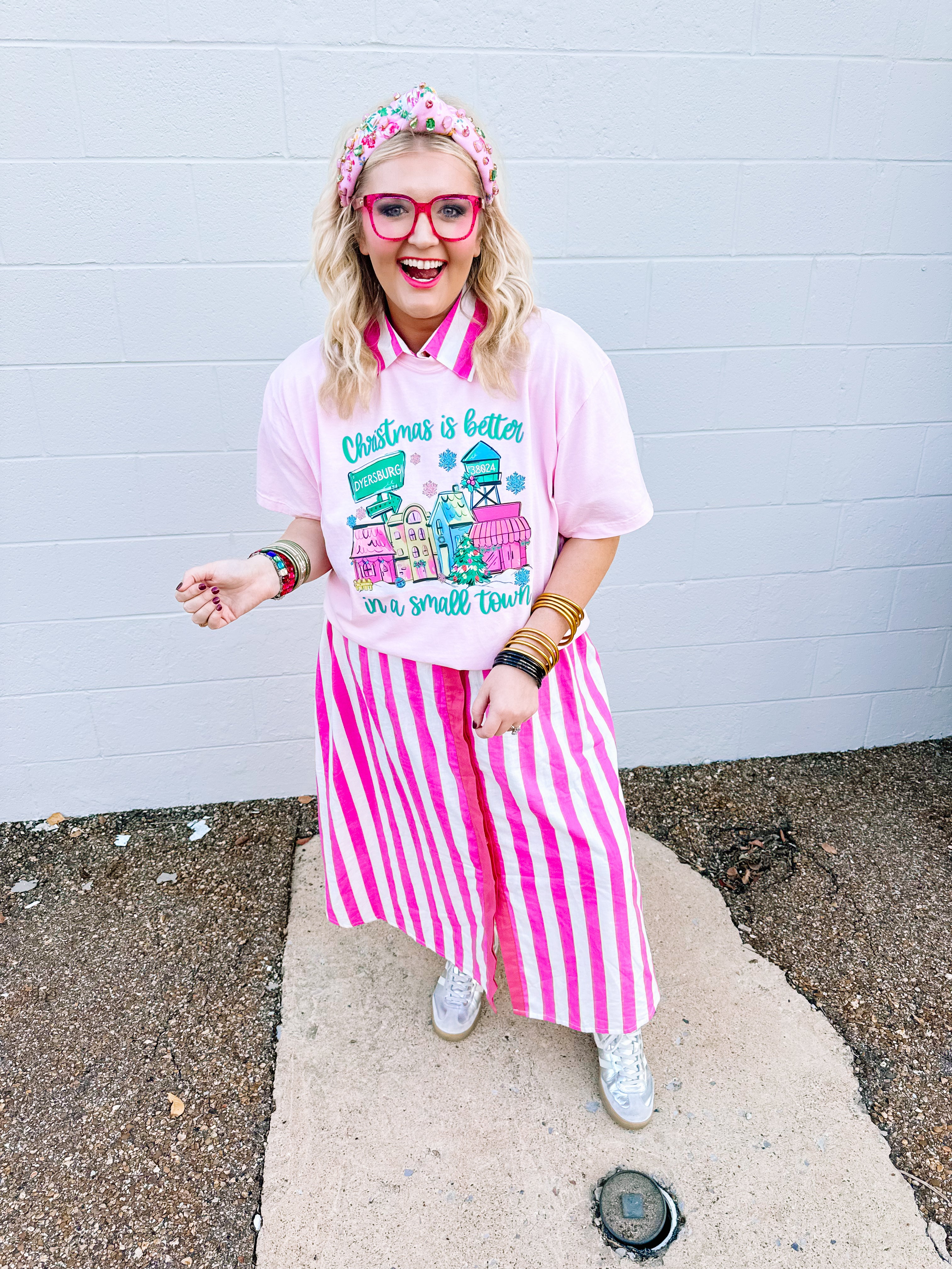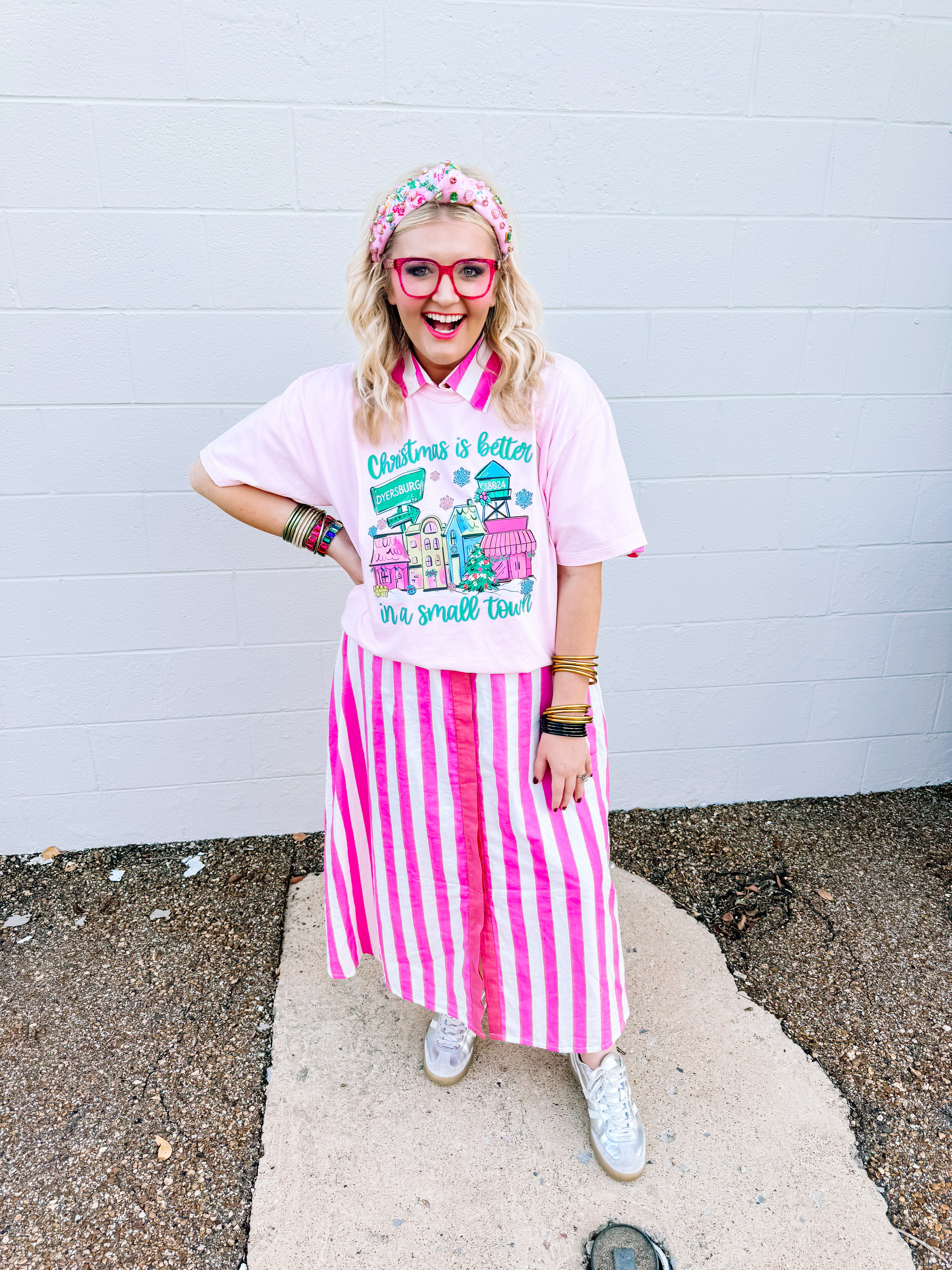 Celebrate the charm of small-town holidays with this nostalgic pink tee featuring beloved Dyersburg, Tennessee landmarks. The design showcases iconic local shops and the distinctive water tower emblazoned with zip code 38024—a perfect tribute to community spirit and holiday traditions. Ideal for locals and visitors alike who cherish that warm, intimate feeling of Christmas in a close-knit town.
