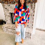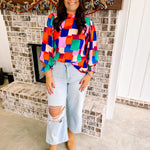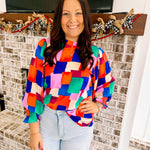 Grab this one for all your events! Pairs so nice with jeans and colored pants. Featuring a mock neck style with smocked sleeve that bell out!