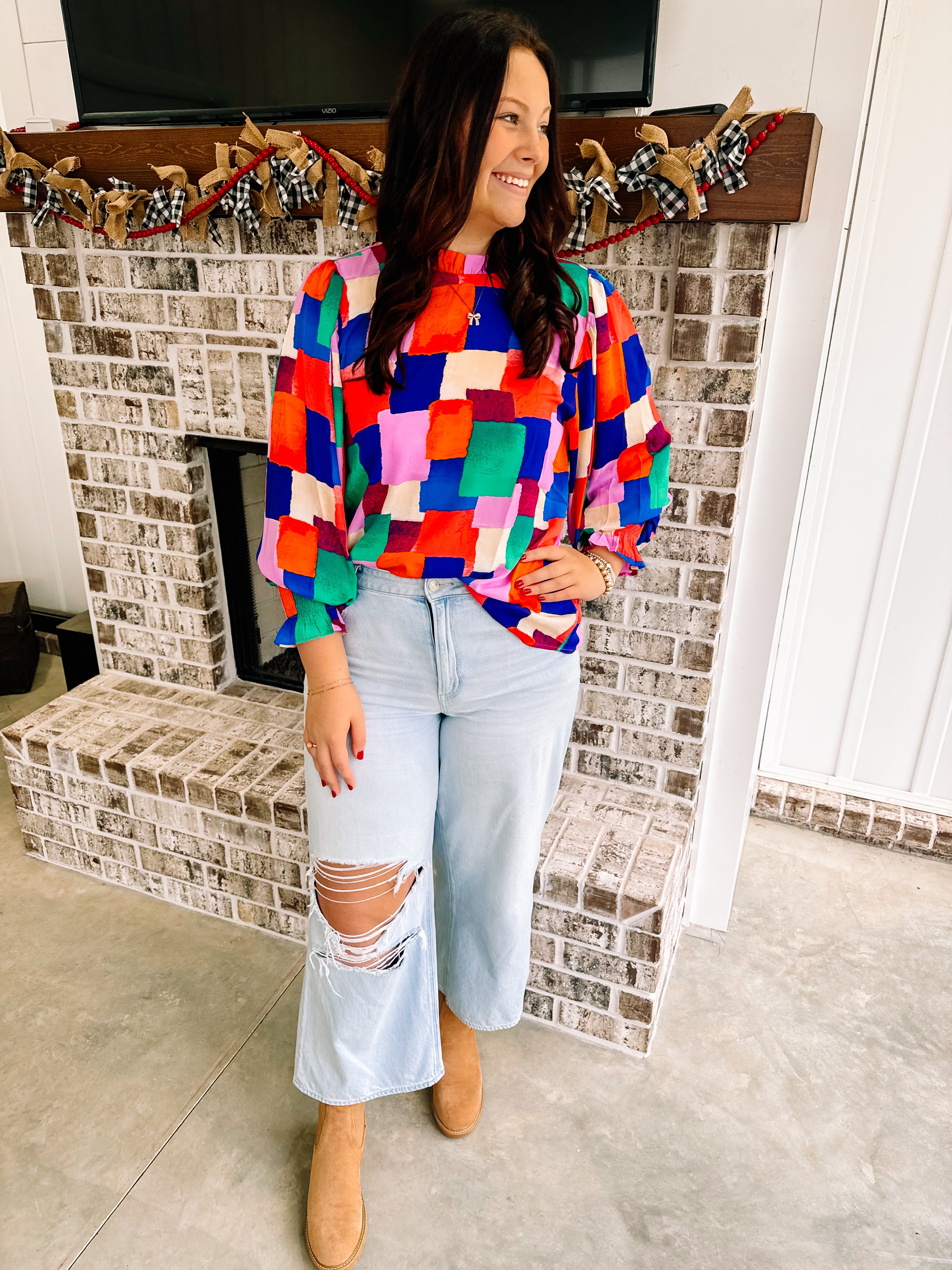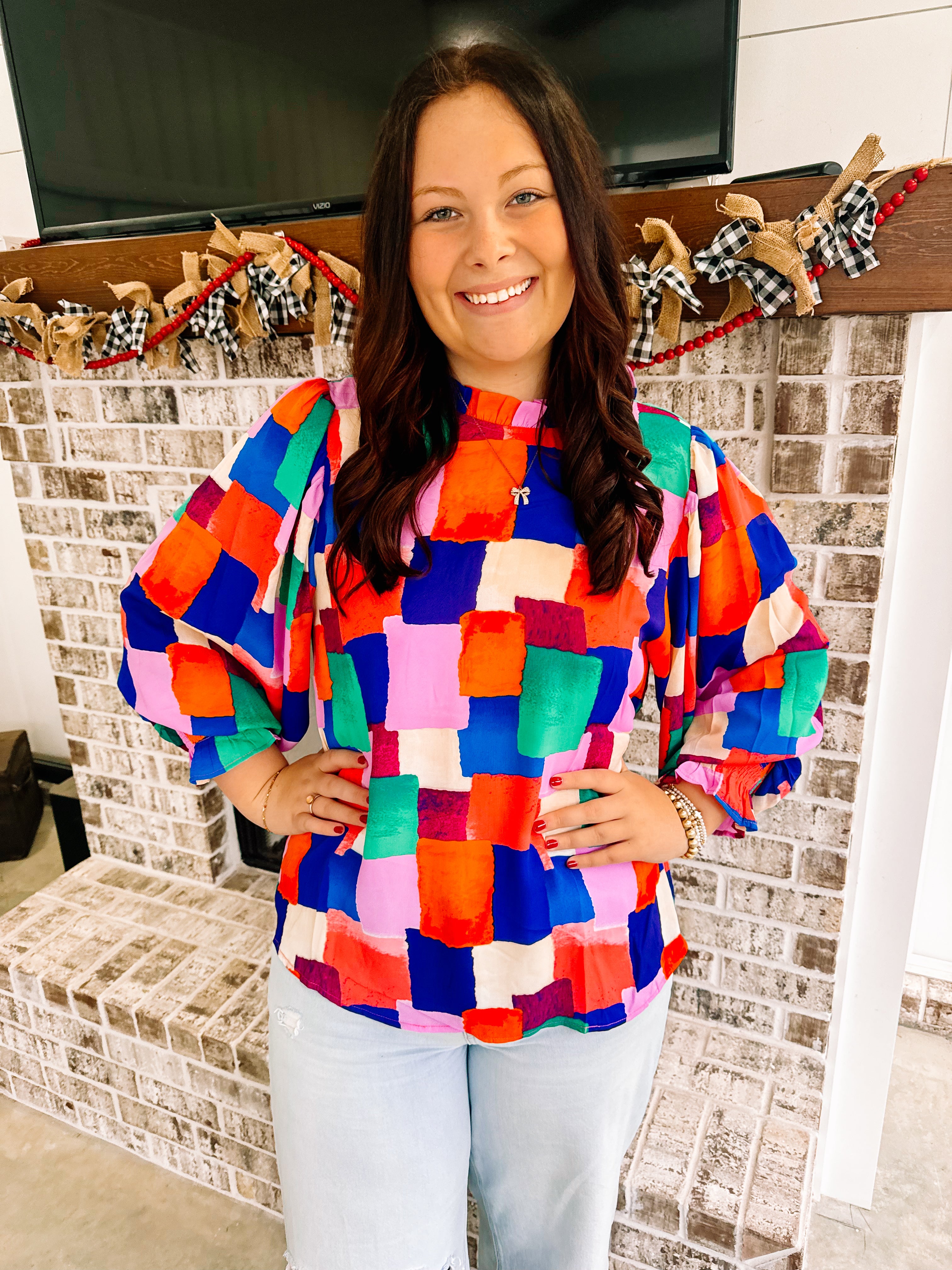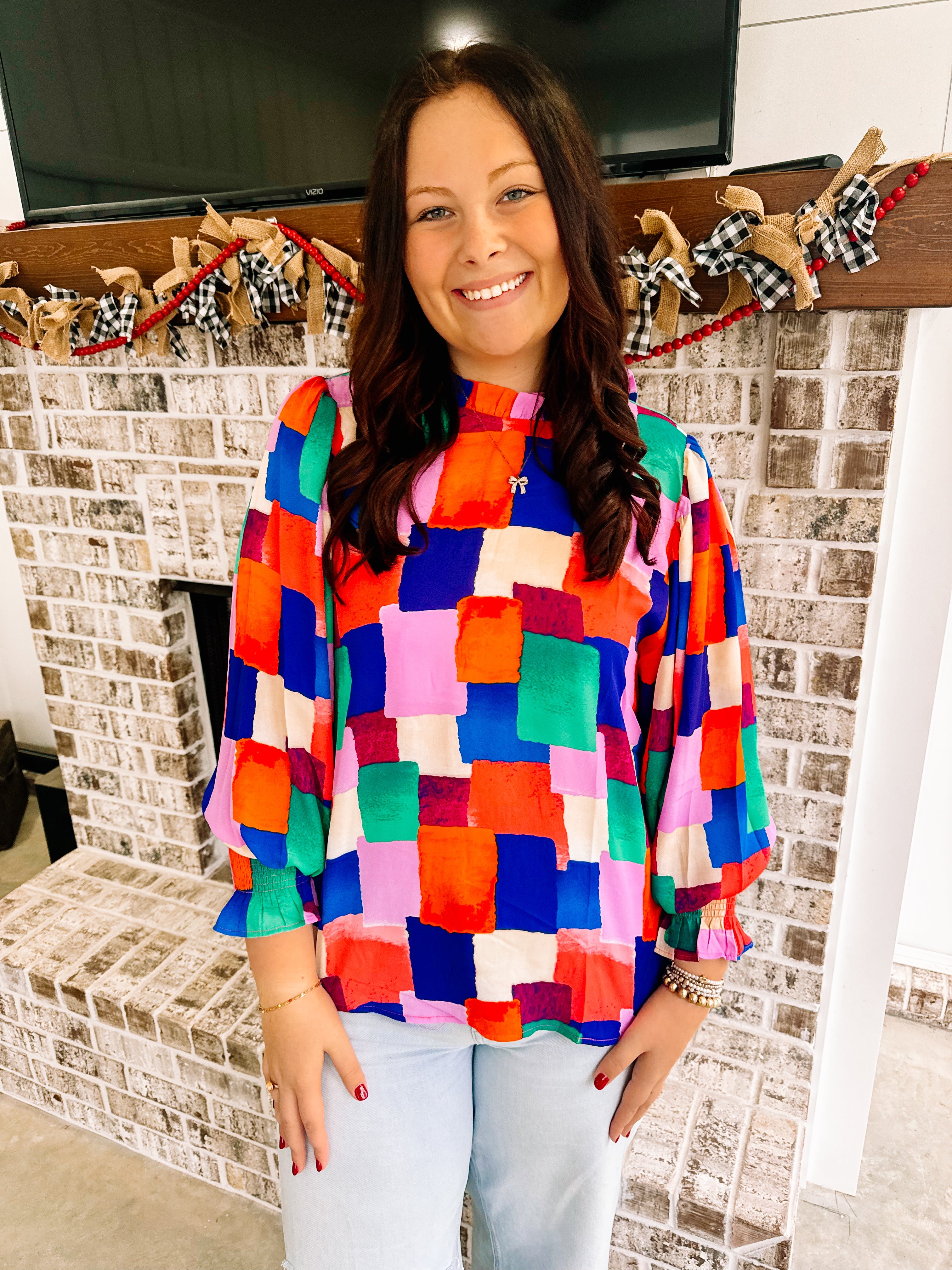 Grab this one for all your events! Pairs so nice with jeans and colored pants. Featuring a mock neck style with smocked sleeve that bell out!