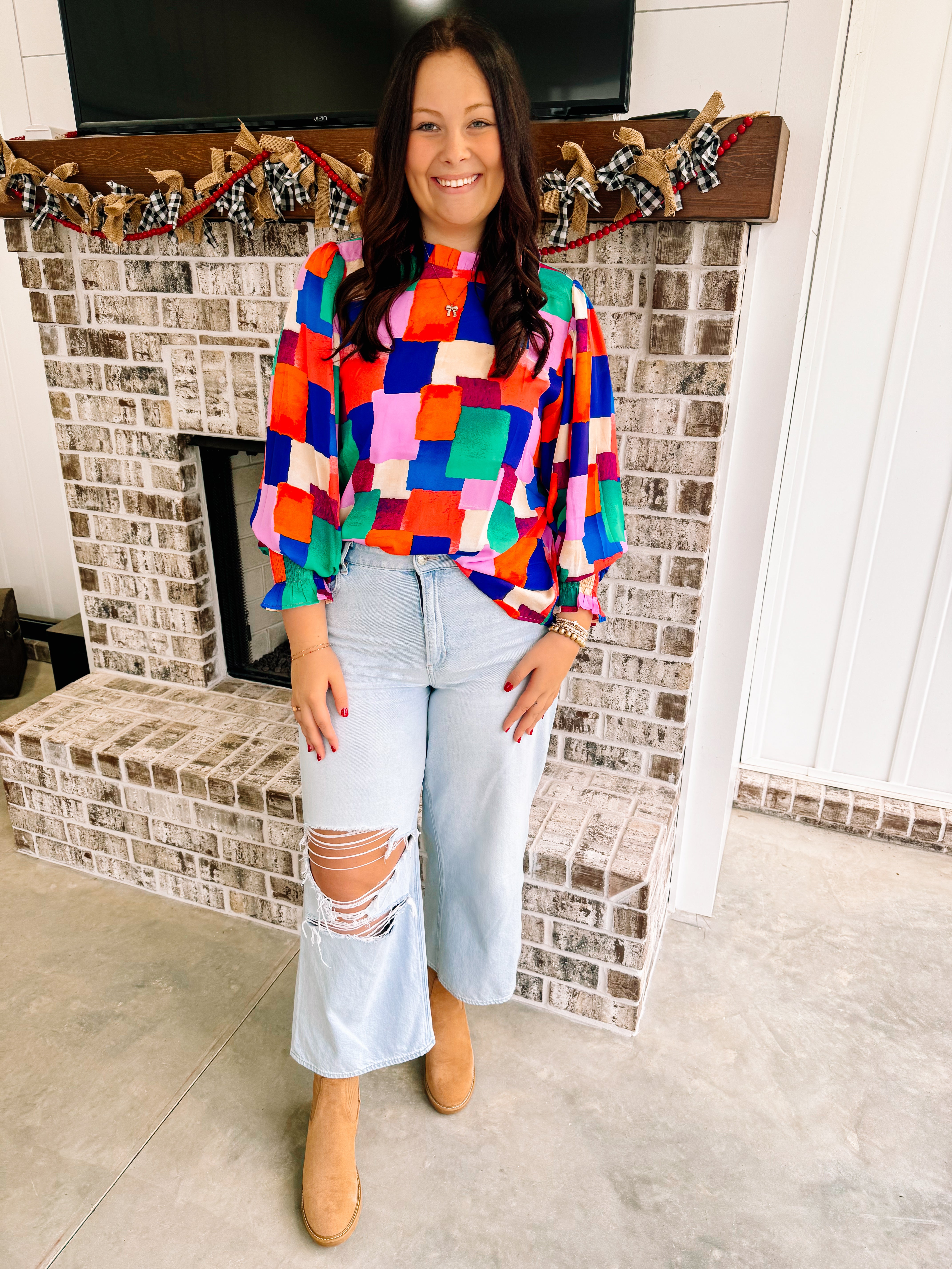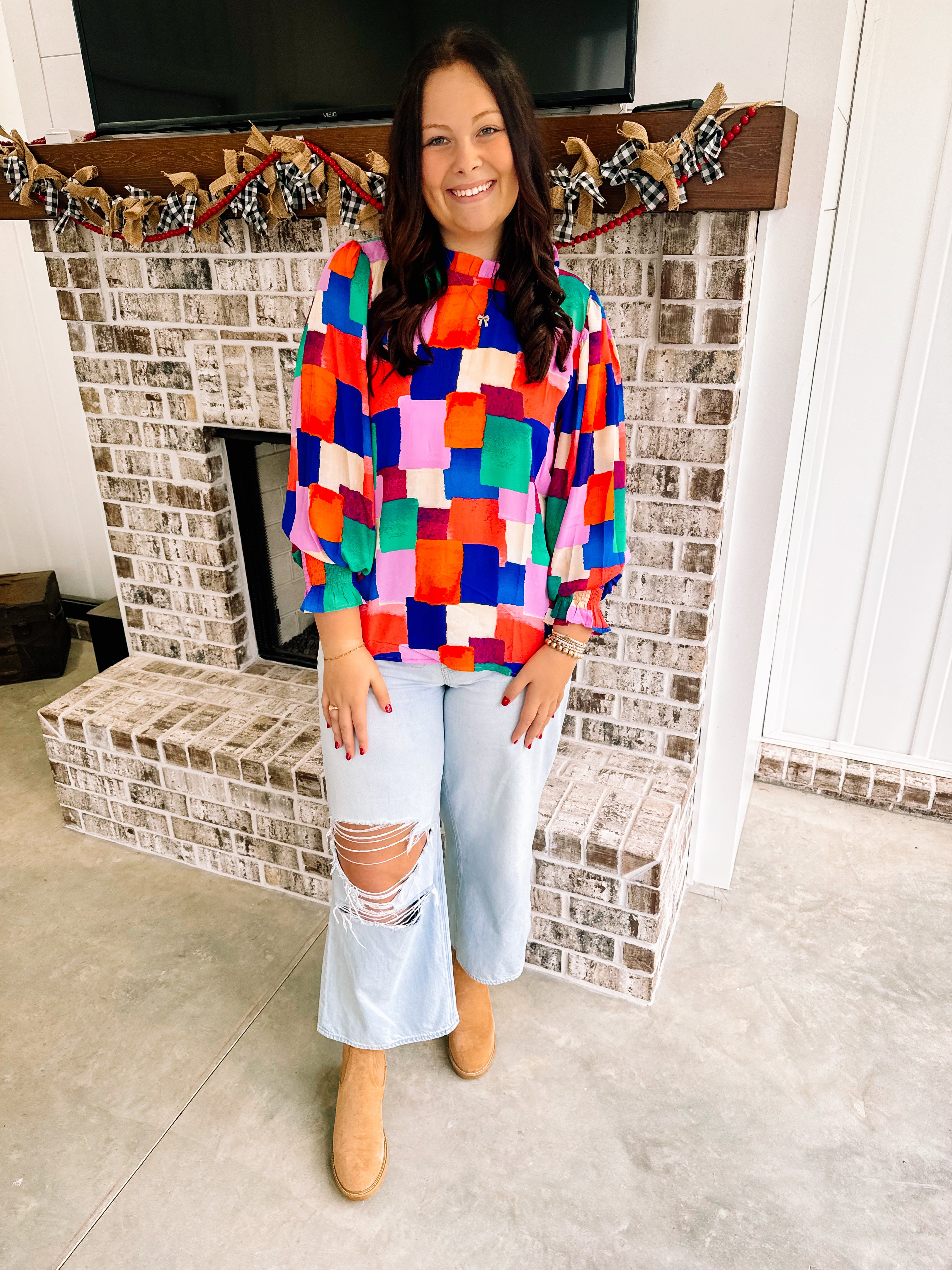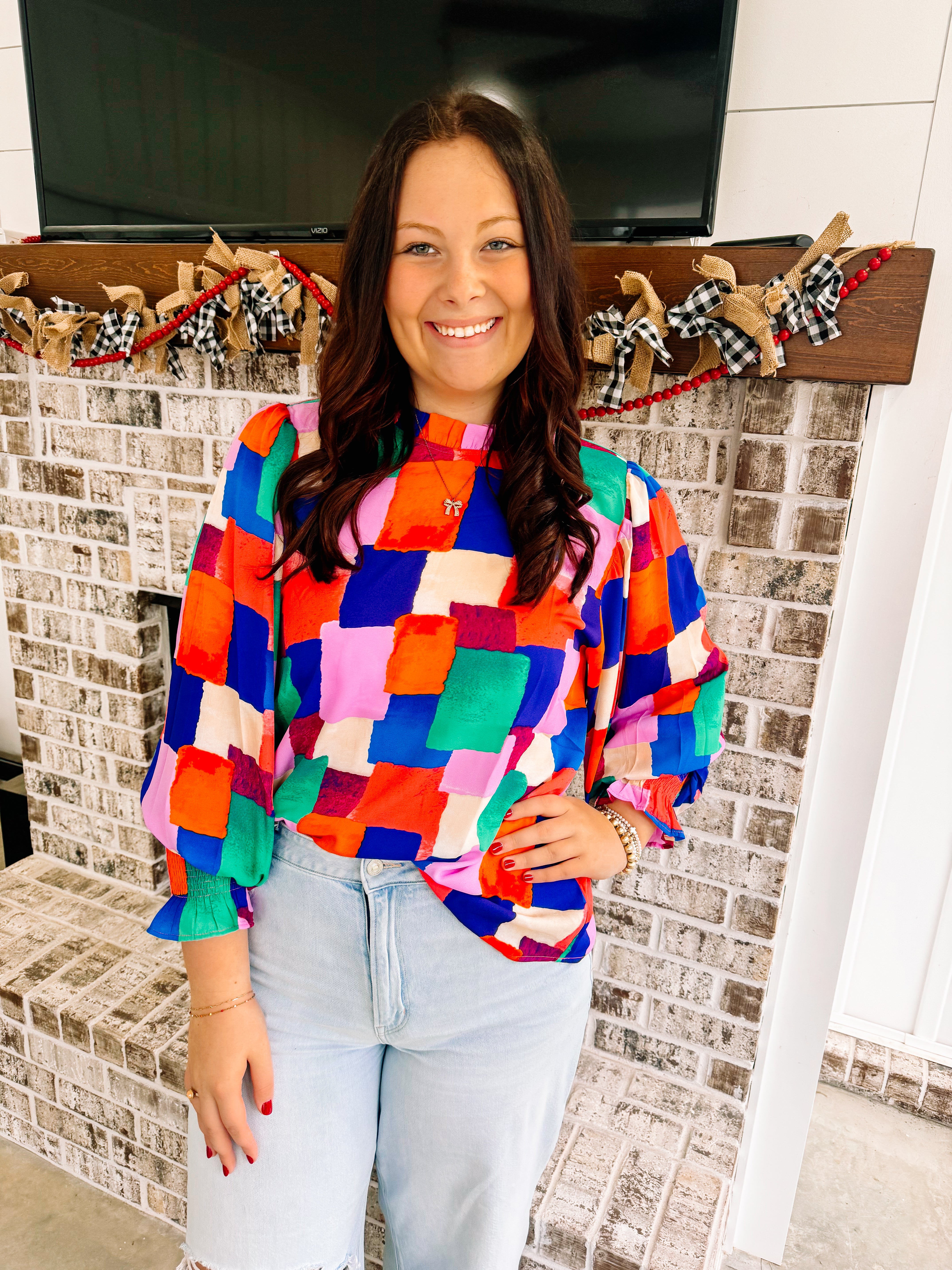 Grab this one for all your events! Pairs so nice with jeans and colored pants. Featuring a mock neck style with smocked sleeve that bell out!