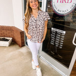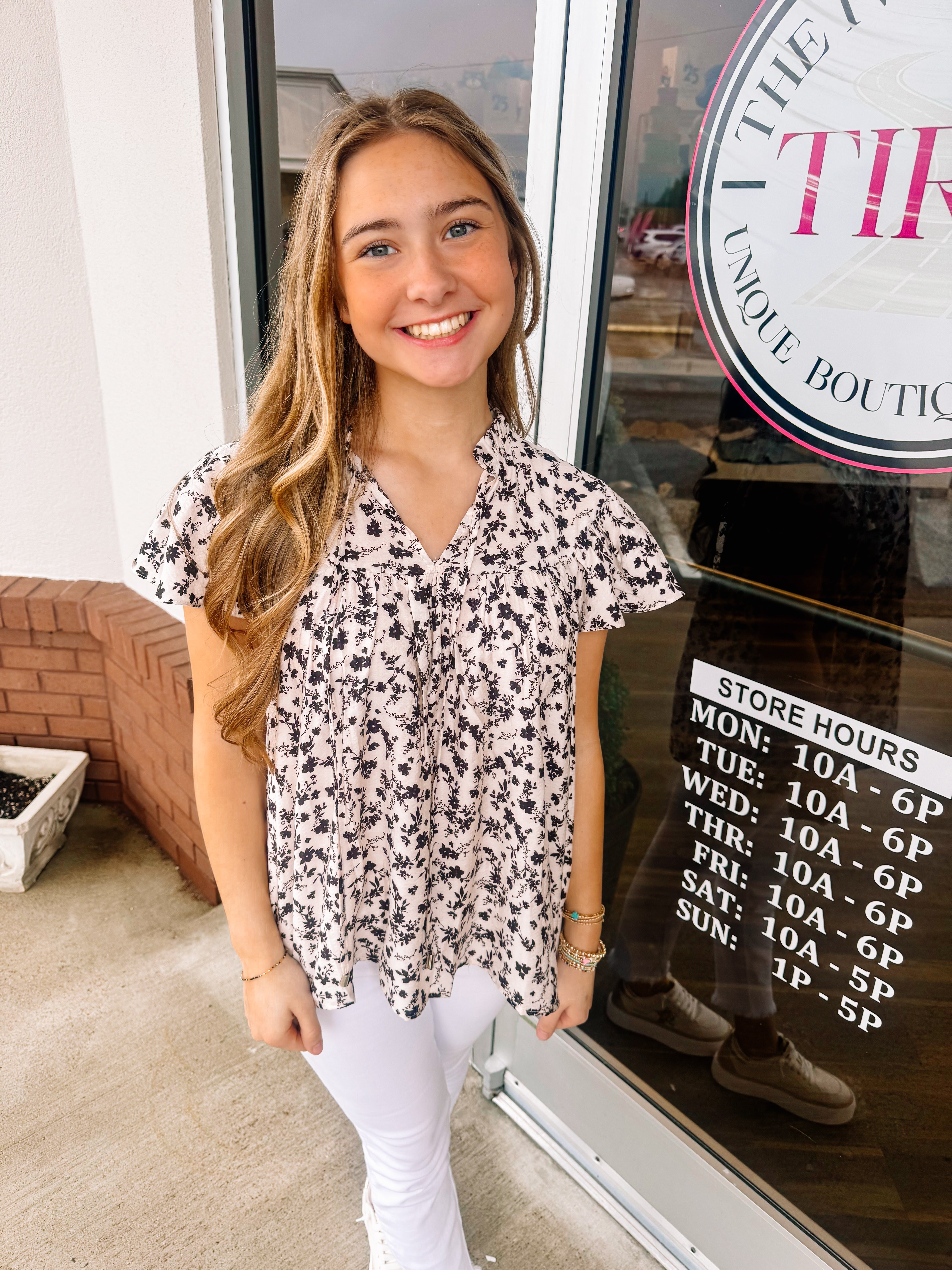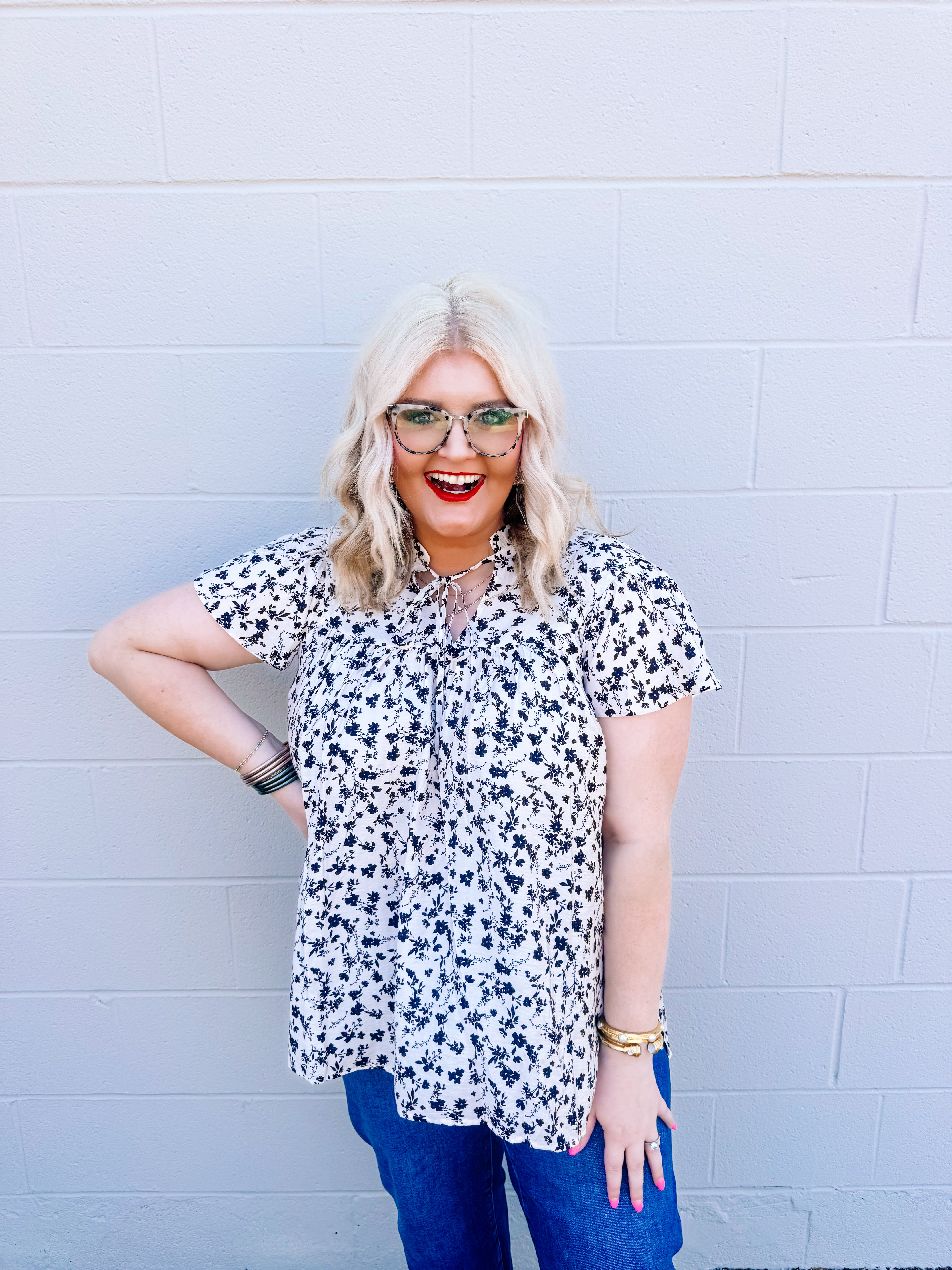 Welcome to the Ditsy Flower Top. This top has ruffle sleeves with a v-neck that features a ruffle neck band. It's white and black combo makes it a perfect top for work or a night on the town. This is a must for your closet.