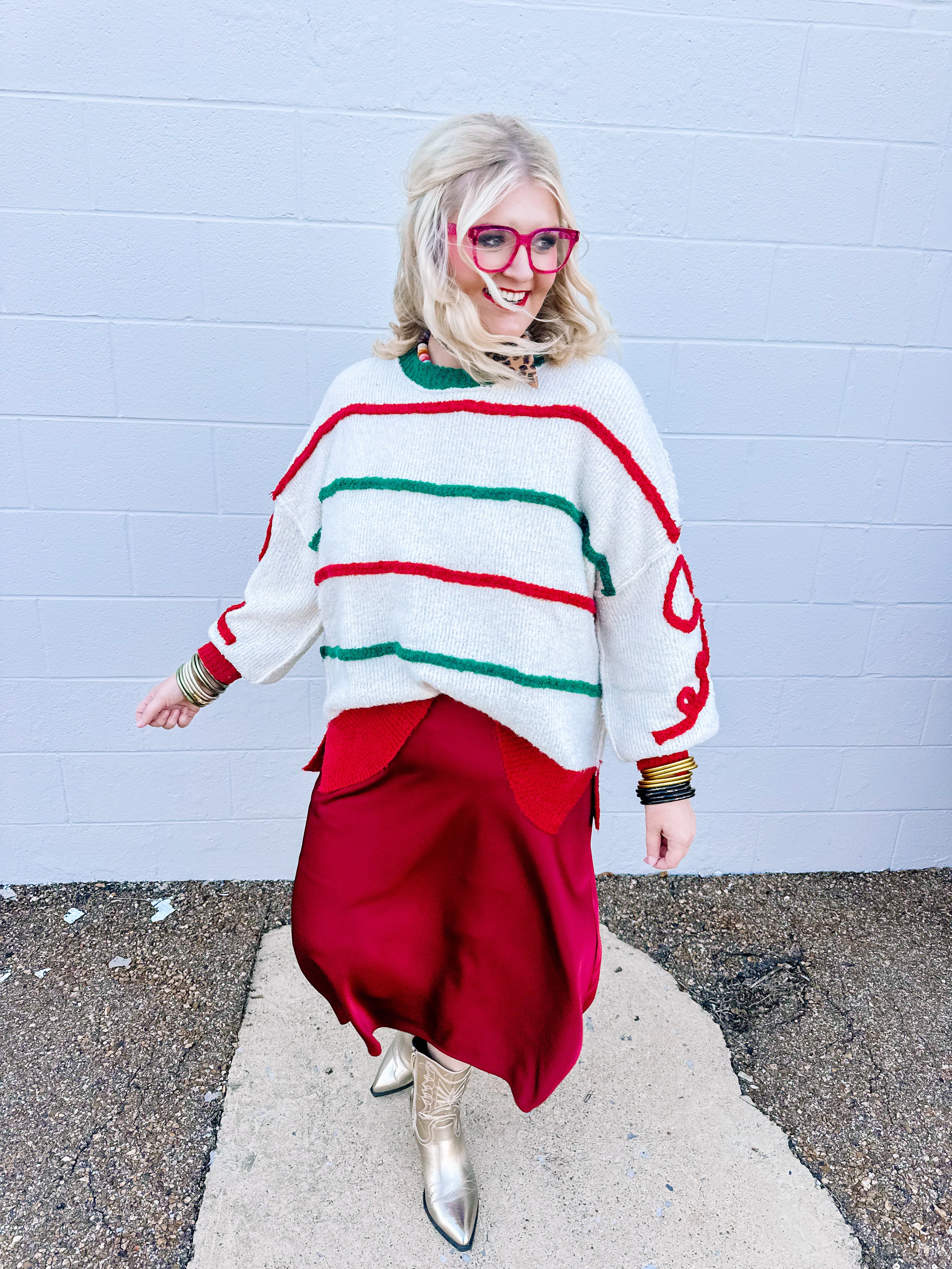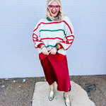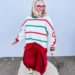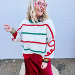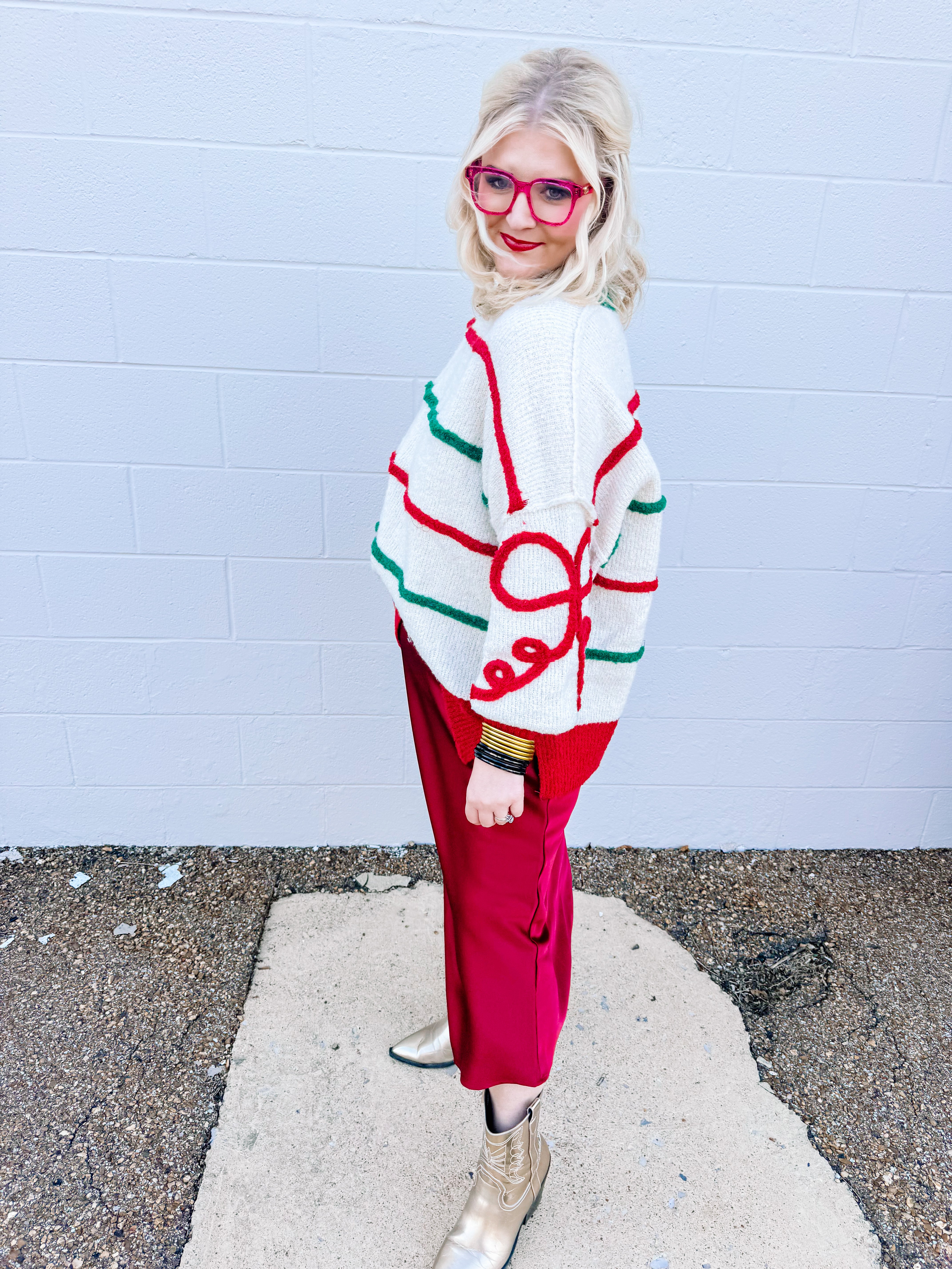 The Fantastic Fawn Striped Sweater combines timeless knit craftsmanship with subtle details for a refined look. Crafted in ivory, it features elegant red and green stripes that add a sophisticated pop of color. A delicate bow on the sleeve enhances its unique charm, making it perfect for layering or as a statement piece. This sweater blends comfort and style effortlessly, ideal for elevating your seasonal wardrobe.