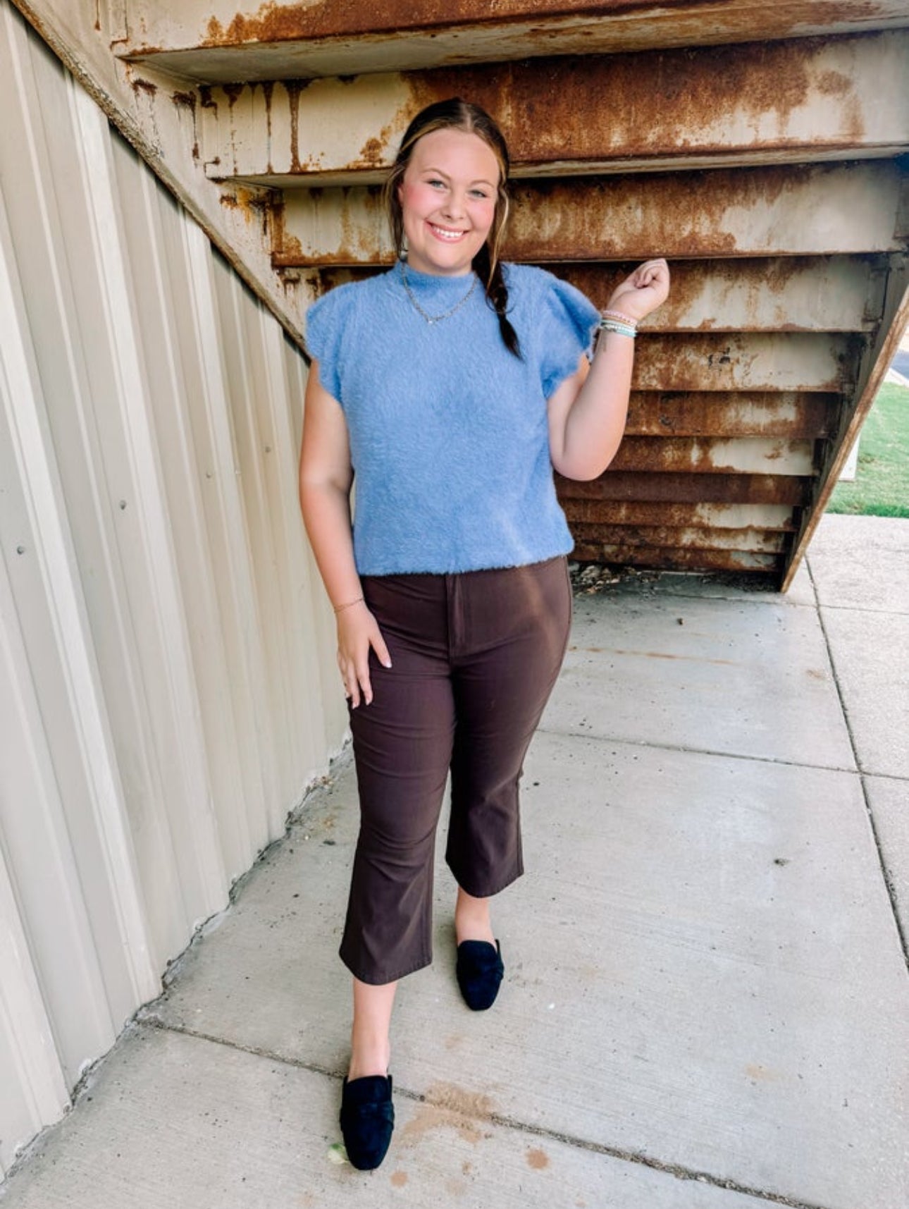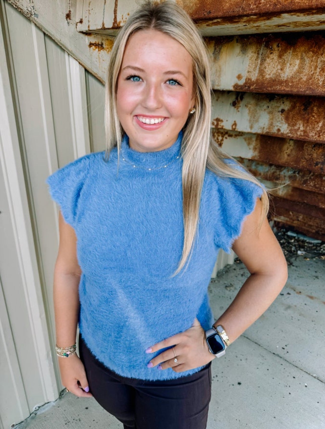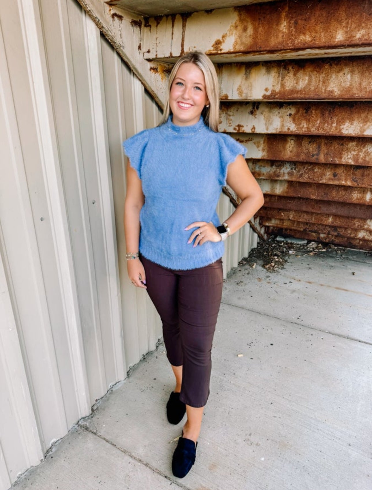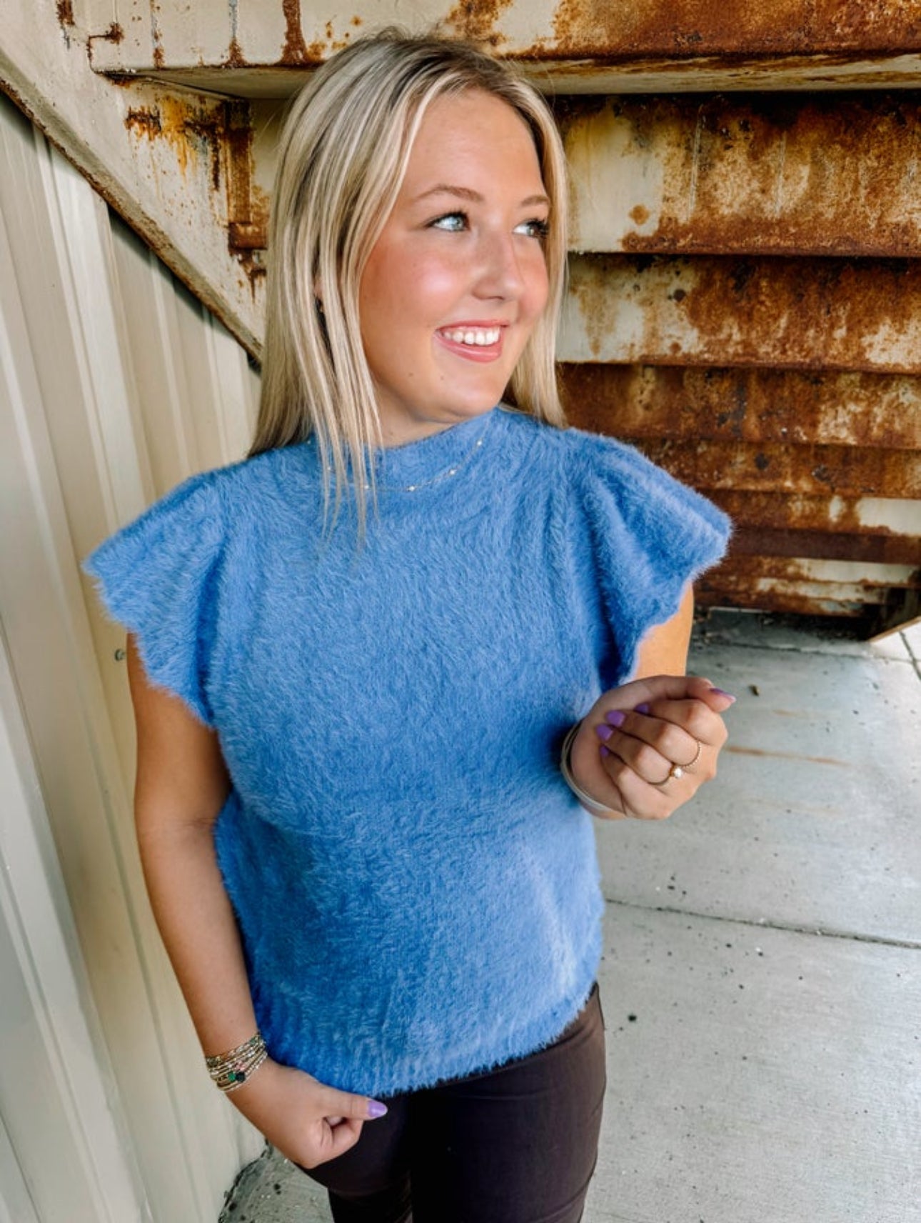 Ever so soft is this one! Seriously y'all, it feels like a baby! This fuzzy knit mock neck sweater with flutter sleeves is running true to size.
