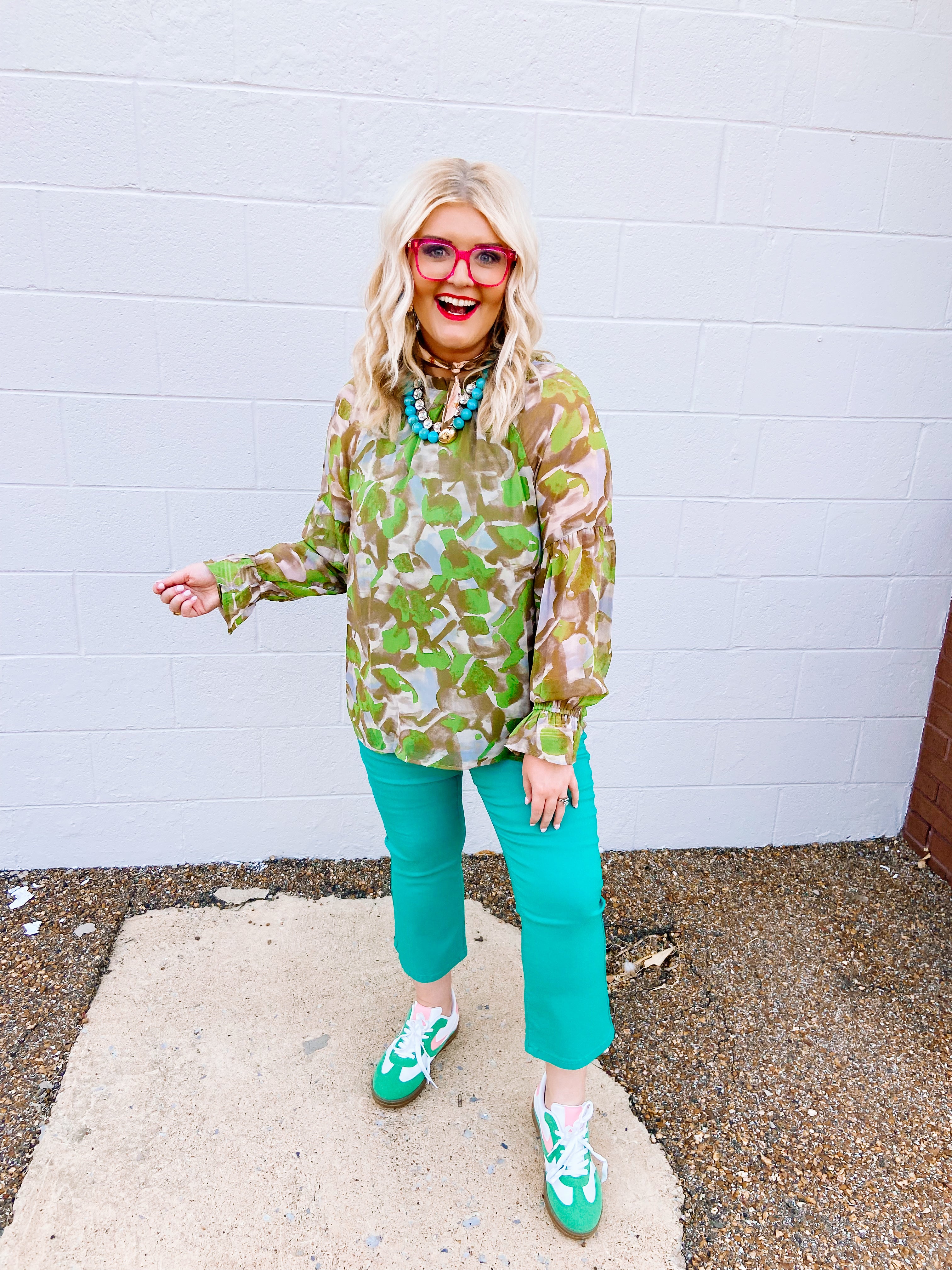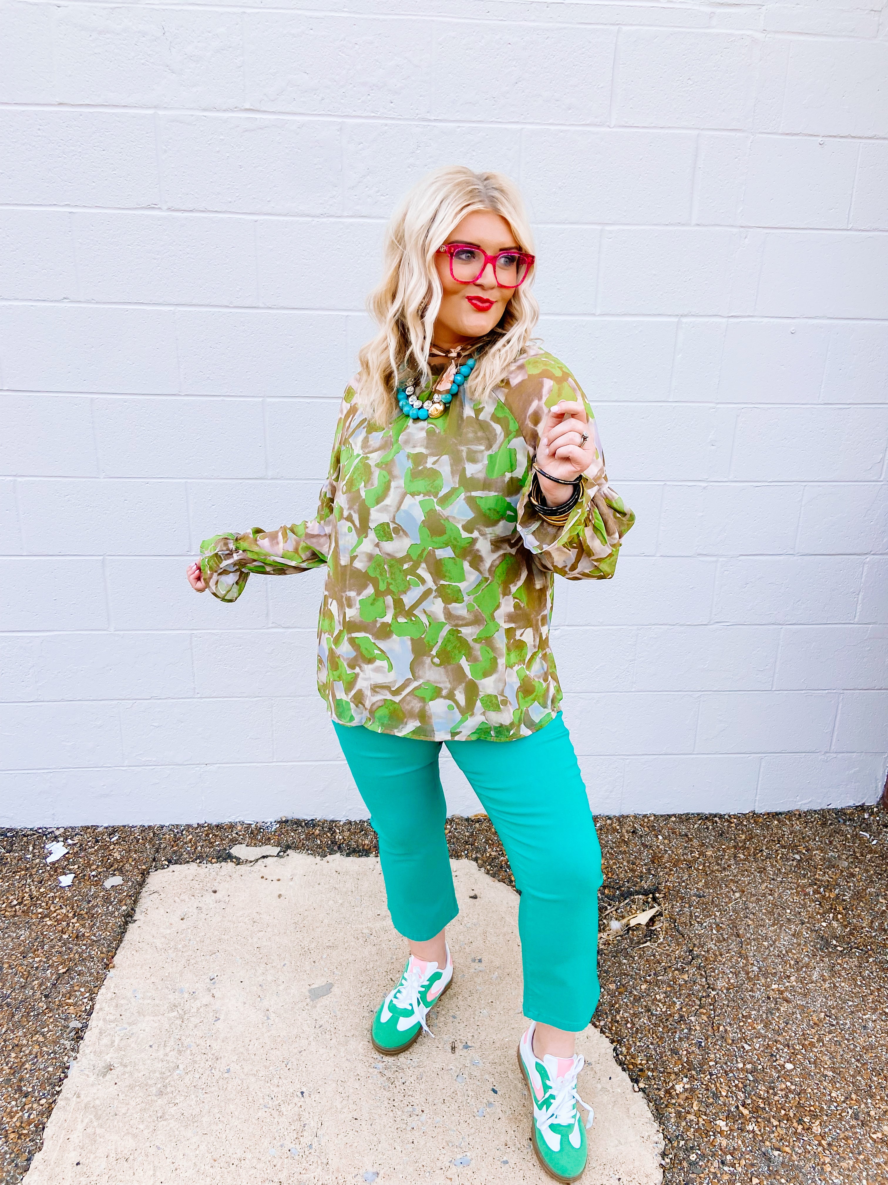 Available in two colors, green and black. This beautiful top is dressy with a semi- mock neck, beautiful flowy sleeves with a ruffle detail. This top can be dressed up or down but you will still look put together and stylish with your daily look.