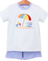 Get beach-ready with our Beach Umbrella Short Set! This knit shirt features a blue stripe trim and sweet beach scene applique. The set includes a pair of knit blue stripe shorts, which is the perfect match to the trim. Summer fun awaits!