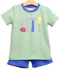 Unleash your summer style with this playful Tool Short Set. The green stripe shirt and blue shorts are perfect for warm weather adventures. Plus, the colorful tools applique adds a fun touch. Get ready for some serious fun in the sun.