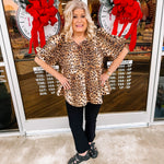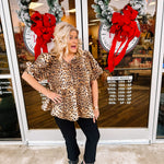 Leopard print short bubble sleeve pullover tiered top. Self tie at front neck. Unlined. Woven. Non-sheer. Lightweight.