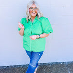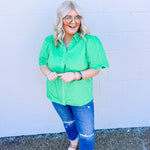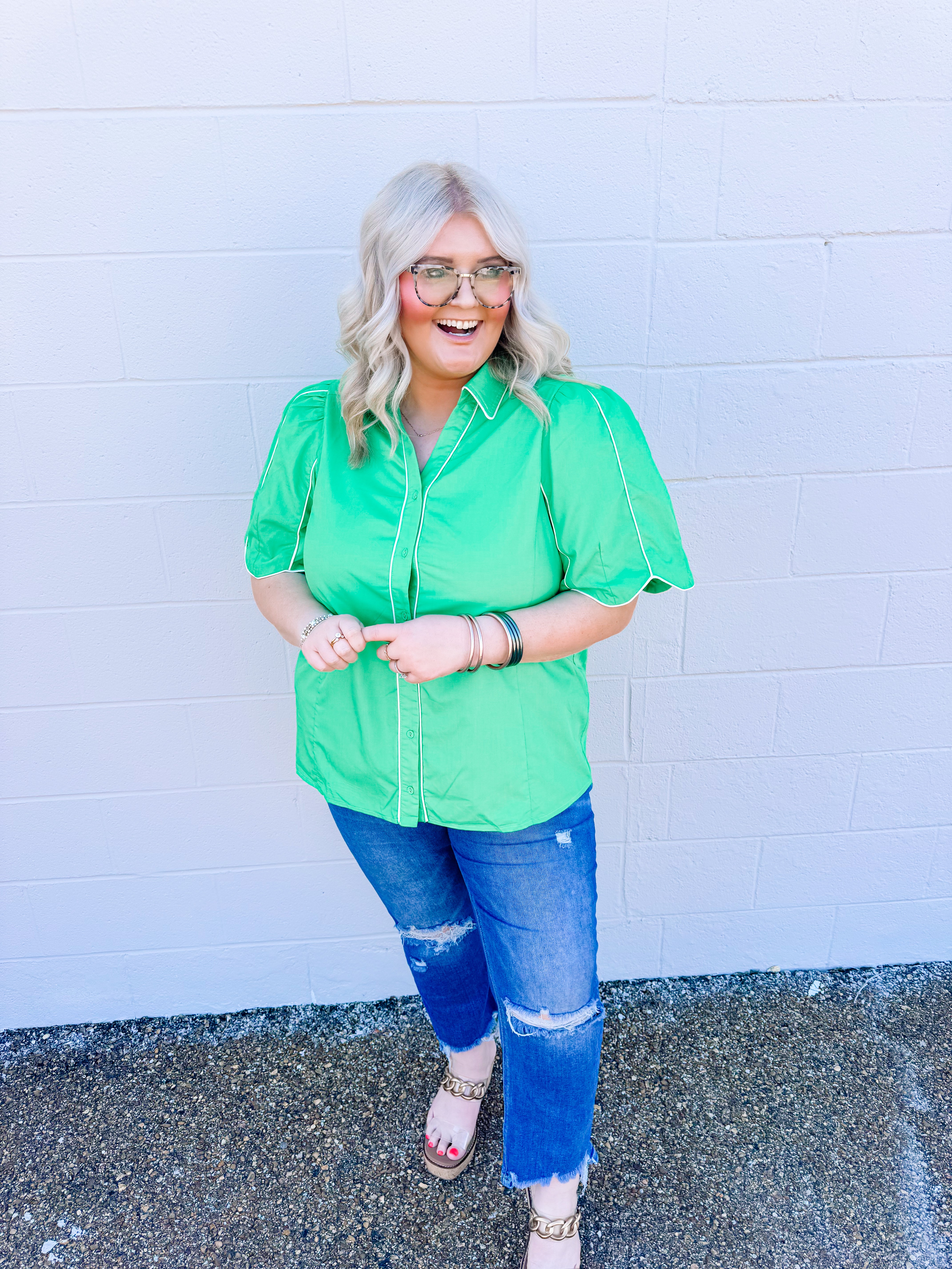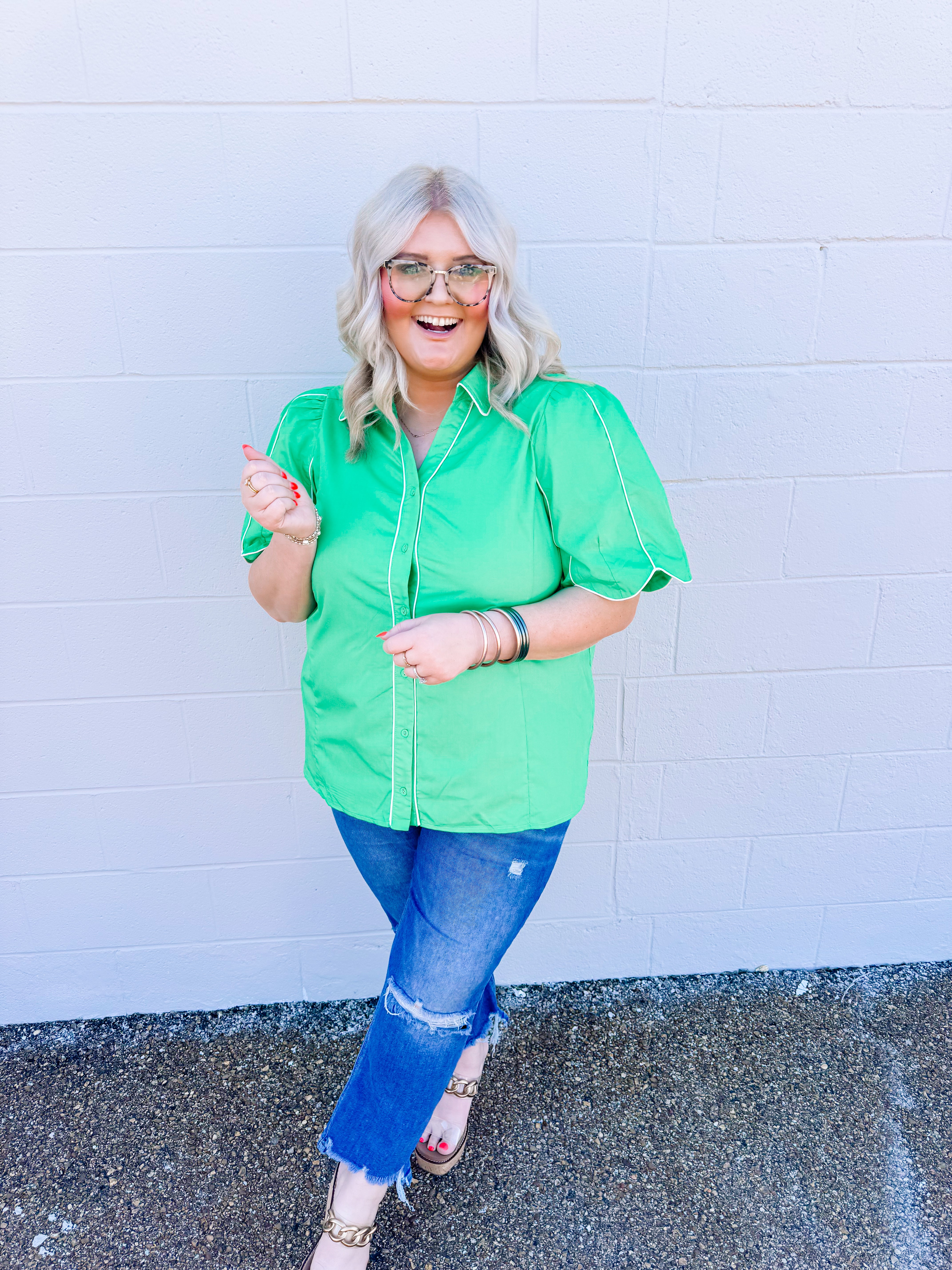 Welcome to The Lucky Charms Top! This top is great for your Spring and Summer wardrobe. It is also a great top to wear on St. Patrick's Day since it is solid green with white accents.