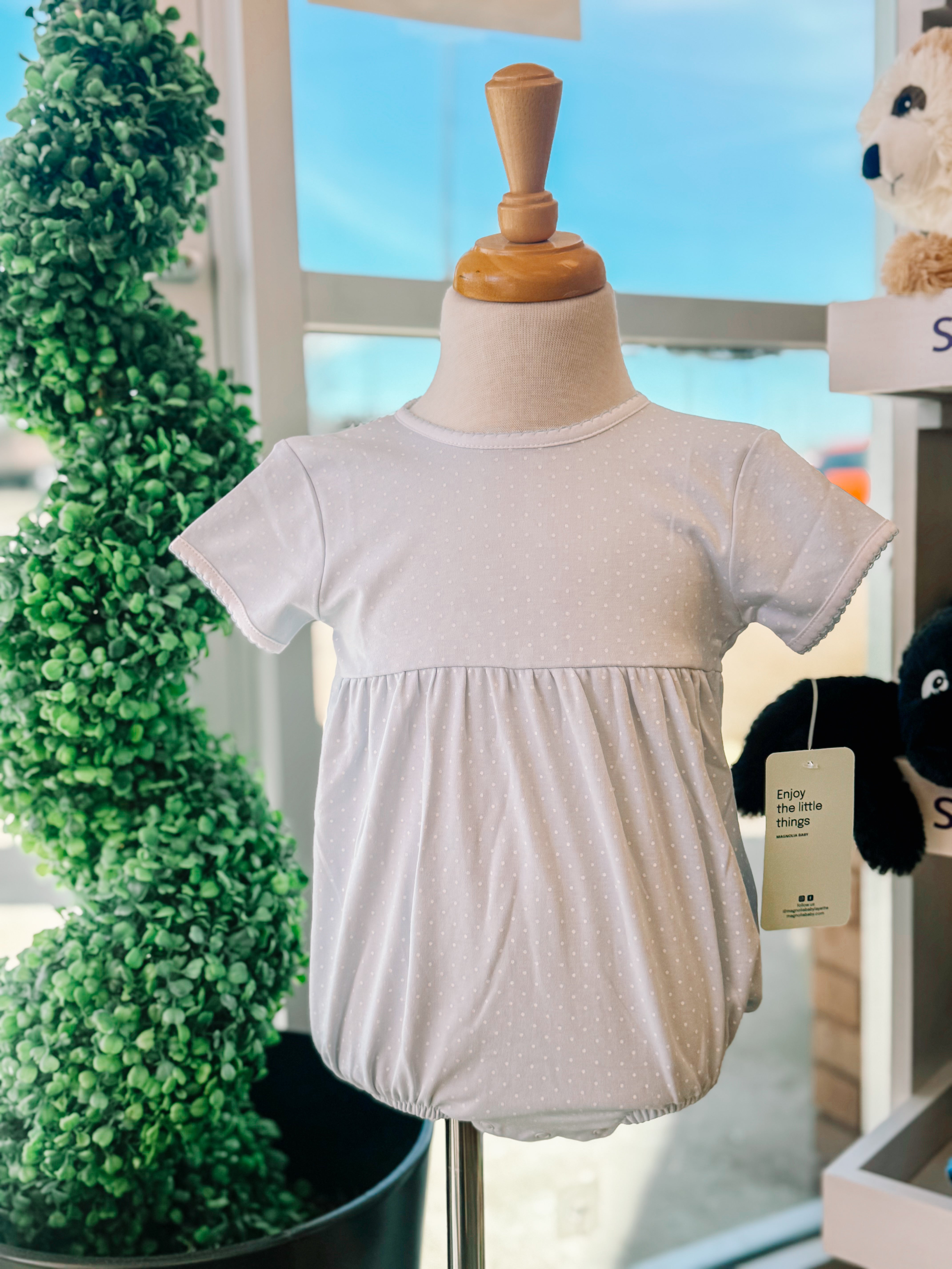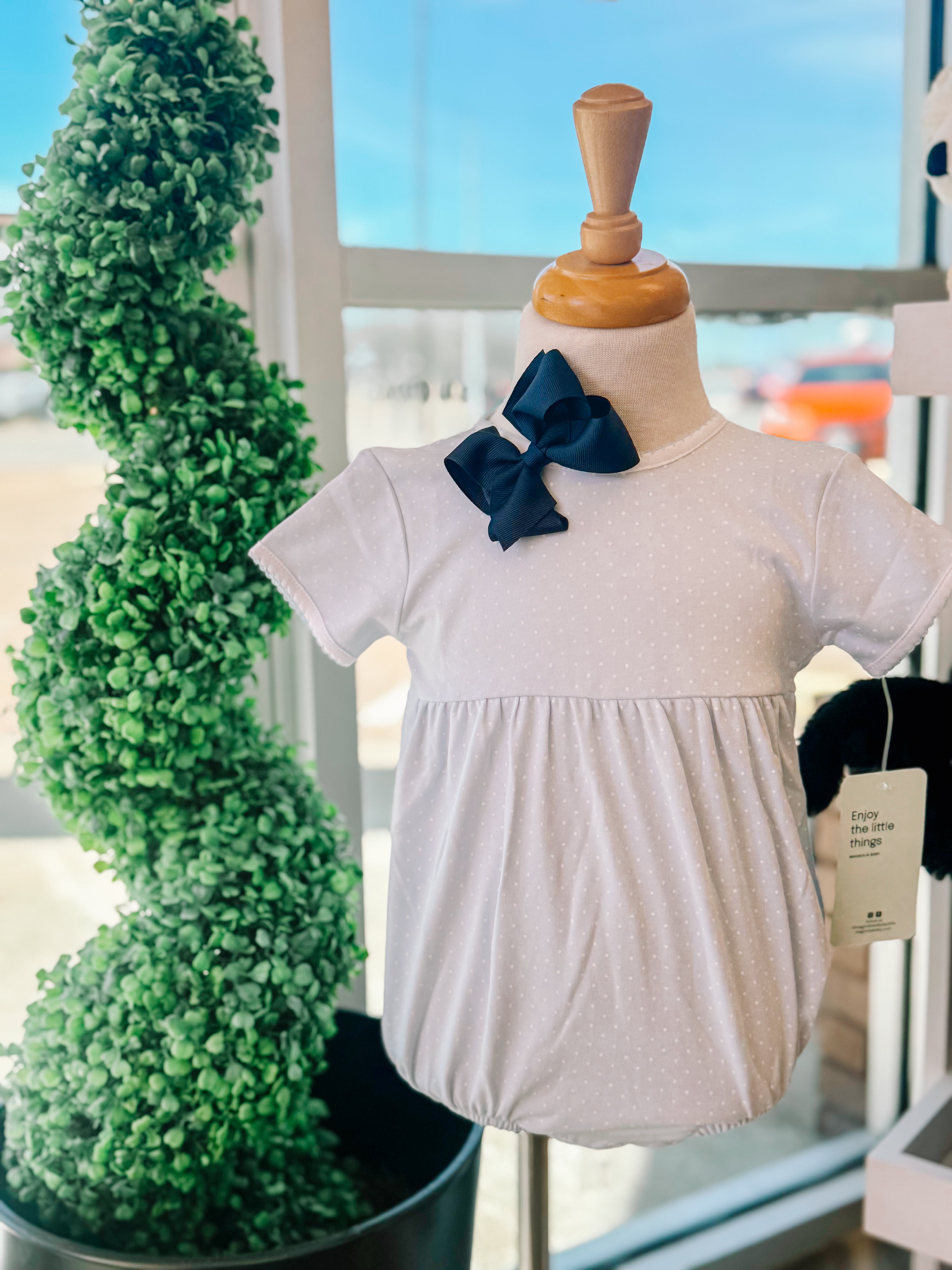 Magnolia Baby's Simply Sweet Bubble in light blue with white dots presents a sophisticated take on classic children's wear. The subtle polka dot pattern adds visual interest while maintaining the understated elegance Magnolia Baby is known for. Constructed from premium, breathable fabrics, this bubble ensures comfort throughout the day whether your child is playing or attending special events. The soft light blue base paired with crisp white accents creates a versatile piece that coordinates beautifully with coordinating separates. An investment in quality craftsmanship and timeless design.