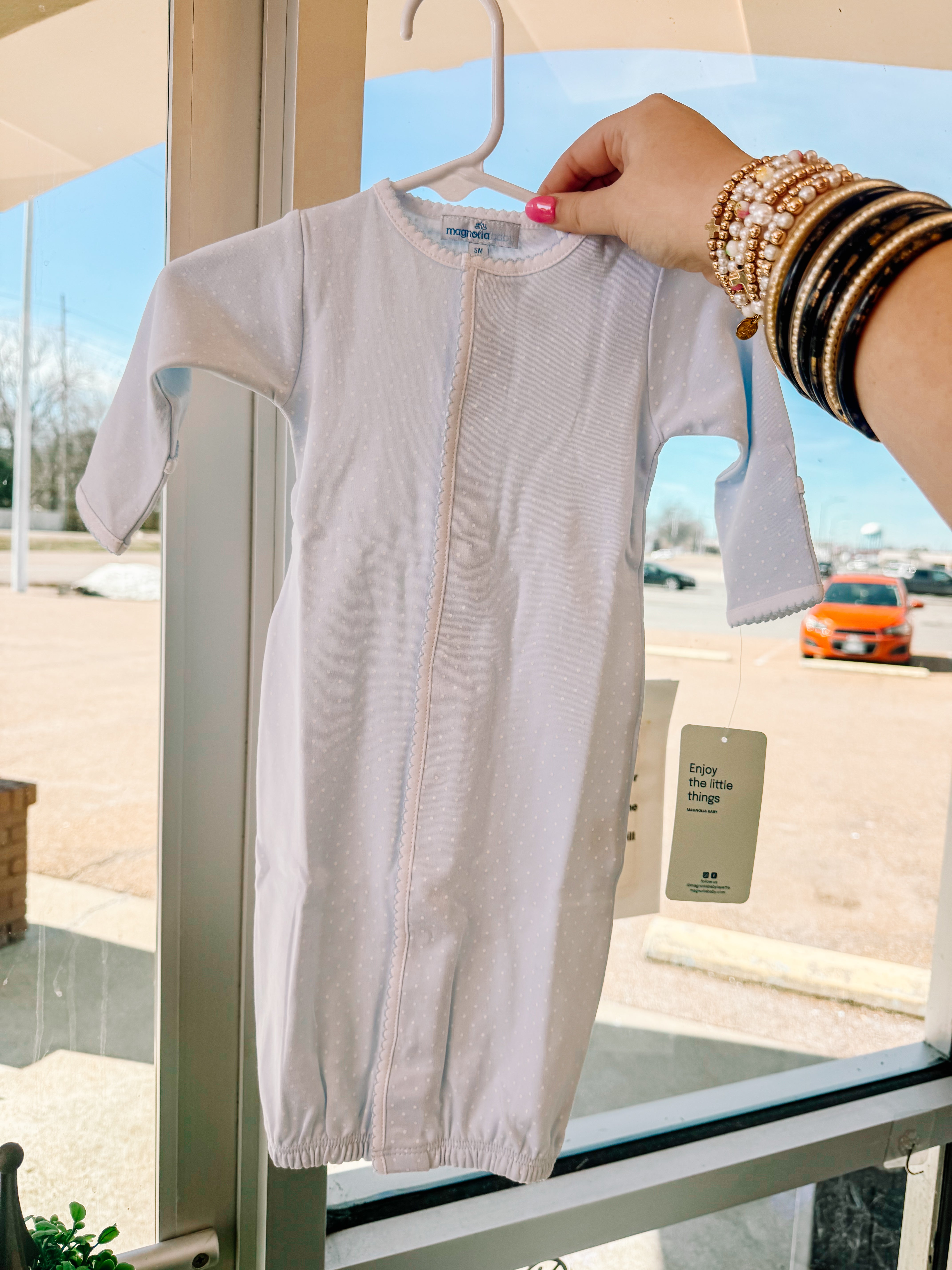 Magnolia Baby's Simply Sweet Converter offers versatile styling in a charming light blue with white dot pattern. This innovative piece transitions seamlessly between a traditional gown and a jon jon, providing two distinct looks from a single garment. The convertible design maximizes wardrobe flexibility for growing babies, while the soft color palette complements any nursery aesthetic. Crafted with Magnolia Baby's signature attention to detail, this converter is an essential addition to any infant's collection.